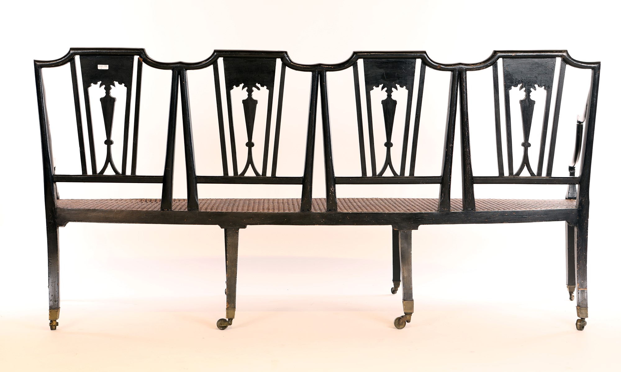 cm 91x195x60 cm 91x195x60 con schienale a giorno definito da quattro cartelle con vasi dipinti ricolmi di fiori; sedile in paglia di Vienna, gambe anteriori rastremate e decorate, posteriori sfuggenti poggianti su ruote