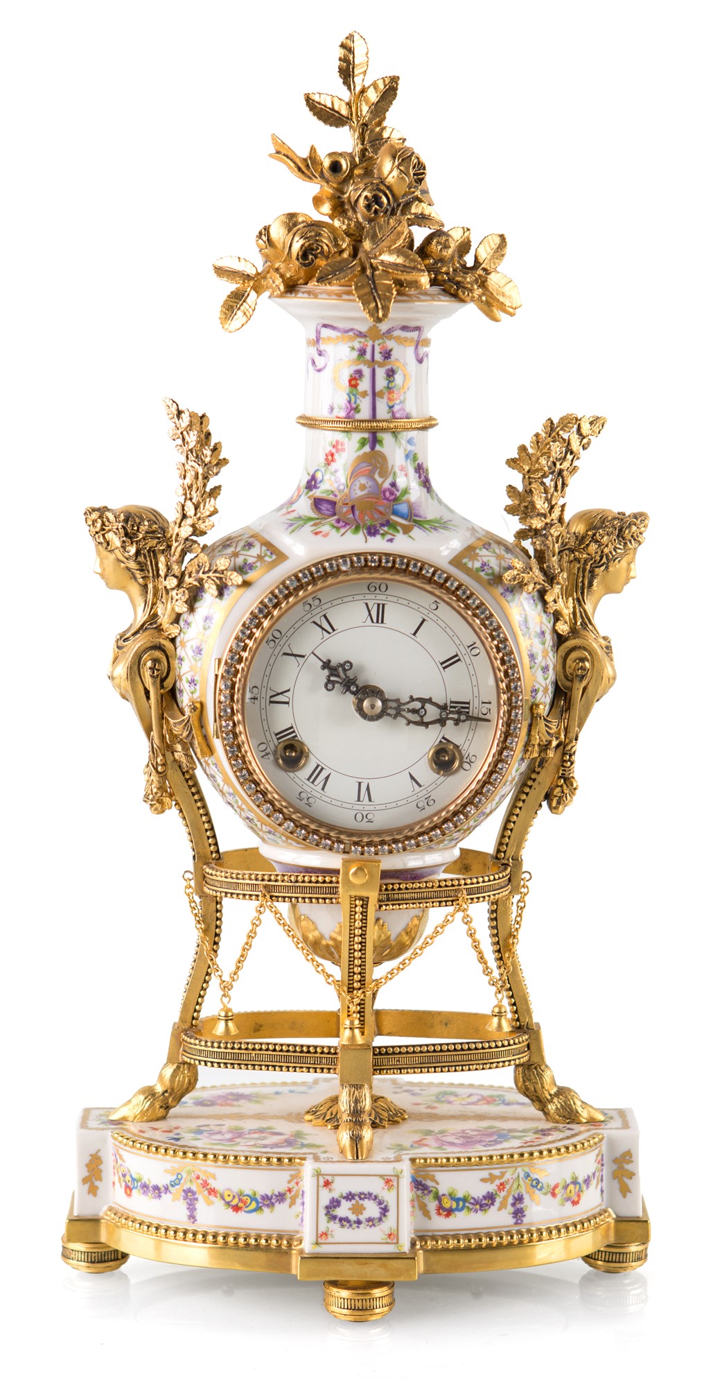 Pendola in porcellana con ricca ornamentazione in bronzo dorato