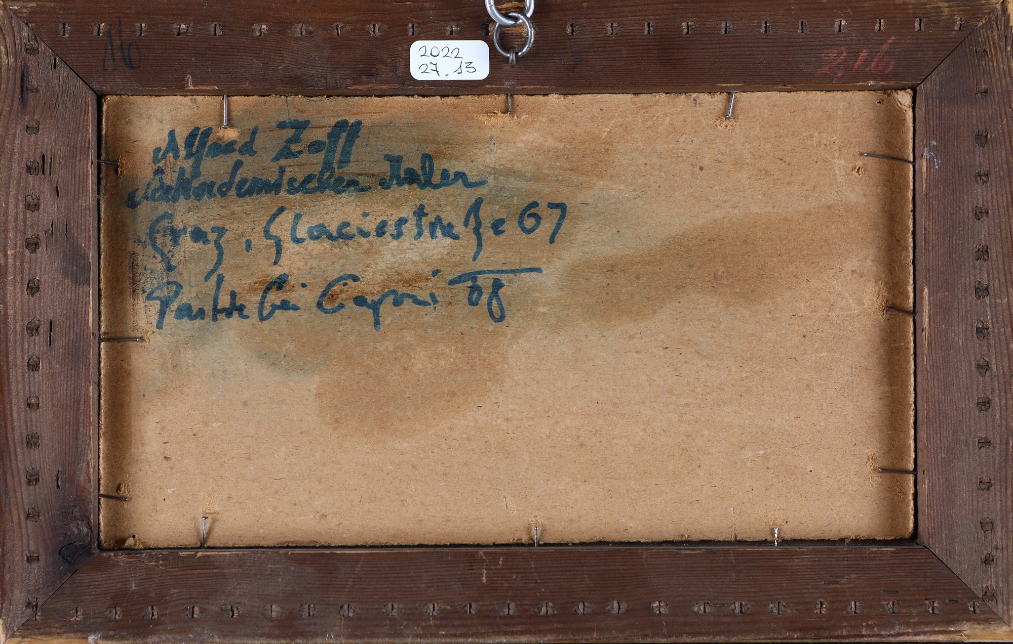 olio su cartone cm 13x25 - con la cornice: cm 21x32 olio su cartone cm 13x25 - con la cornice: cm 21x32 Iscrizione manoscritta al verso: Alfred Zoff