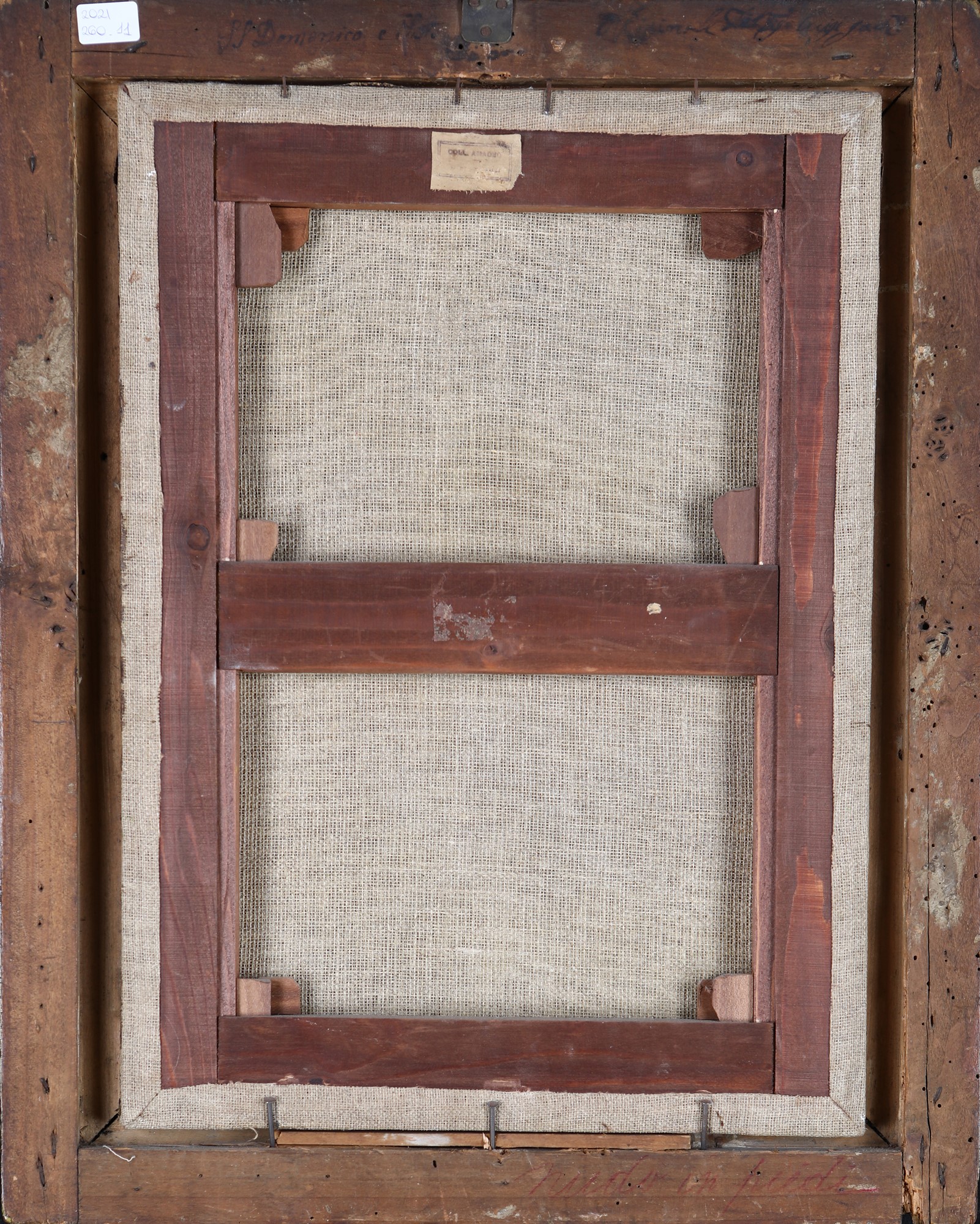olio su tela cm 47x34 - con la cornice: cm 55x45 olio su tela cm 47x34 - con la cornice: cm 55x45 Reca iscrizione ad inchiostro al verso lungo il profilo superiore della cornice. Cornice Salvator Rosa in legno dorato a più ordini di intaglio