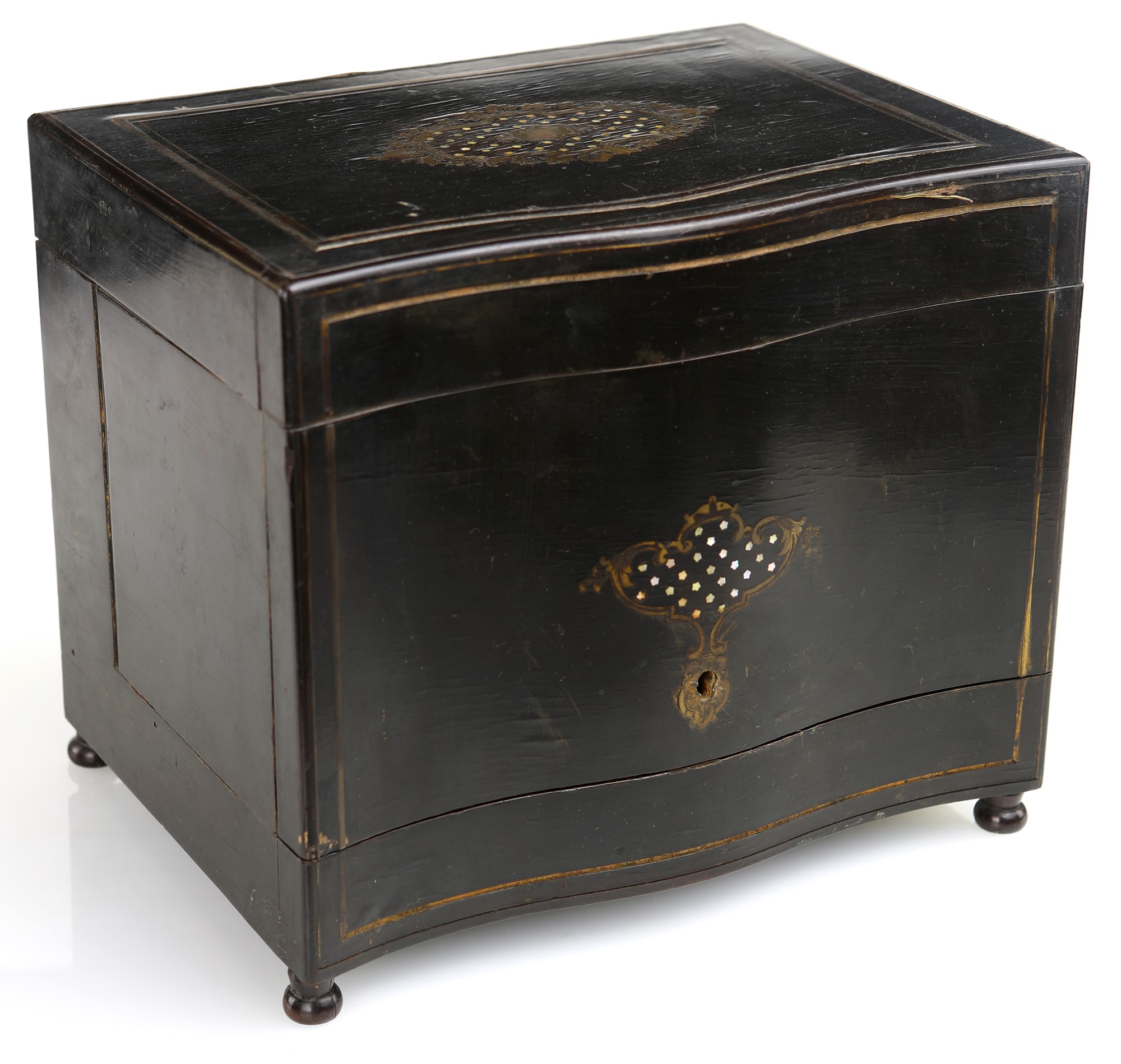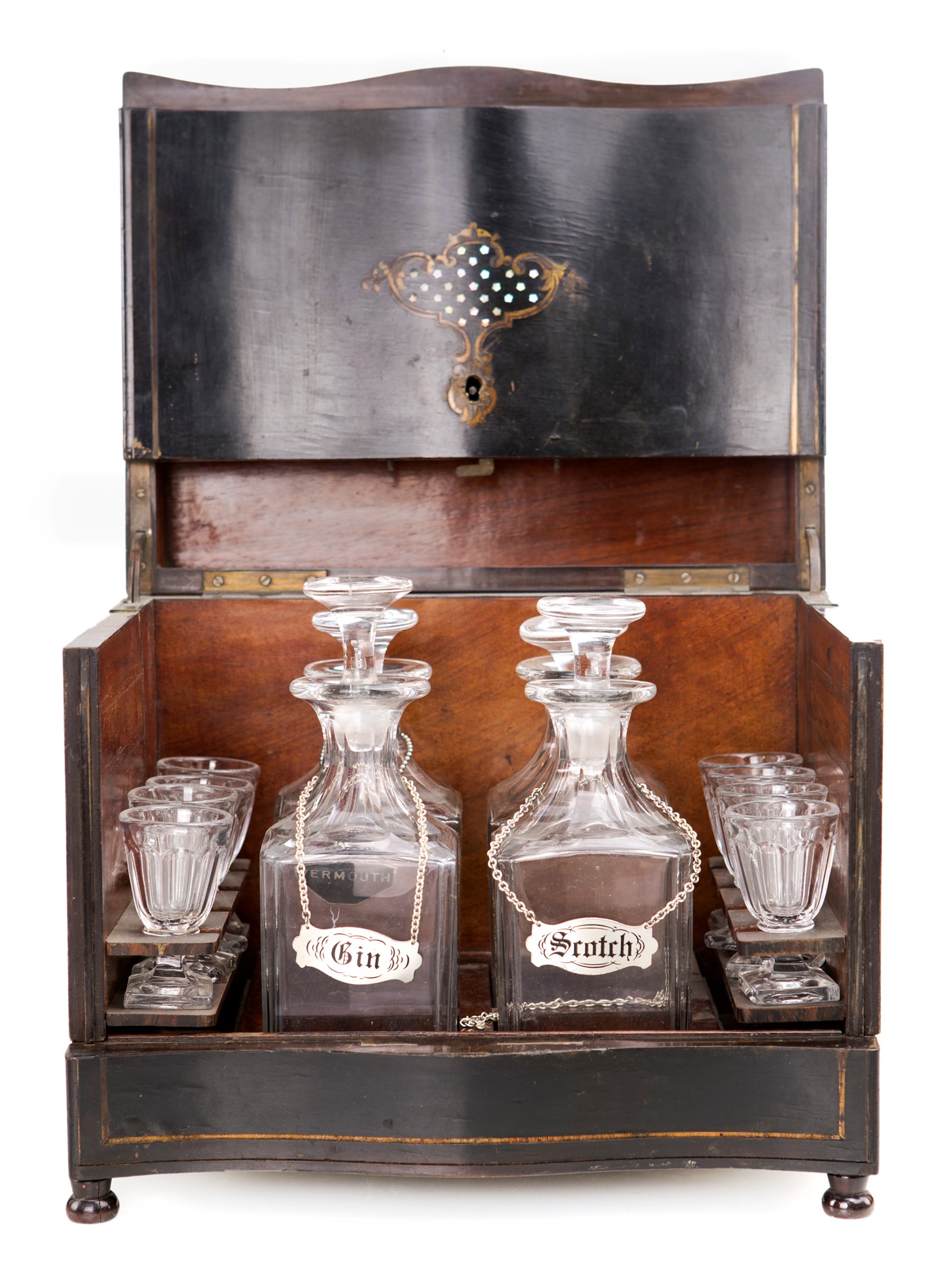 cm 26x30x22,5 cm 26x30x22,5 con filettature ed incrostazioni in rame dorato e piccoli inserti in madreperla; completo di bottiglie e bicchierini