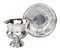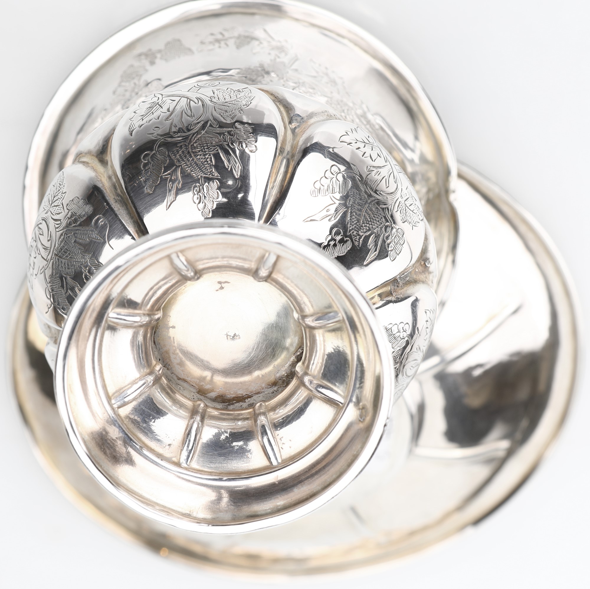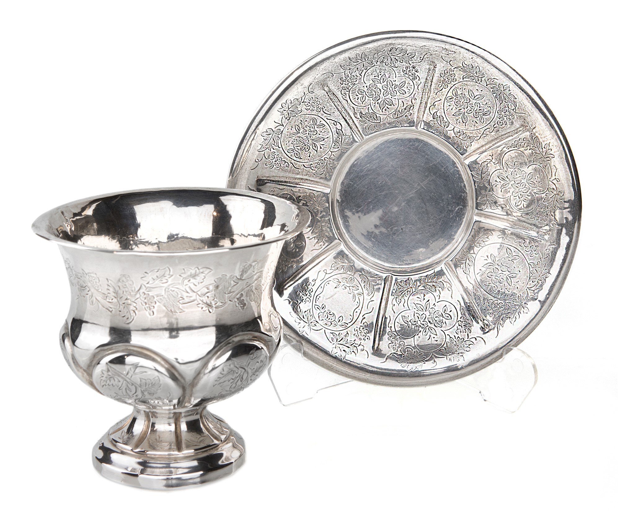 cm 10x11 - diametro del piatto: cm 16,3 - peso complessivo gr. 190 cm 10x11 - diametro del piatto: cm 16,3 - peso complessivo gr. 190 con decorazione incisa a tralci d'uva; il piatto reca otto composizioni floreali separate da sottili nervature