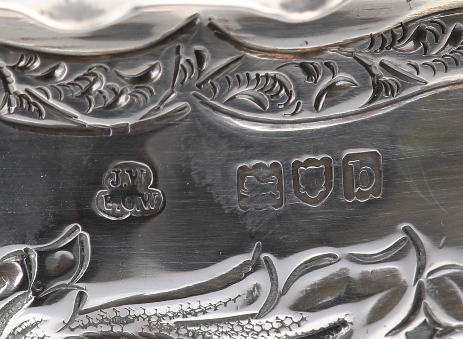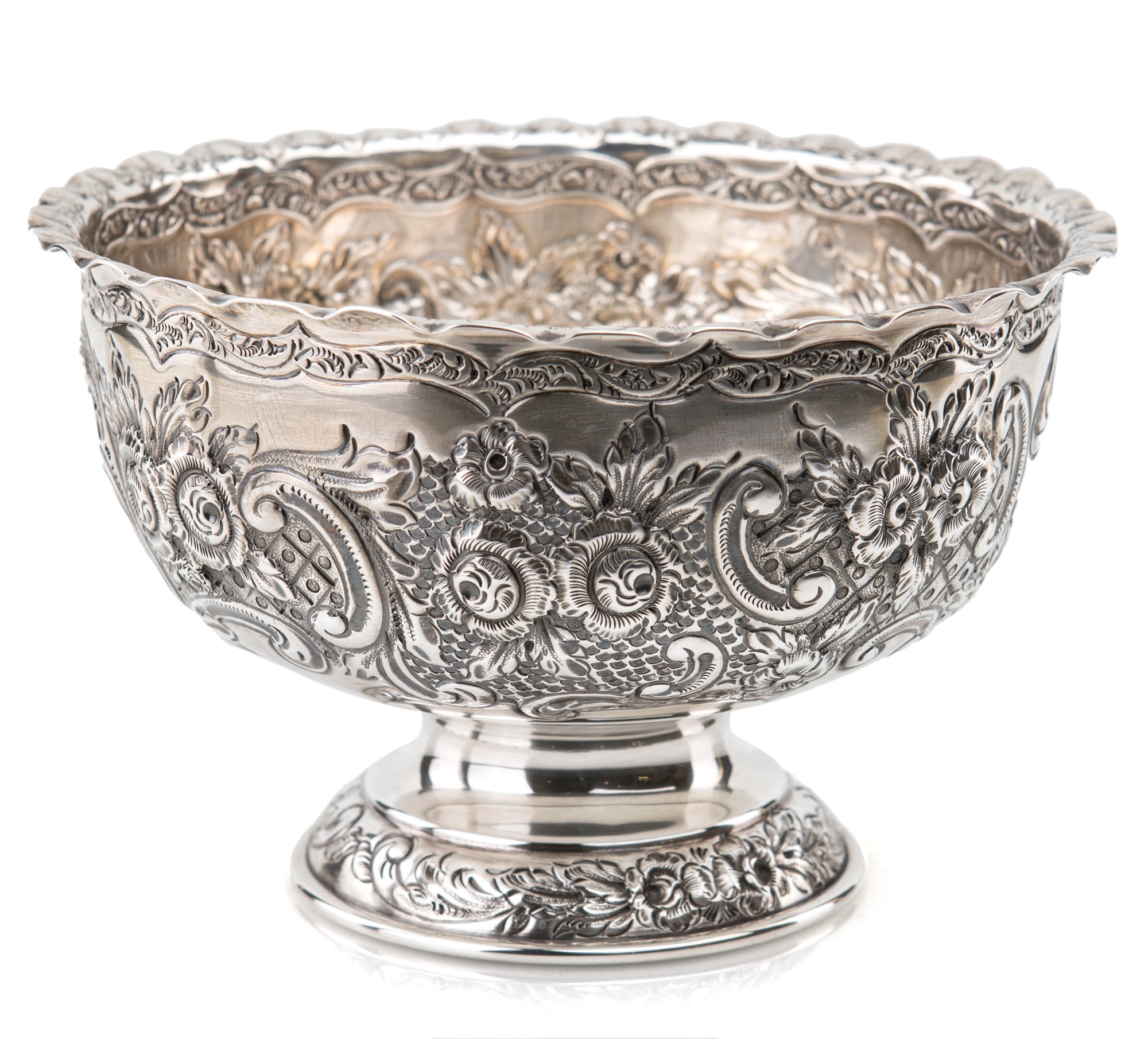 cm 12x18 - gr. 368 cm 12x18 - gr. 368 decorata con fiori e cartigli incisi e sbalzati; orlo ondulato, piede circolare