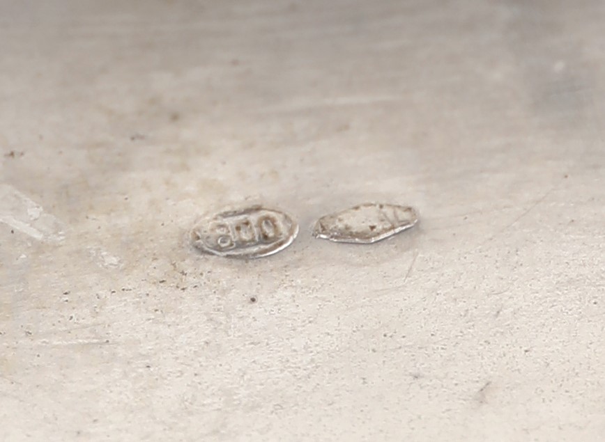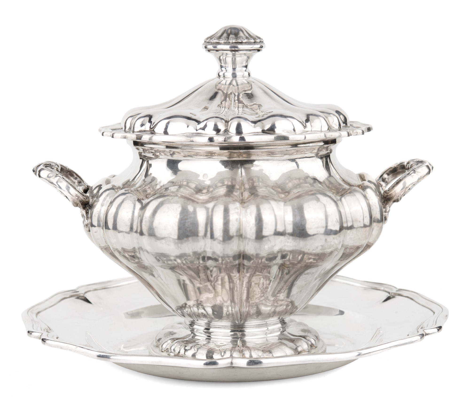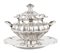 Zuppiera biansata in argento 800 con coperchio e piatto in argento 900