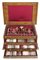 gr. 7222 escluse alcune posate da portata e i coltelli (24 da pasto e dodici da frutta) - cassetta cm 32x66x45 gr. 7222 escluse alcune posate da portata e i coltelli (24 da pasto e dodici da frutta) - cassetta cm 32x66x45 caratterizzato da stemma della Famiglia Dusmet finemente inciso sulle impugnature, con ventiquattro forchette ed altrettanti coltelli da pasto; completo di posate da pesce, cucchiaini da caffè, tè e gelato, mestolo da salsa, coltello e forchetta da arrosto, forchettone, posate da insalata con paletta in corno, mestolo e due posate da dolce. Entro cassetta in noce