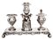 cm 15x21x10 - gr. cm 15x21x10 - gr. caratterizzato da tre contenitori a forma di vaso di cui il centrale sorretto da due figure contrapposte di grifo su piedistallo cilindrico; base rettangolare liscia con fascia sbalzata a volute, corolle e conchiglie; piedi a sfera