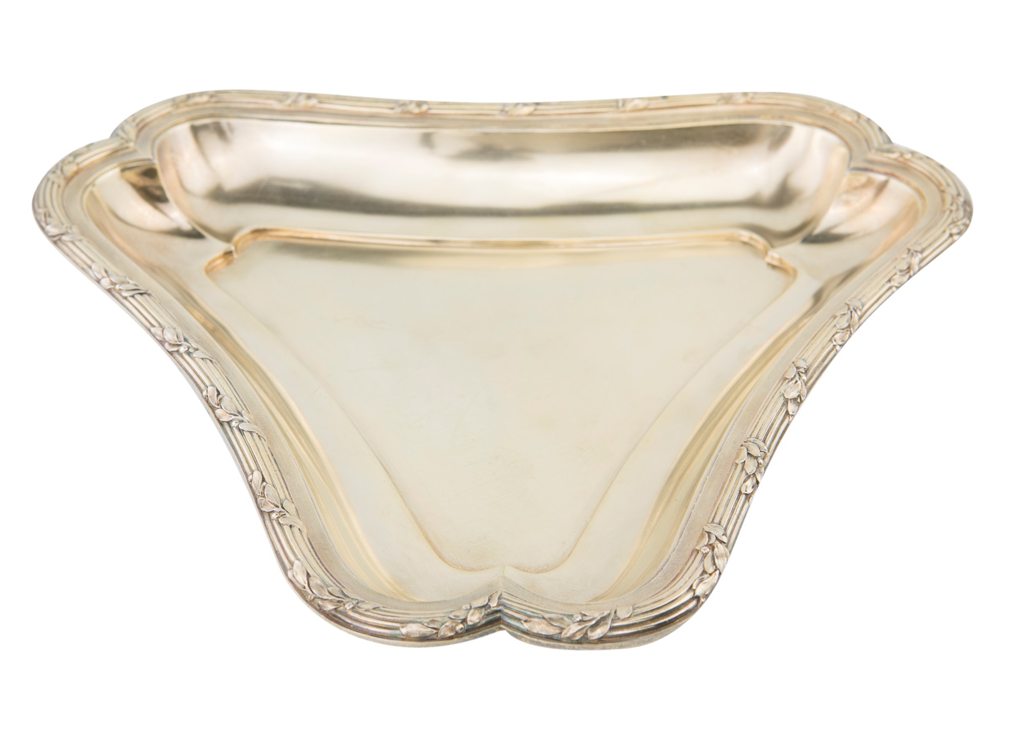 cm 3,3x24,5x27,5 - gr. 748 cm 3,3x24,5x27,5 - gr. 748 di forma triangolare con orlo percorso da verghe su cui si avvolgono rilievi vegetali. Bolli di titolo, della città di Parigi e di importazione in Inghilterra