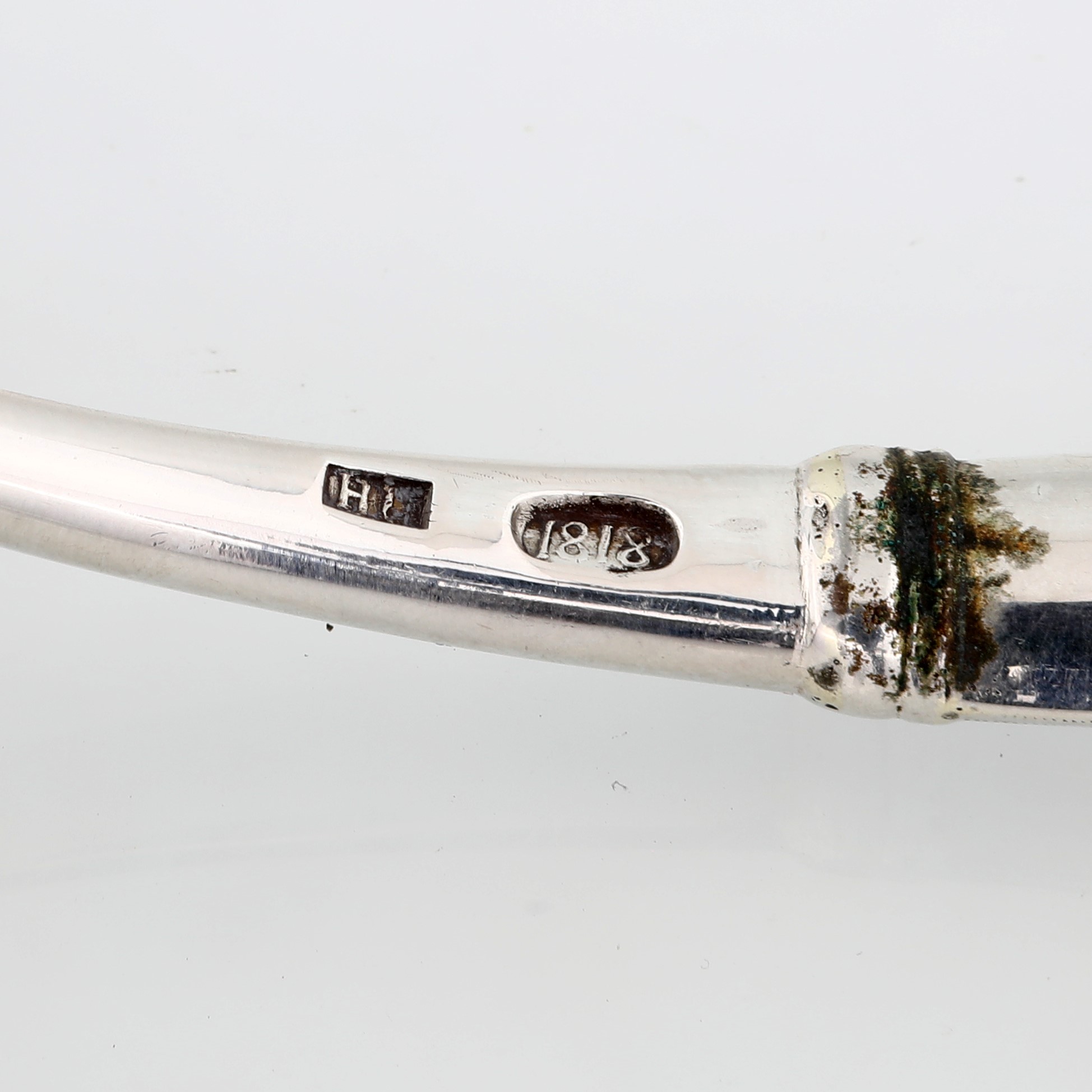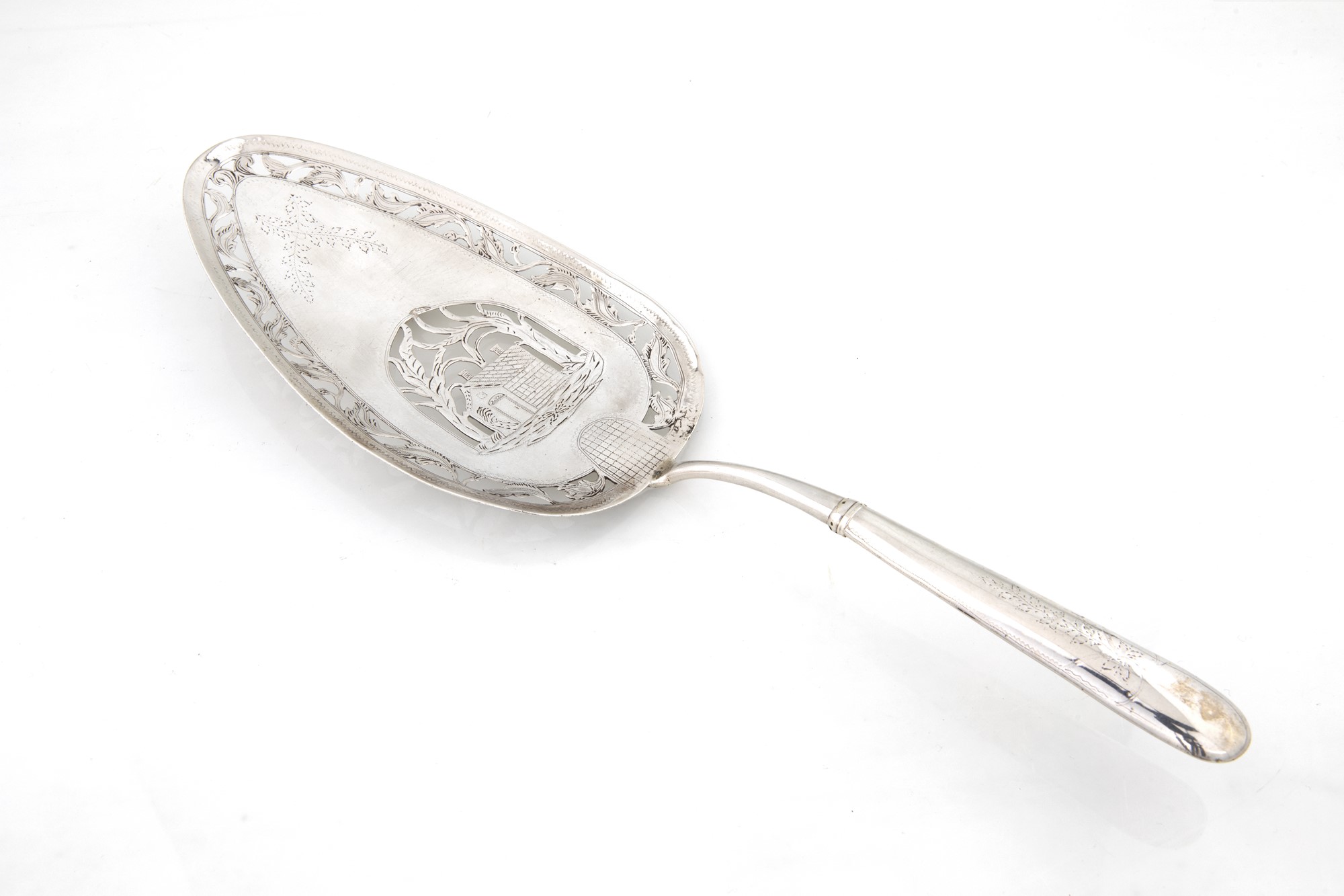 cm 31x9 - gr. 102 cm 31x9 - gr. 102 con paletta incisa lungo il profilo a motivi vegetali e decorata al centro da una casa affiancata da alberi. Reca bollo con data 1818 al verso dell'impugnatura e all'attaccatura del manico la data 1833 incisa
