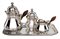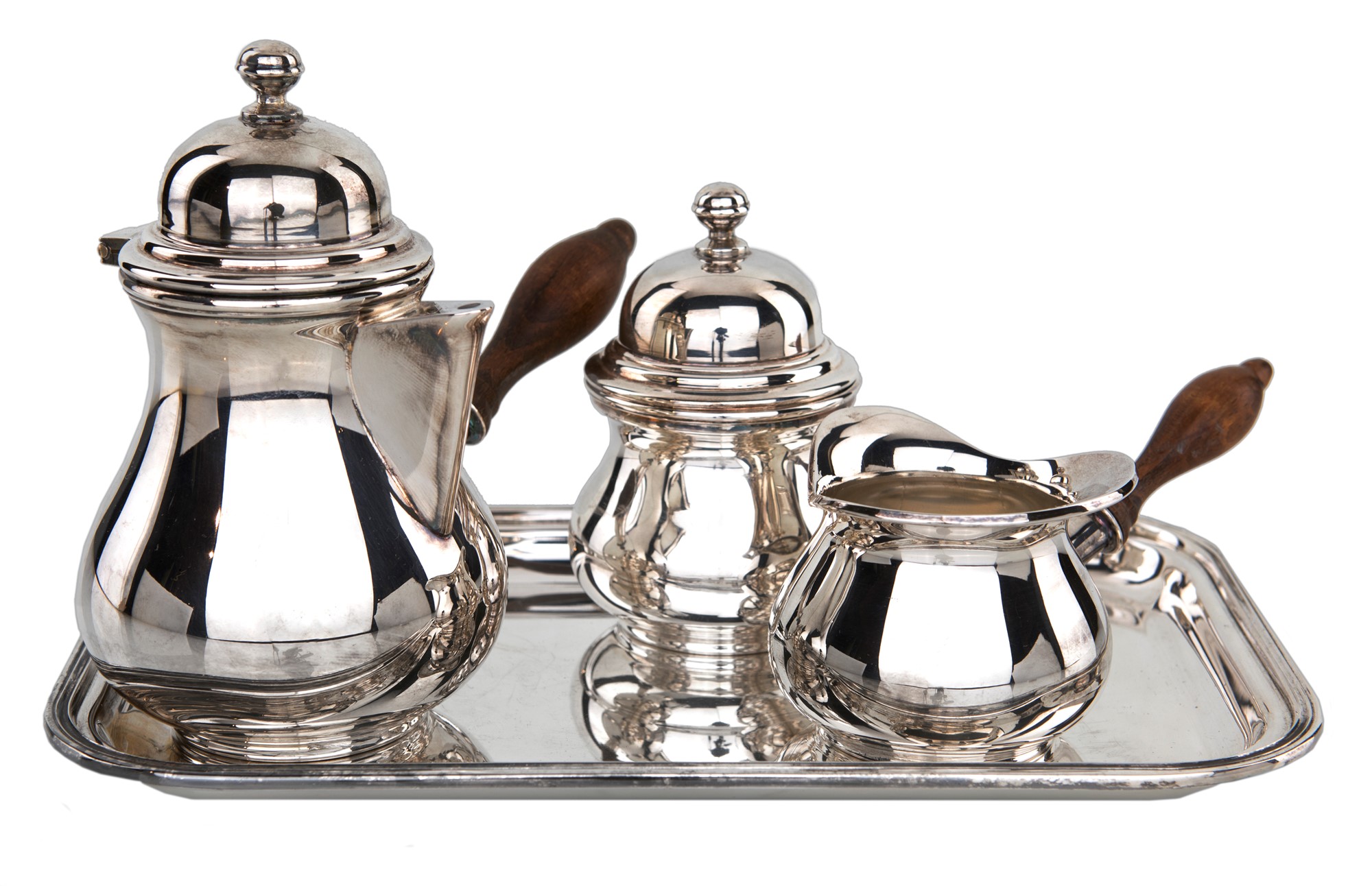 misure diverse; il vassoio cm 24,5x15,5 - peso complessivo lordo gr. 656 misure diverse; il vassoio cm 24,5x15,5 - peso complessivo lordo gr. 656 composto da caffettiera, lattiera e zuccheriera; le prime due con manico traverso in legno, la terza con coperchio a cupolino. Il vassoio di forma rettangolare ad angoli stondati