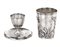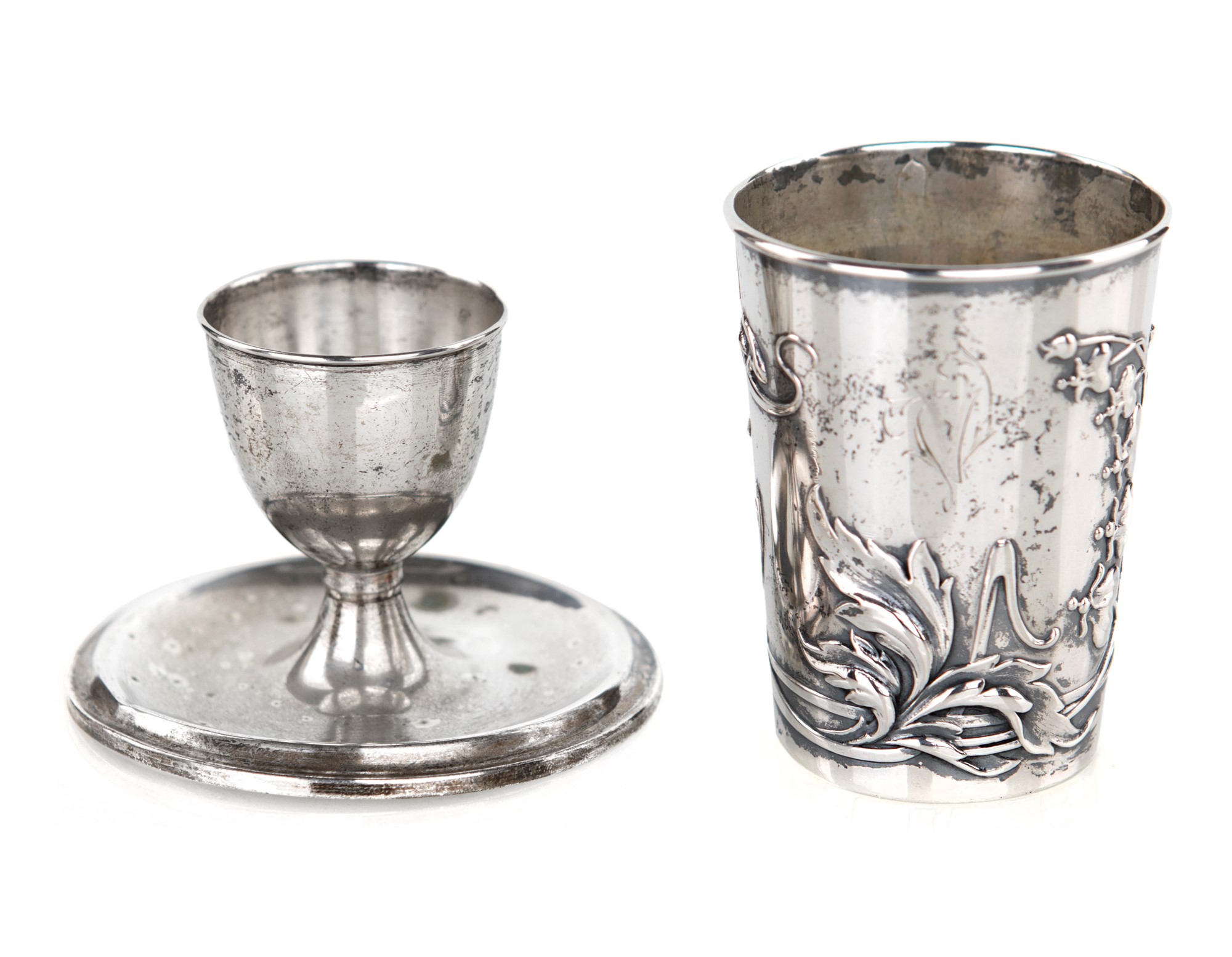 cm 7,3x5,5 e cm 5,5x8 rispettivamente - peso complessivo gr. 62 cm 7,3x5,5 e cm 5,5x8 rispettivamente - peso complessivo gr. 62 il primo di forma cilindrica decorato a sbalzo da un tralcio fiorito di gusto art Decò ad includere iniziale V incisa; il portauovo dalla caratteristica forma su piattino circolare