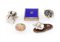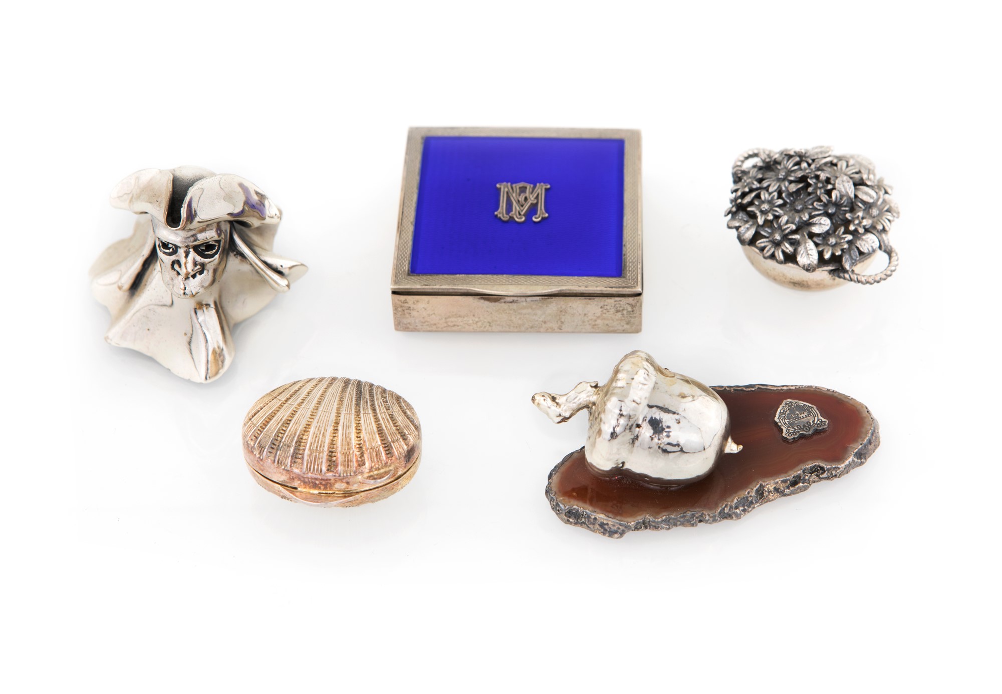 misure diverse - gr. 140 ca. misure diverse - gr. 140 ca. portapillole quadrangolare con coperchio in smalto blu con monogramma, argentiere G. Ciardetti Firenze, miniatura a forma di cesto con fiori di Giovanni Raspini, ghianda di Mario Buccellati su base in corniola, portapillole a forma di conchiglia, bauta veneziana di Medusa-Oro