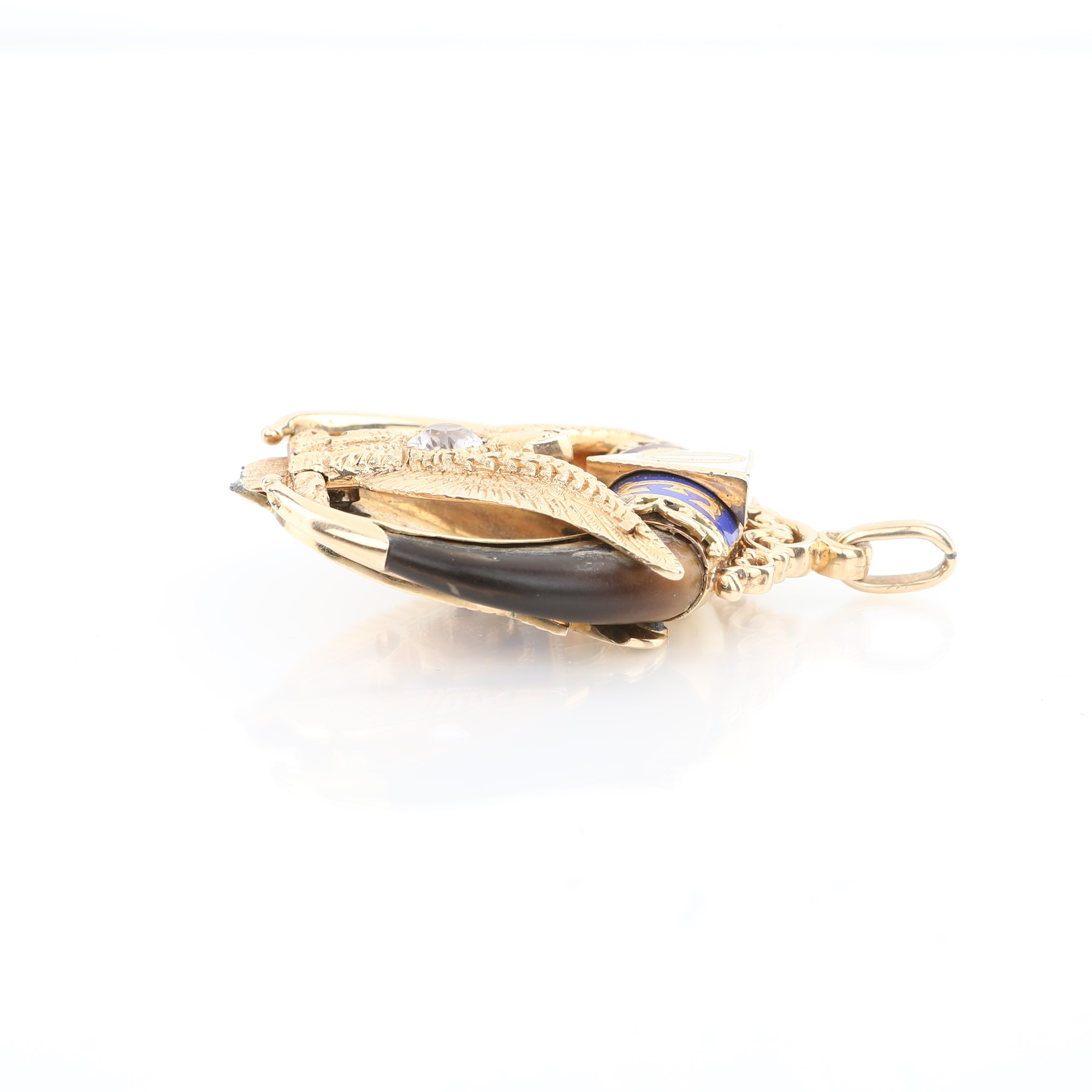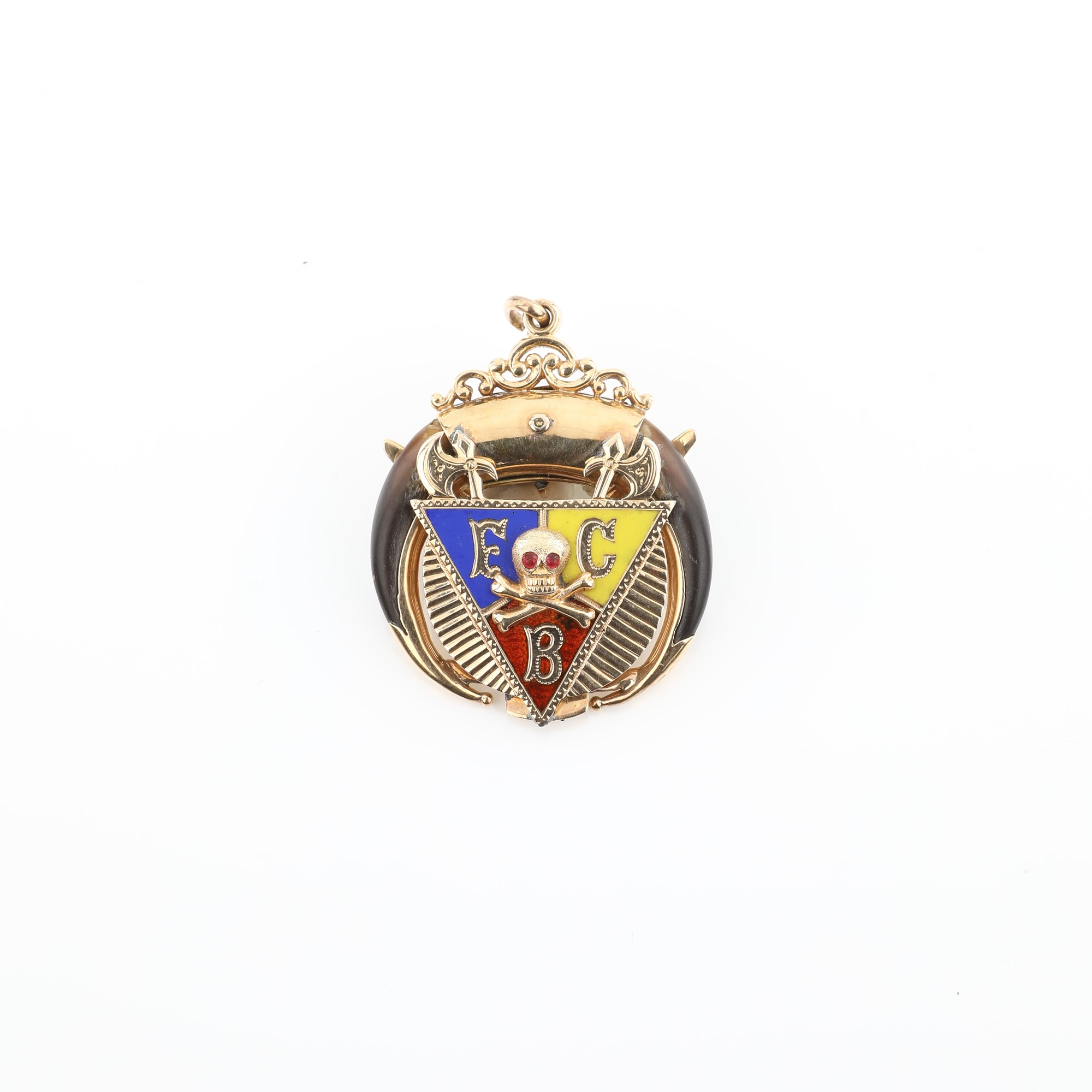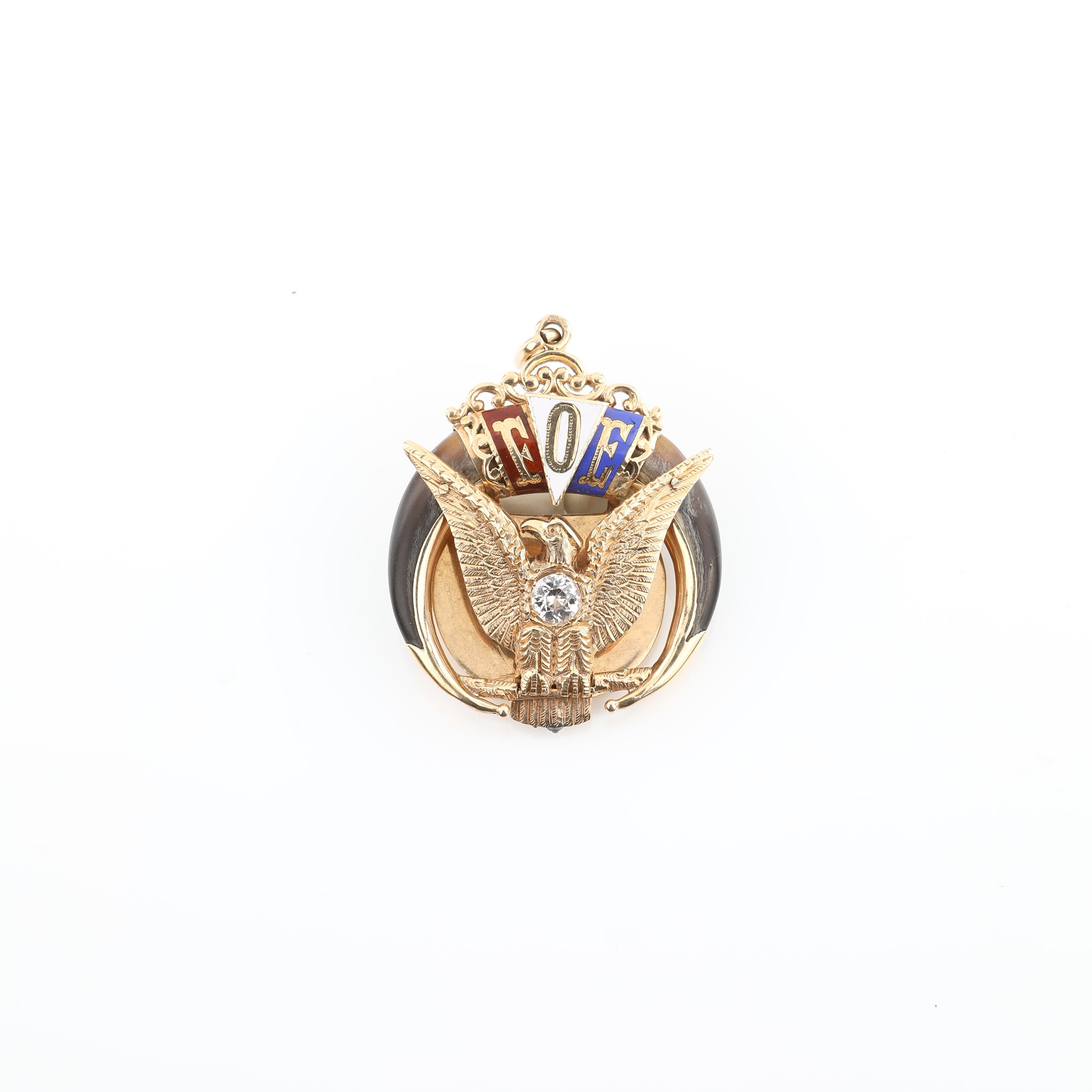 cm 5,5x3,5 - gr. 30 cm 5,5x3,5 - gr. 30 di forma circolare definita da piccoli corni affrontati, caratterizzato da un lato da un'aquila ad ali spiegate centrata da zircone sormontata dalle lettere F.O.E.; dall'altro lato triangolo capovolto con teschio e lettere F.C.B.