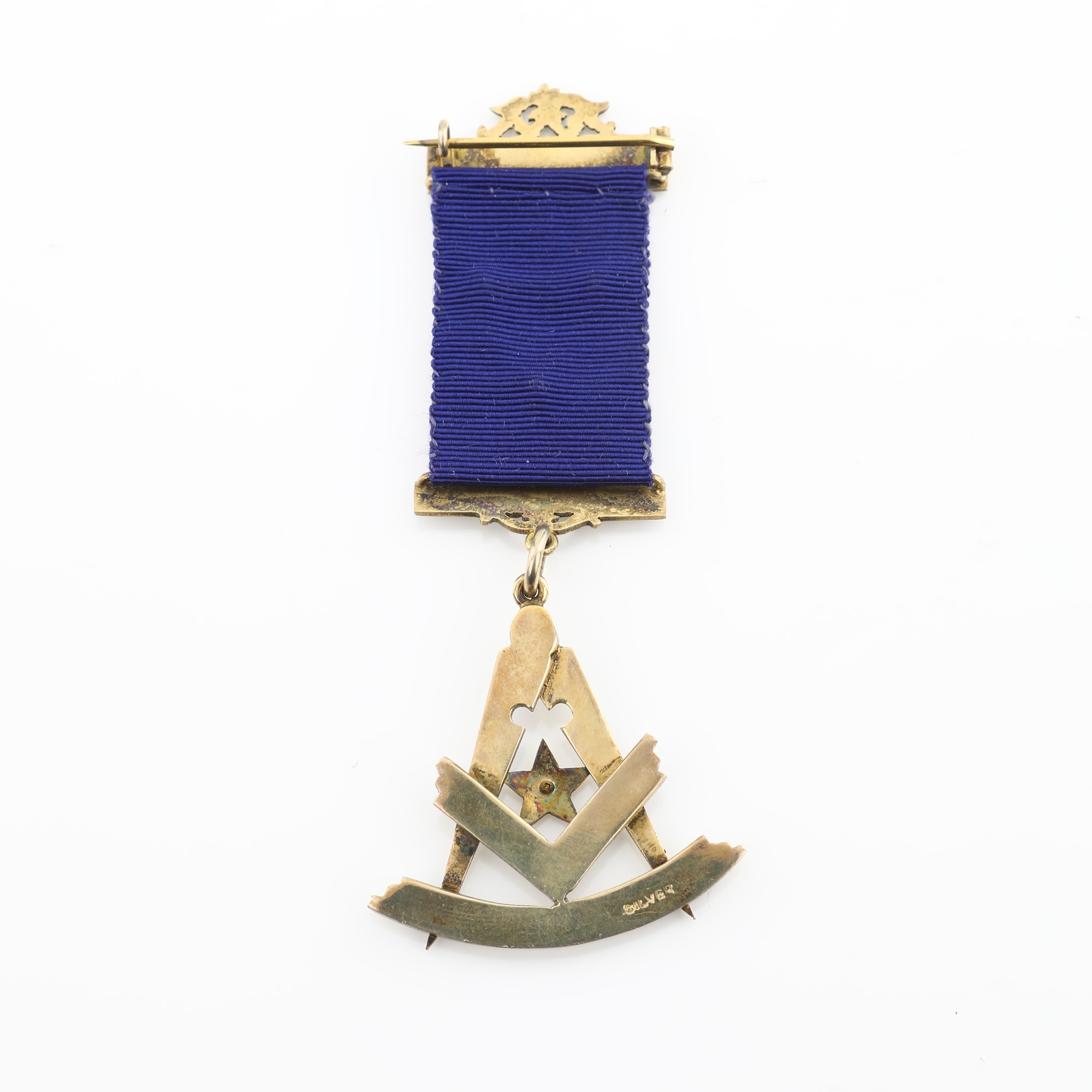 lunghezza con nastro cm 10 - gr. 20 lunghezza con nastro cm 10 - gr. 20 con iscrizione incisa su scudo: Presented to Bro. J. Christie P.M. for services rendered as R.W.M. during the years 1943-45 e pendente in forma di compasso, squadra e goniometro. Bolli inglesi