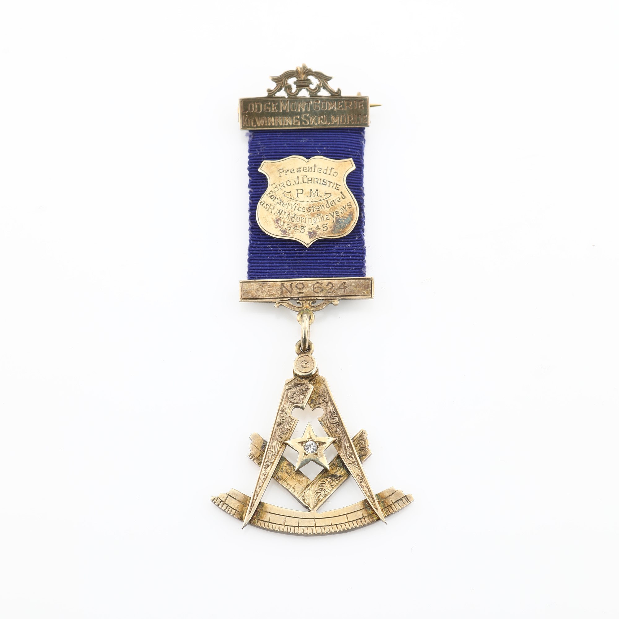 Distintivo con coccarda e spilla della Lodge Montgomerie Kilwinning Skelmorlie n° 624 in argento dorato con diamante