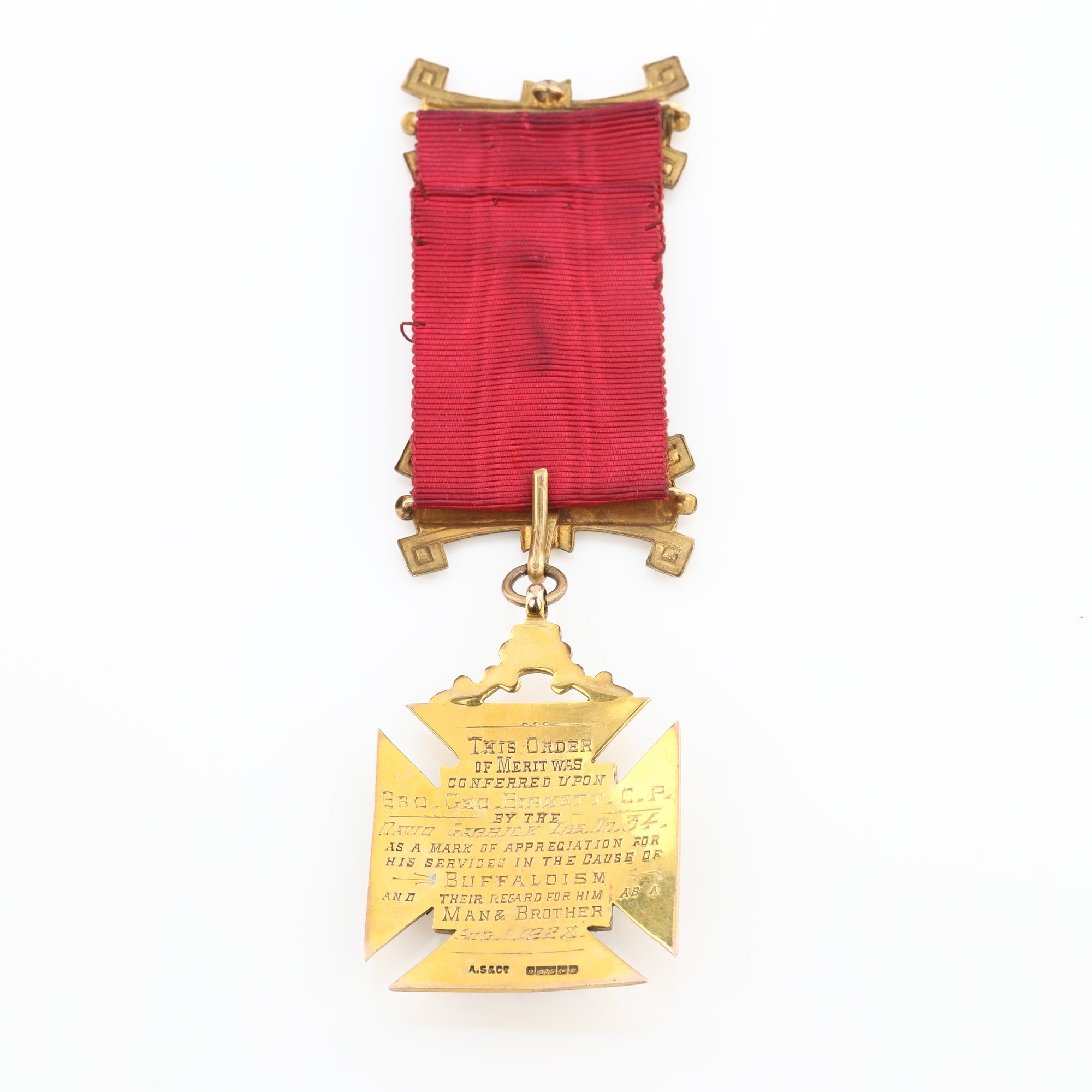 lunghezza con nastro cm 12,5 - gr. 32 lunghezza con nastro cm 12,5 - gr. 32 Ai vertici del nastro cartigli in oro con data: 1st Dec. Aug. II. 1919 e 2nd Dec. June 21.1920. Inciso al verso della medaglia: this order of merit was conferred upon Bro. Geo. Birkett C.P. by the David Garrick L.ge n° 34 as a mark of appreciation for his services in the cause of Buffaloism and their regard for him as a Man & Brother Aug. 1.1927. Bollo della città di Birmingham con datario 1927-28 e dell'argentiere A.S. & co.