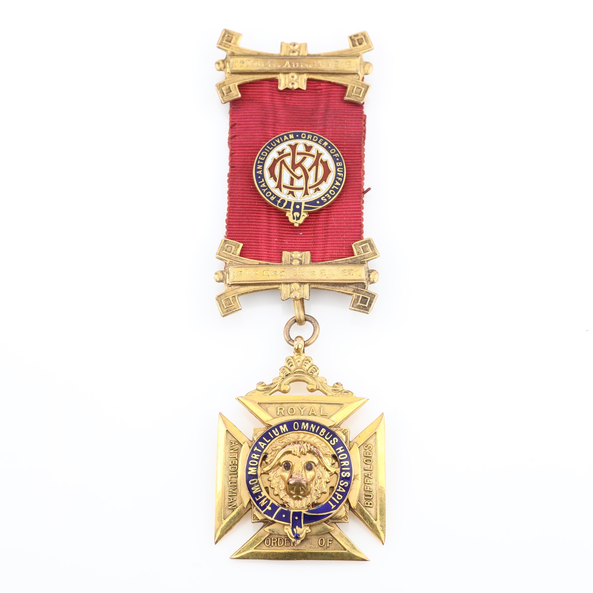Distintivo con coccarda del Royal Antediluvian Order of Buffaloes in oro 9 kt, metallo dorato e smalti