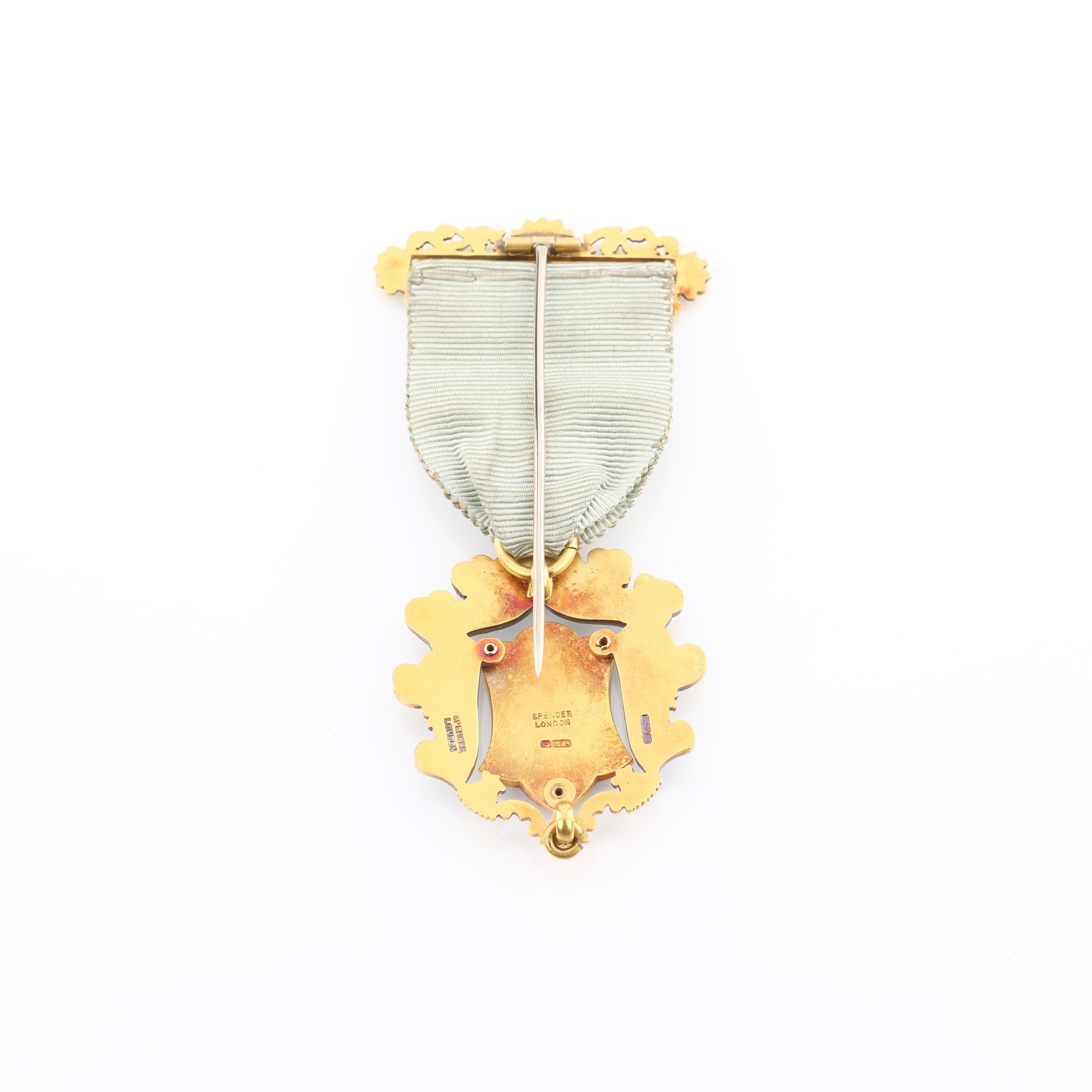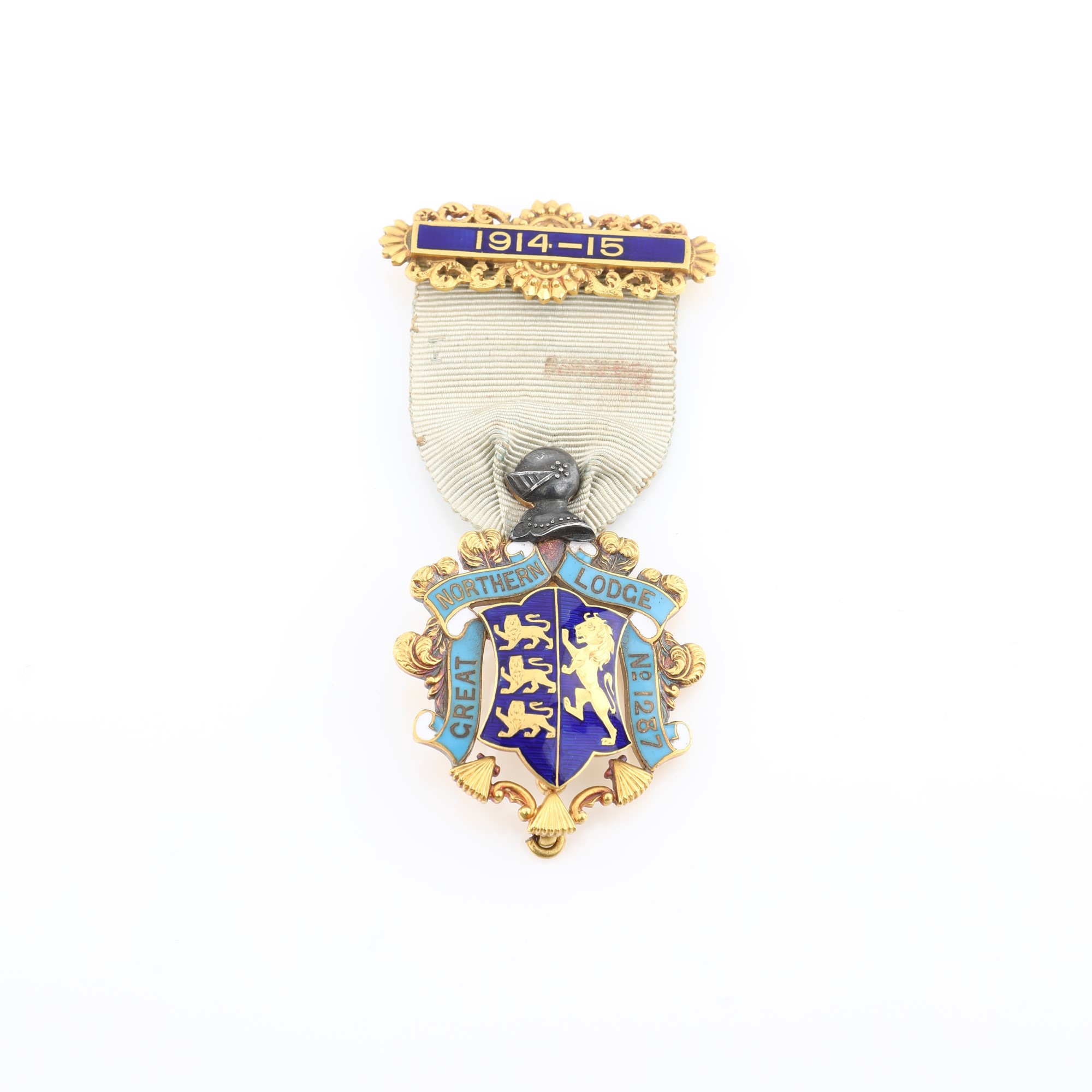 Distintivo con coccarda e spilla della Great Northern Lodge n° 1287 in oro 15 kt e smalti
