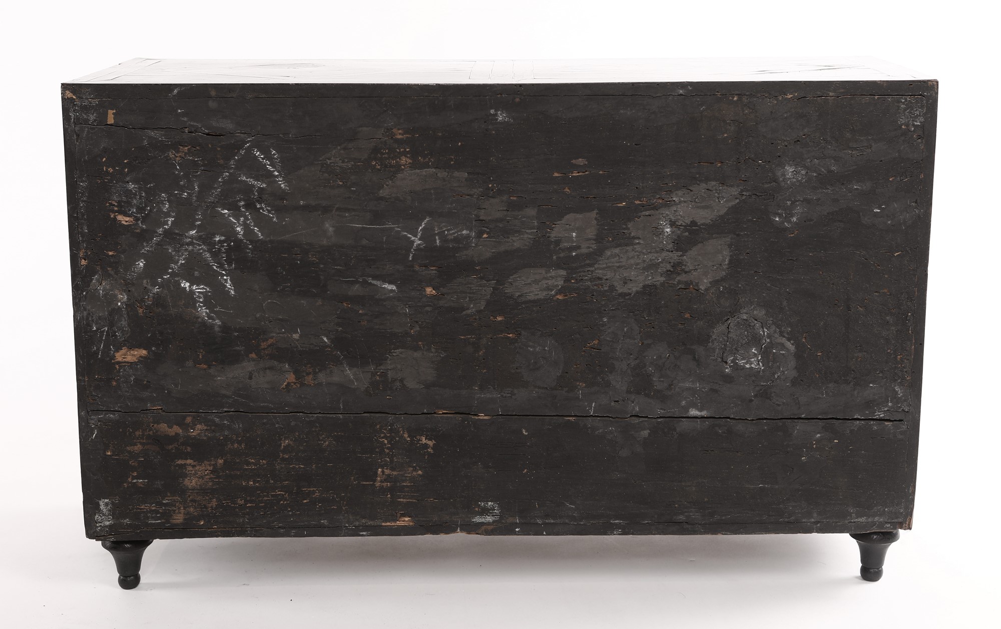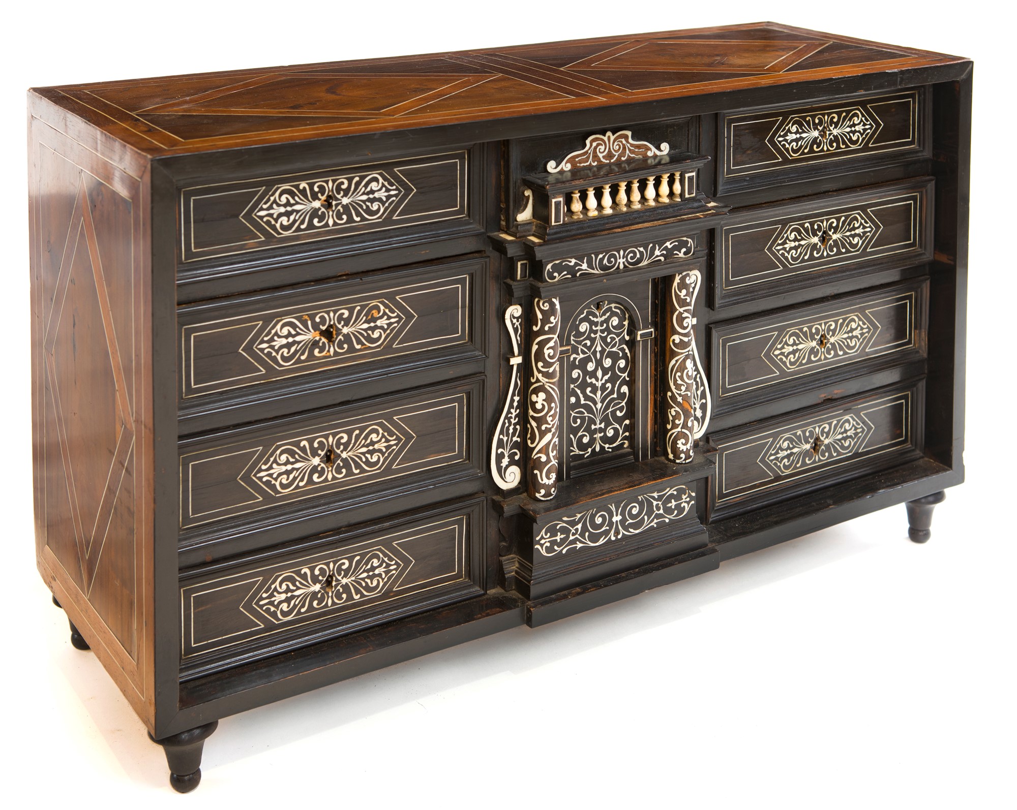cm 50x81x30 cm 50x81x30 con filettature in osso a creare riquadri e losanghe; facciata ebanizzata di impostazione architettonica, decorata da tarsie in osso, piedi a trottola