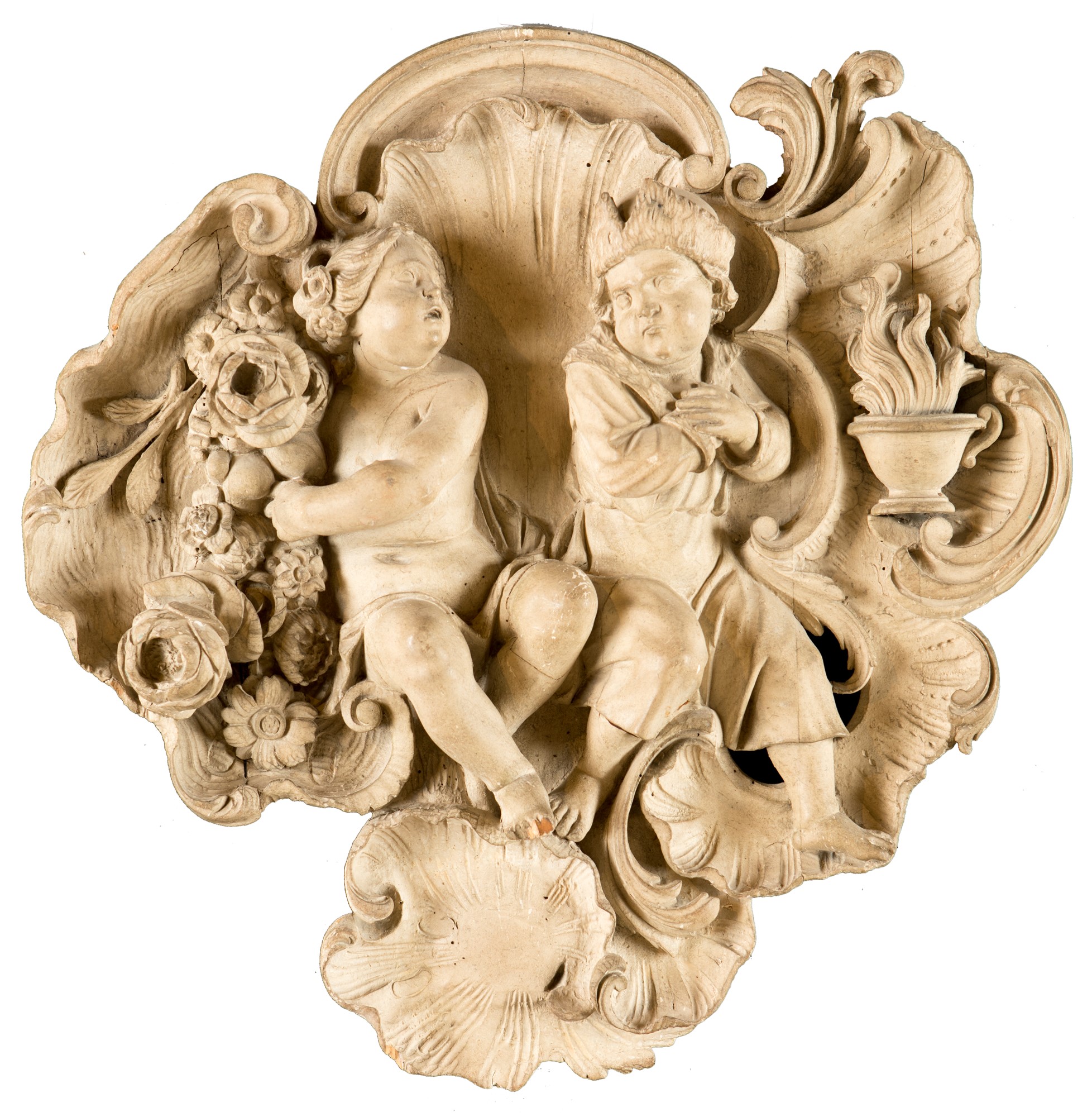 cm 62x60 cm 62x60 in forma di ampio cartiglio da cui emergono figure allegoriche della primavera e dell'inverno rese in altorilievo
