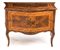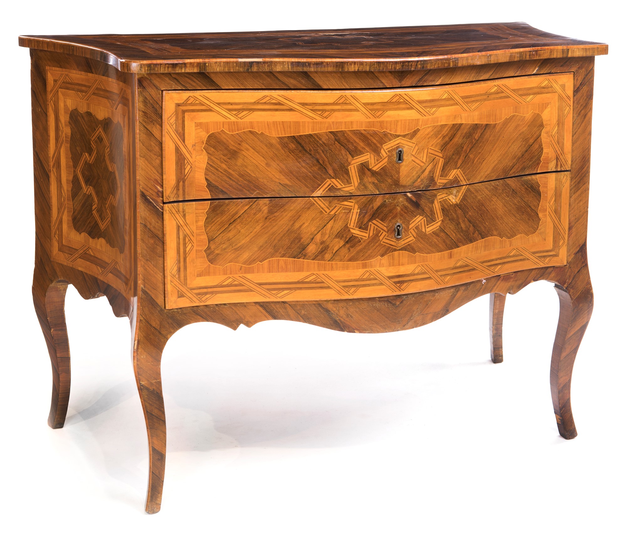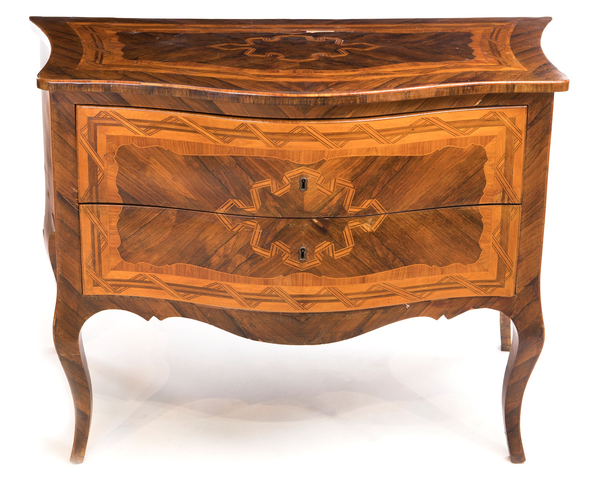 cm 95X132X65 cm 95X132X65 caratterizzato da intarsi in legni di frutto in forma di nastro ad andamento spezzato posto a cornice della varie partizioni e come motivo decorativo centrale di ogni specchiatura; corpo sagomato con due cassetti frontali privi di traversa, gambe mosse