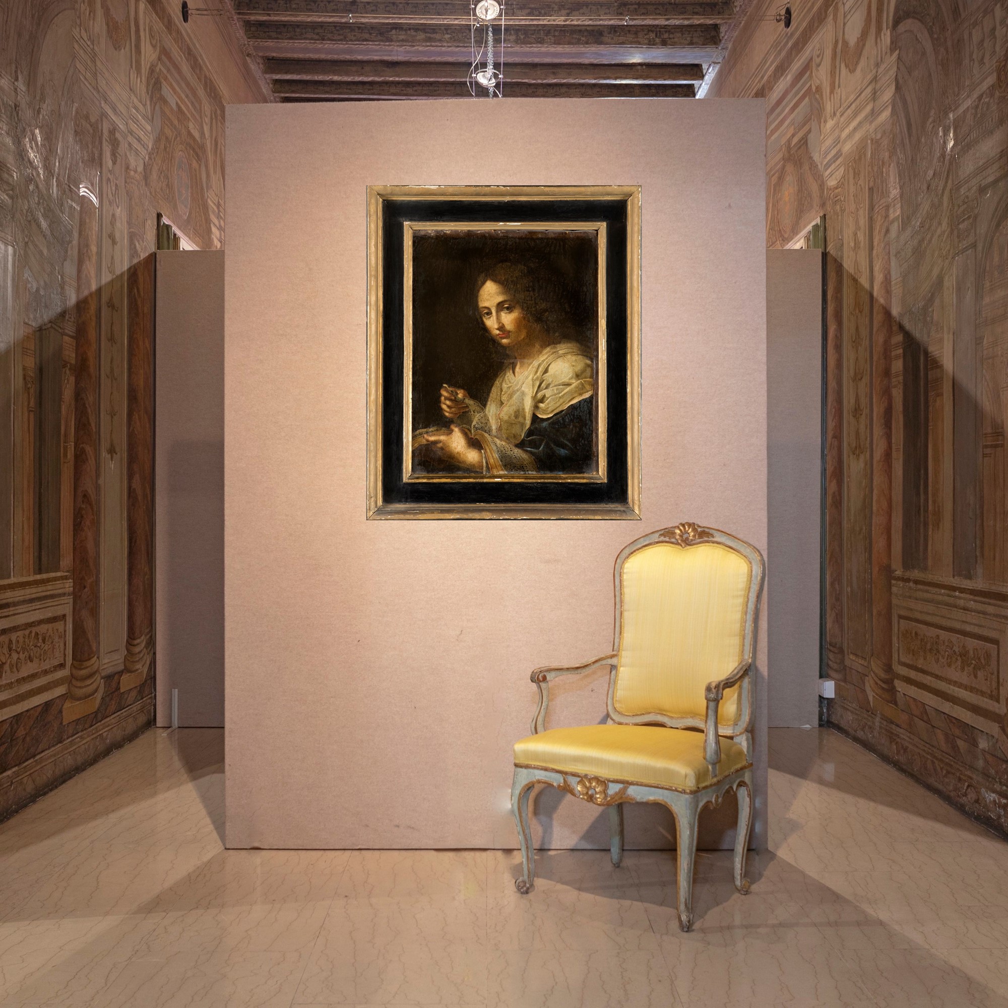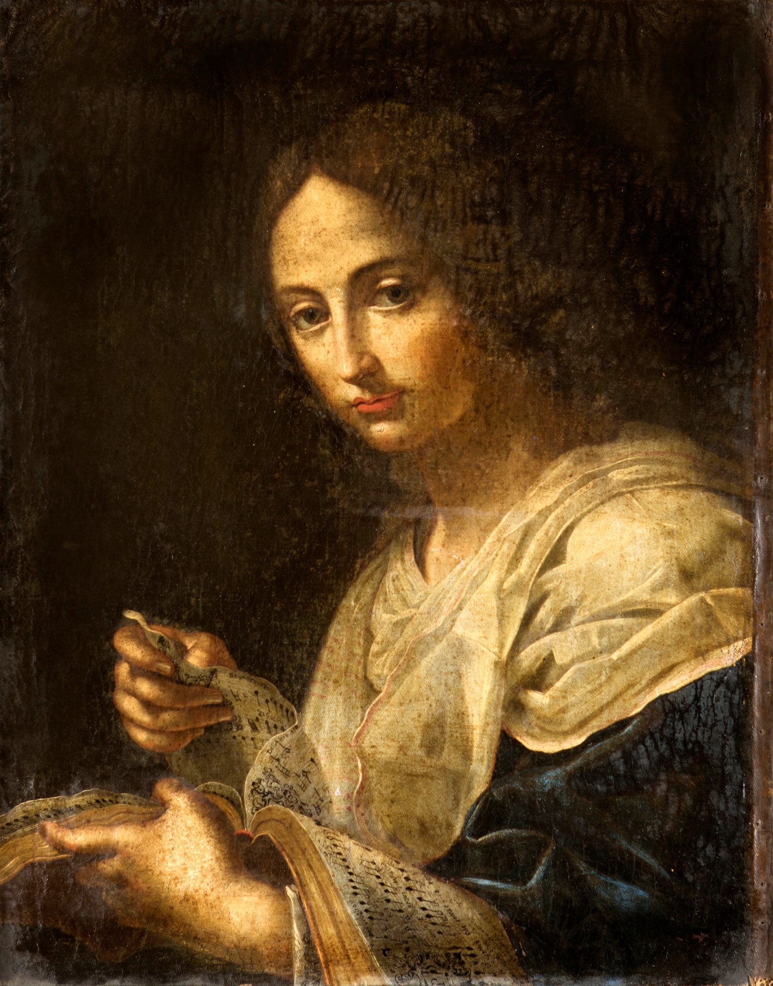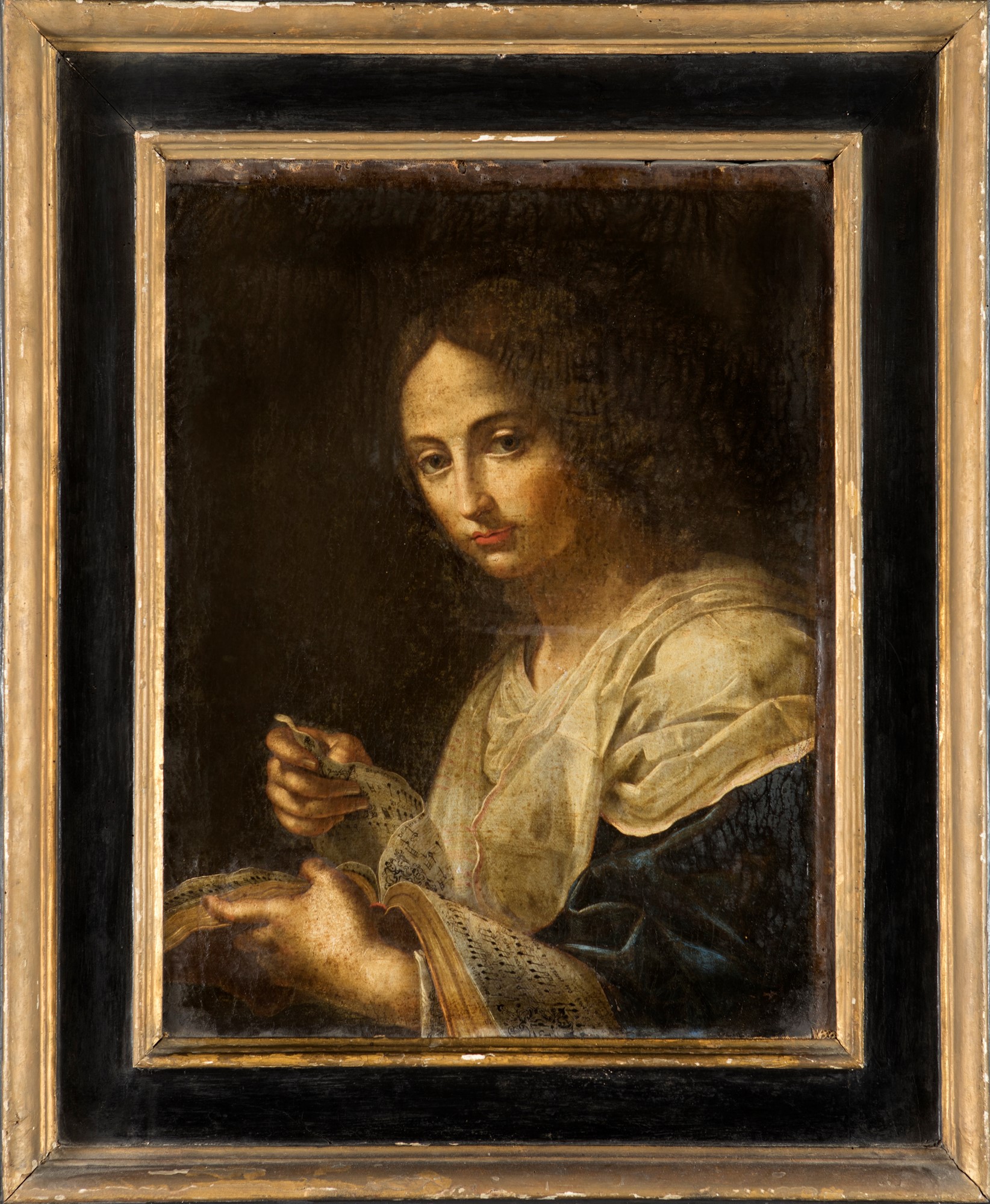 olio su tela cm 66x51 - in cornice: cm 92x78 Cesare Dandini olio su tela cm 66x51 - in cornice: cm 92x78 Figura di donna con spartito musicale tra le mani. L'espressione assorta, il fine modellato, la tecnica delle pieghe delle vesti e il complesso e seducente gioco di mani nell'atto di voltare le pagine del testo, rimandano alla mano del pittore fiorentino Cesare Dandini. L'idealizzazione del volto, senza alcuna volontà di caratterizzazione, e la presenza dello spartito, suggeriscono di essere in presenza di una allegoria, genere in cui il Dandini fu maestro. Si veda, per riferimento, la "Allegoria della Commedia" presso Palazzo degli Alberti a Prato. Non è tuttavia da escludere che possa trattarsi di una raffigurazione di Santa Cecilia, sebbene la possibilità appare più remota se consideriamo il carattere profano dell'effigiata.