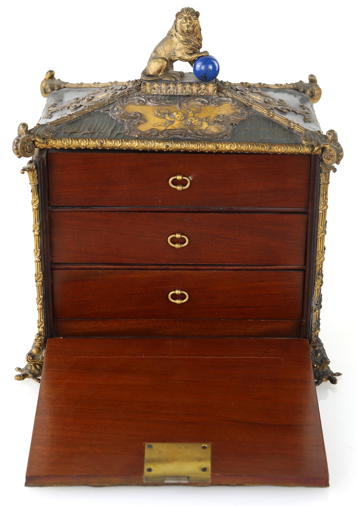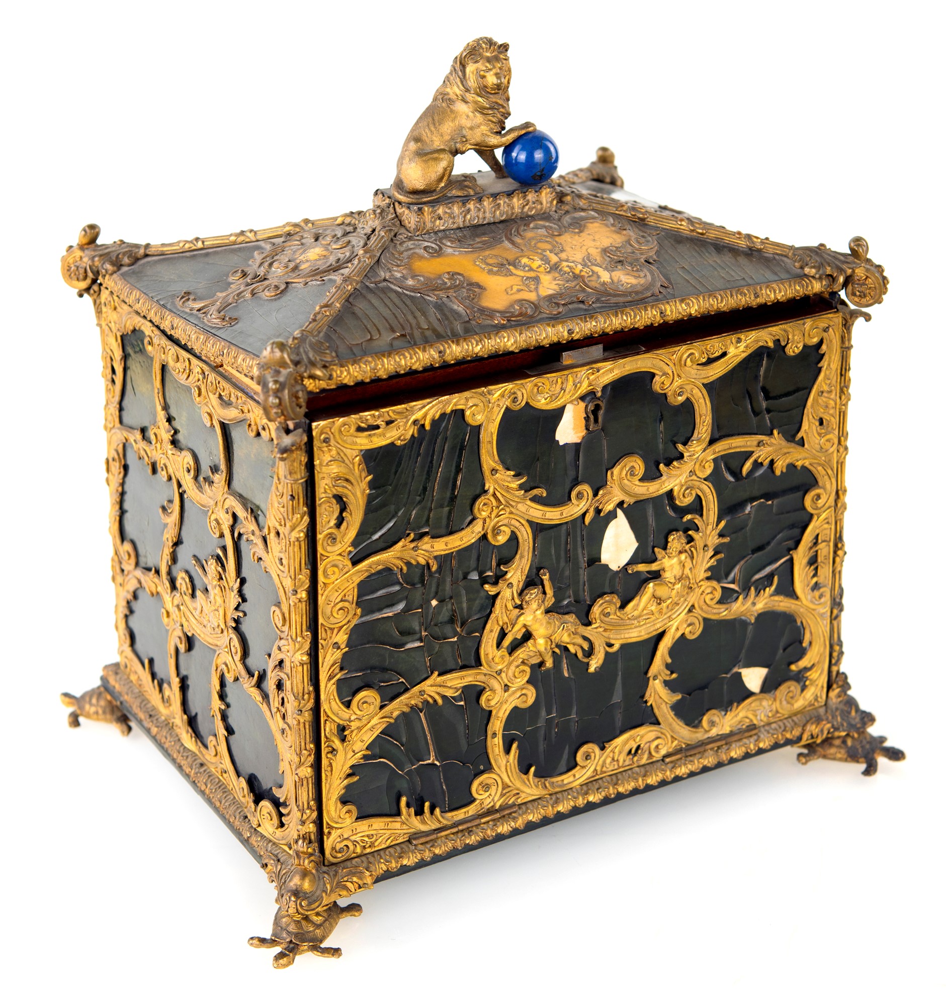 cm 30x27x22 cm 30x27x22 con struttura squadrata e copertura ad urna dominata da un leone, con facciate decorate da applicazioni in bronzo dorato in forma di volute vegetali a creare un reticolato su cui idealmente siedono figure di amorino; poggiante su figure di tartaruga, reca tre tiretti interni. Difetti alla lacca