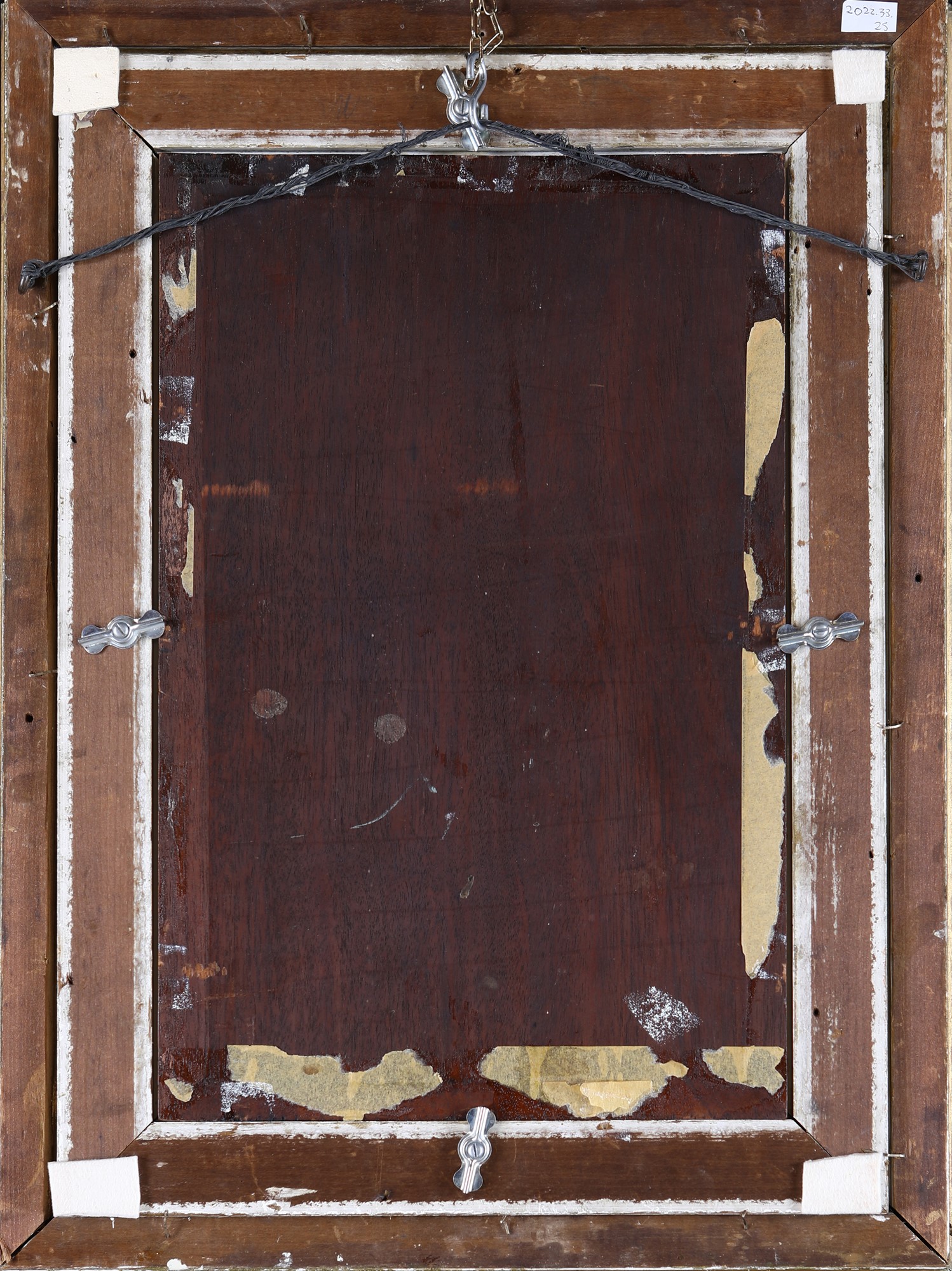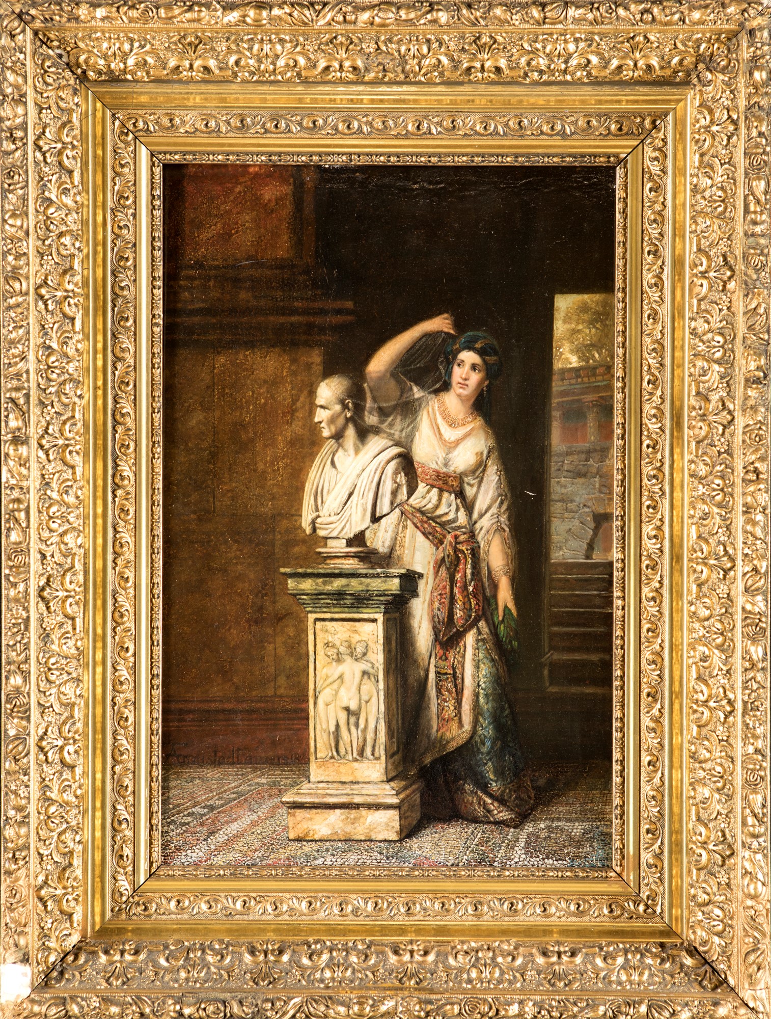 olio su tavola cm 48x30 - in cornice: 65x49 Pittore del XIX secolo olio su tavola cm 48x30 - in cornice: 65x49 Una figura di donna, personalizzazione della gloria, disvela il busto di Cesare tenendo in mano una corona di alloro. Il dipinto, con la sua enigmatica iconografia, fa parte di un filone che ebbe molto successo durane il XIX secolo, legato alla rappresentazione di allegorie e temi storici interpretati in modo più o meno fantasioso. Questo tipo di pittura si caratterizza per i numerosi riferimenti alla classicità, che spesso facevano eco alle importanti scoperte in campo archeologico di quegli anni. Possiamo in questo caso notare l'attenzione riposta nella raffigurazione di un pavimento intarsiato, i riferimenti alla statuaria, e alcune architetture sullo sfondo che ricordano i luoghi pompeiani.