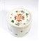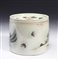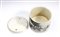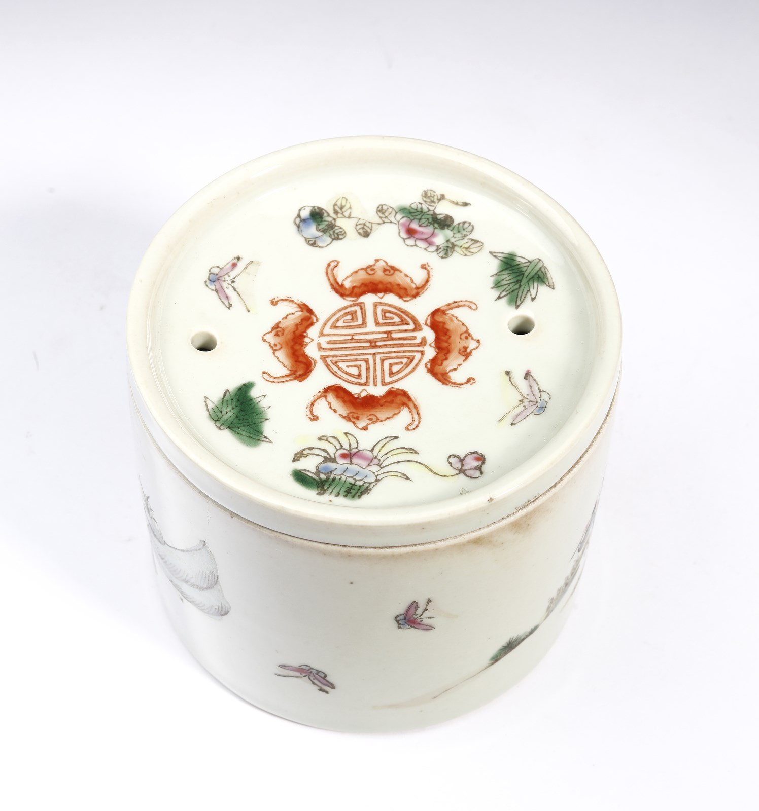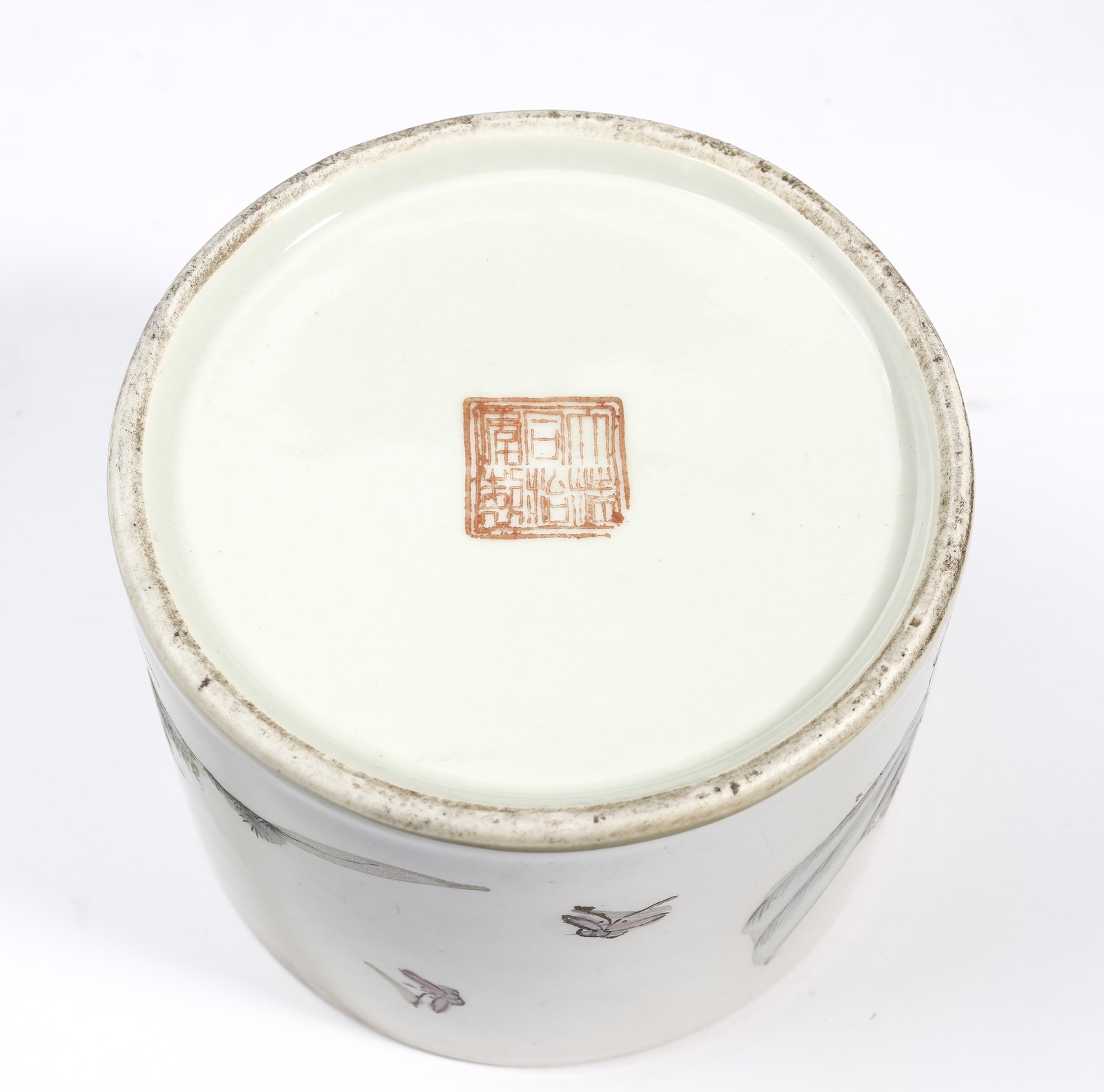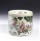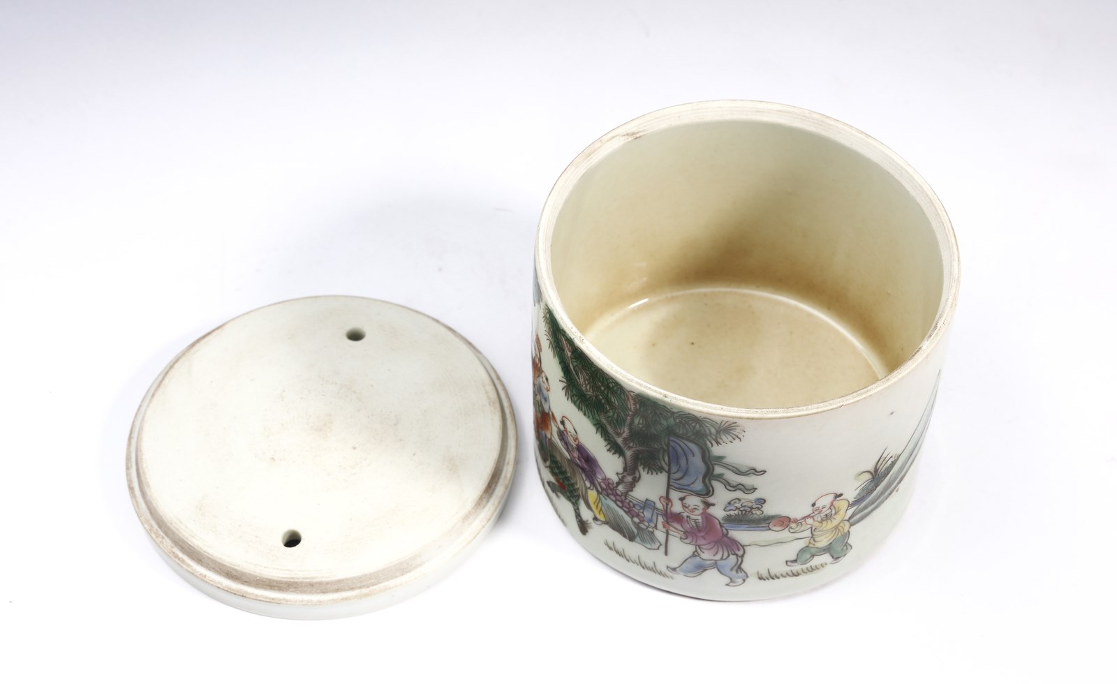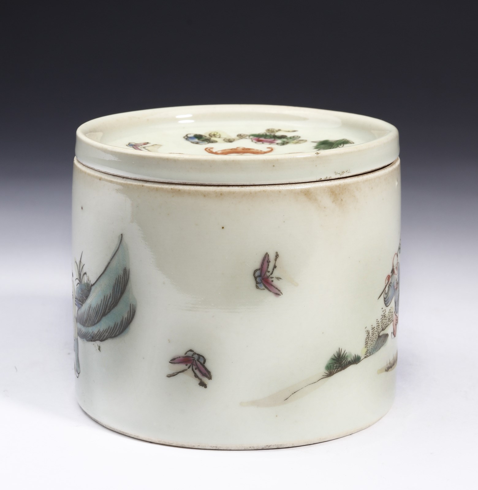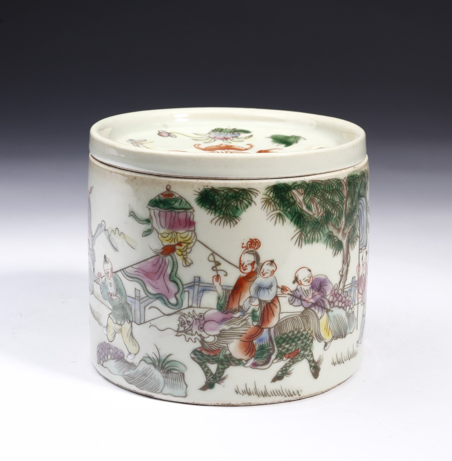 . . Cm 11,50 x 9,50 x 11,50. a sezione cilindrica, l'esterno dipinto con personaggi e simboli di buon auspicio. Marchio a sigillo a sei caratteri sulla base.