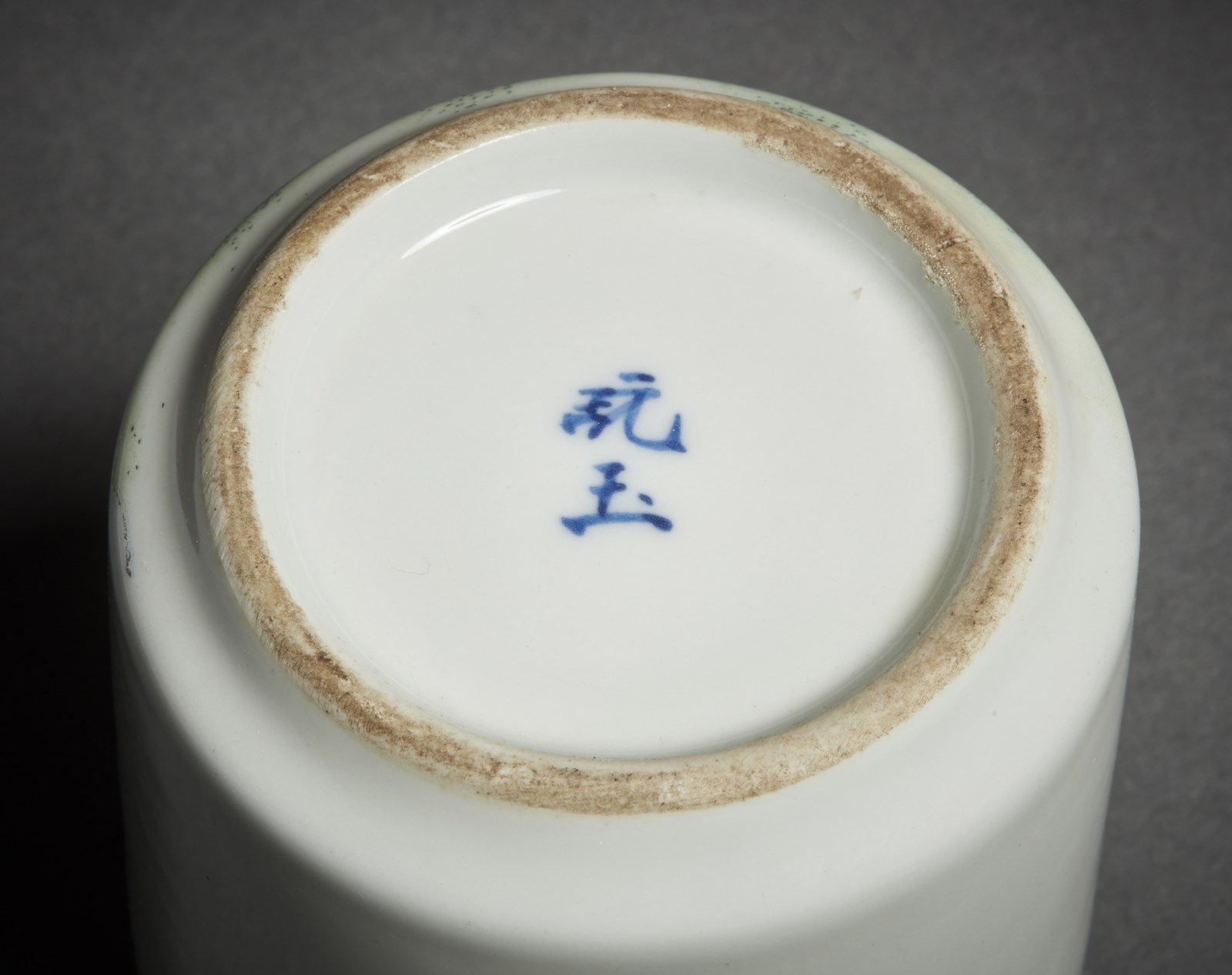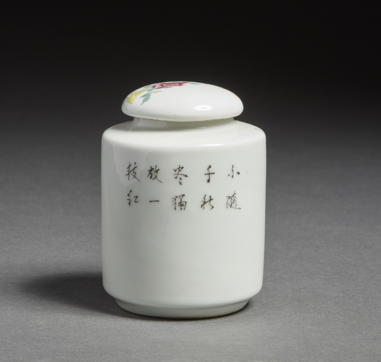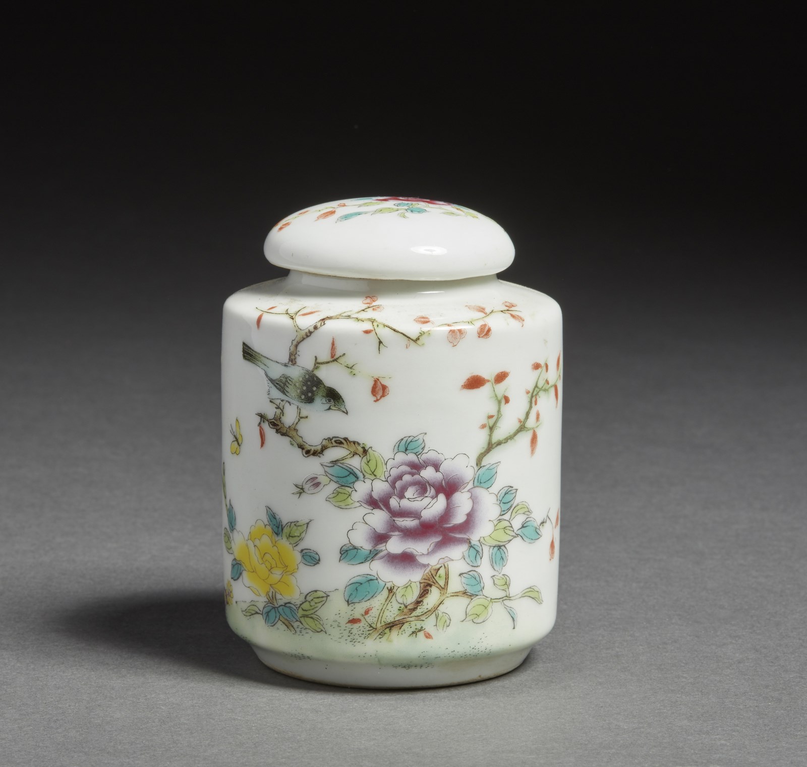 Cina, inizio XX secolo . . Cm 7,50 x 10,00. A sezione cilindrica, completo di coperchio, l'esterno dipinto con uccelli tra fiori ed iscrizione. Marchio a due caratteri sulla base.