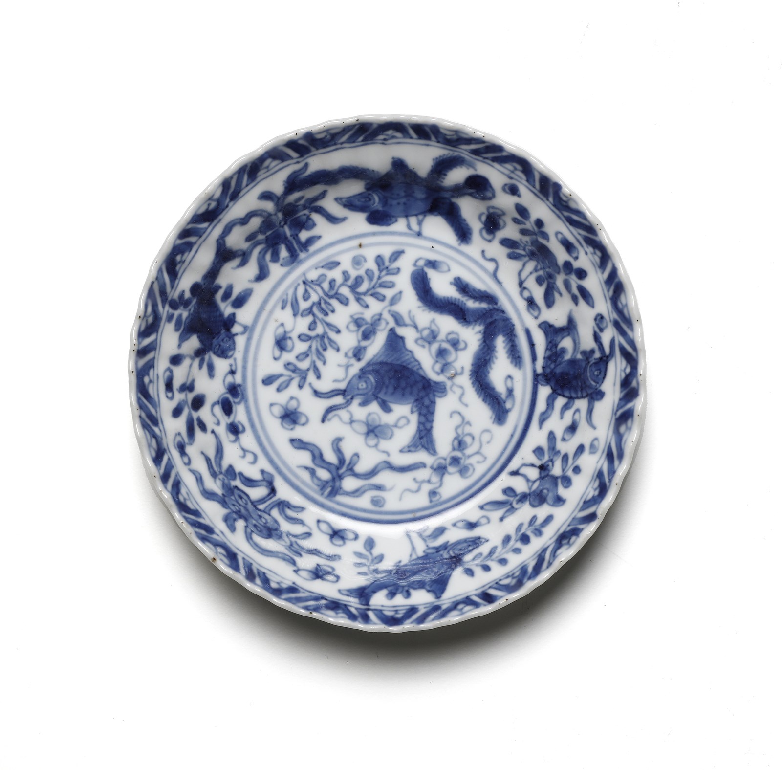 Cina, dinastia Qing, periodo Kangxi, XVII secolo . . Cm 12,60 x 2,50. Poggiante su breve disco, il cavetto costolato e l'orlo foliato. L'interno dipinto con carpe tra tralci ed elementi vegetali. Marchio figurativo Kangxi entro doppio cerchio dipinto sulla base.