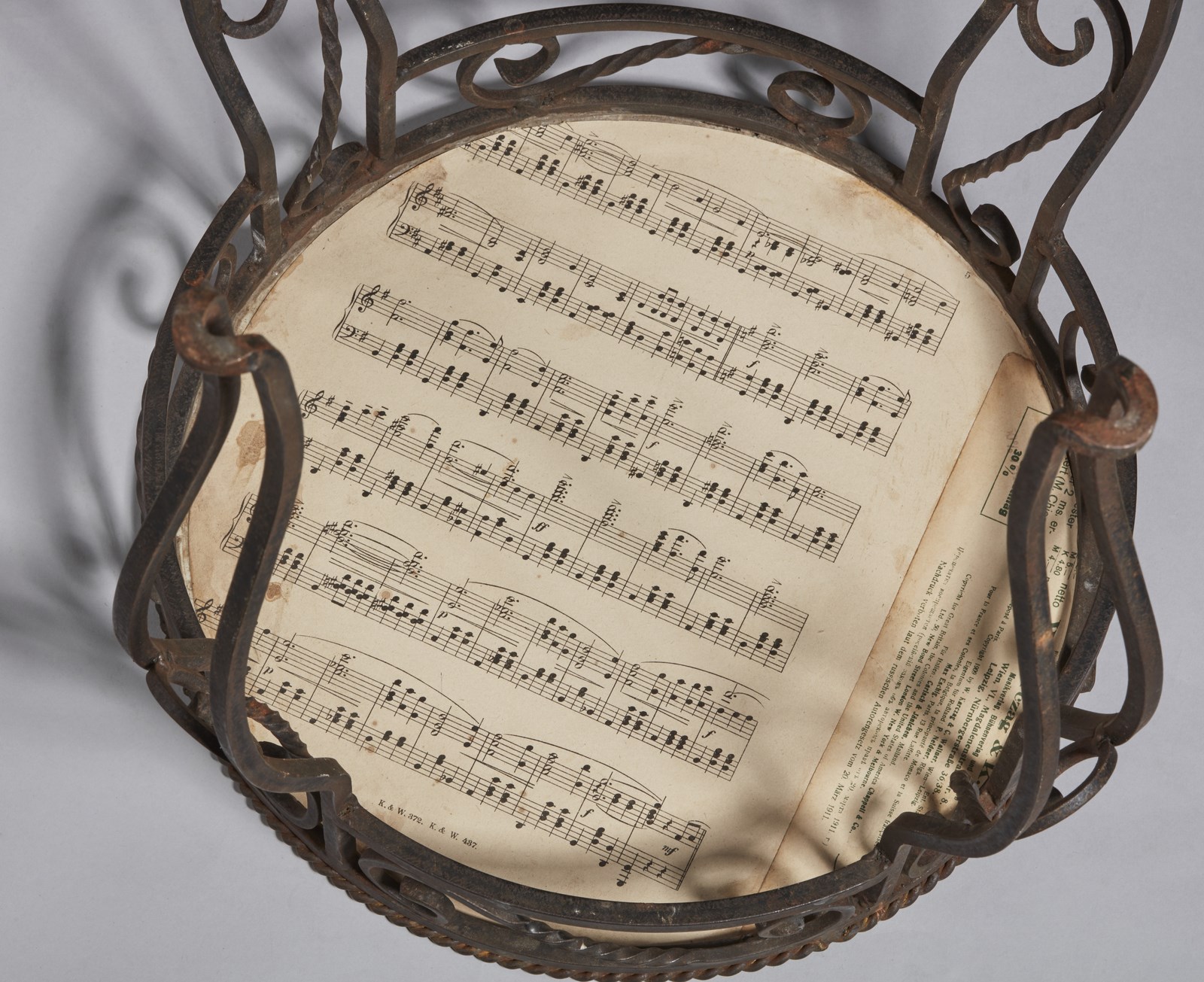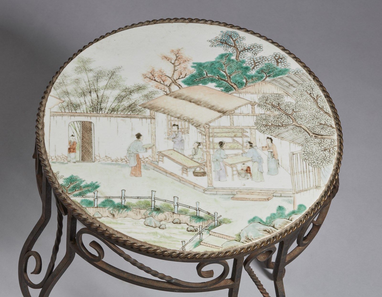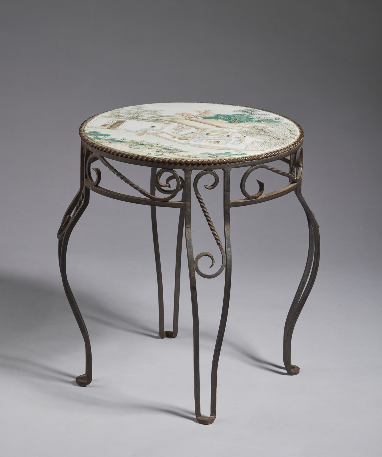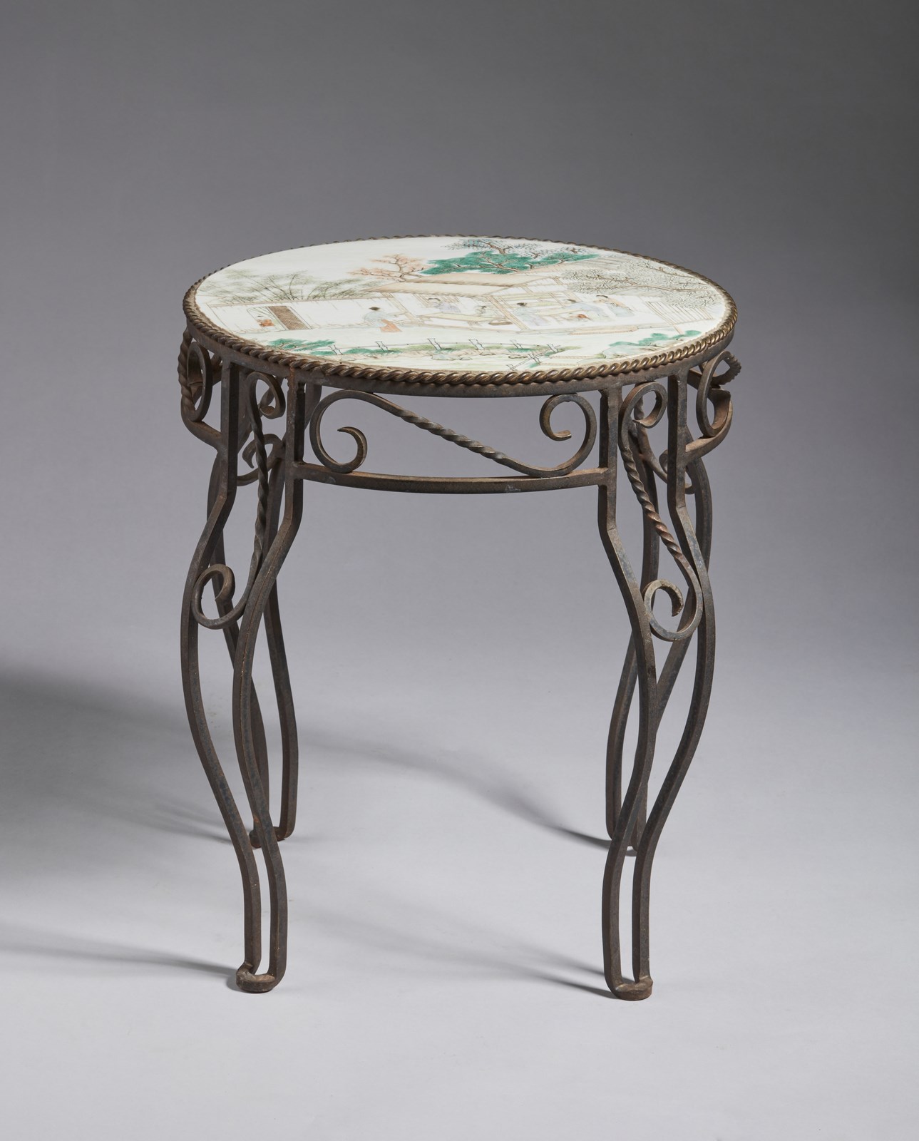 Arte Cinese Tavolino in ferro battuto con placca in porcellana