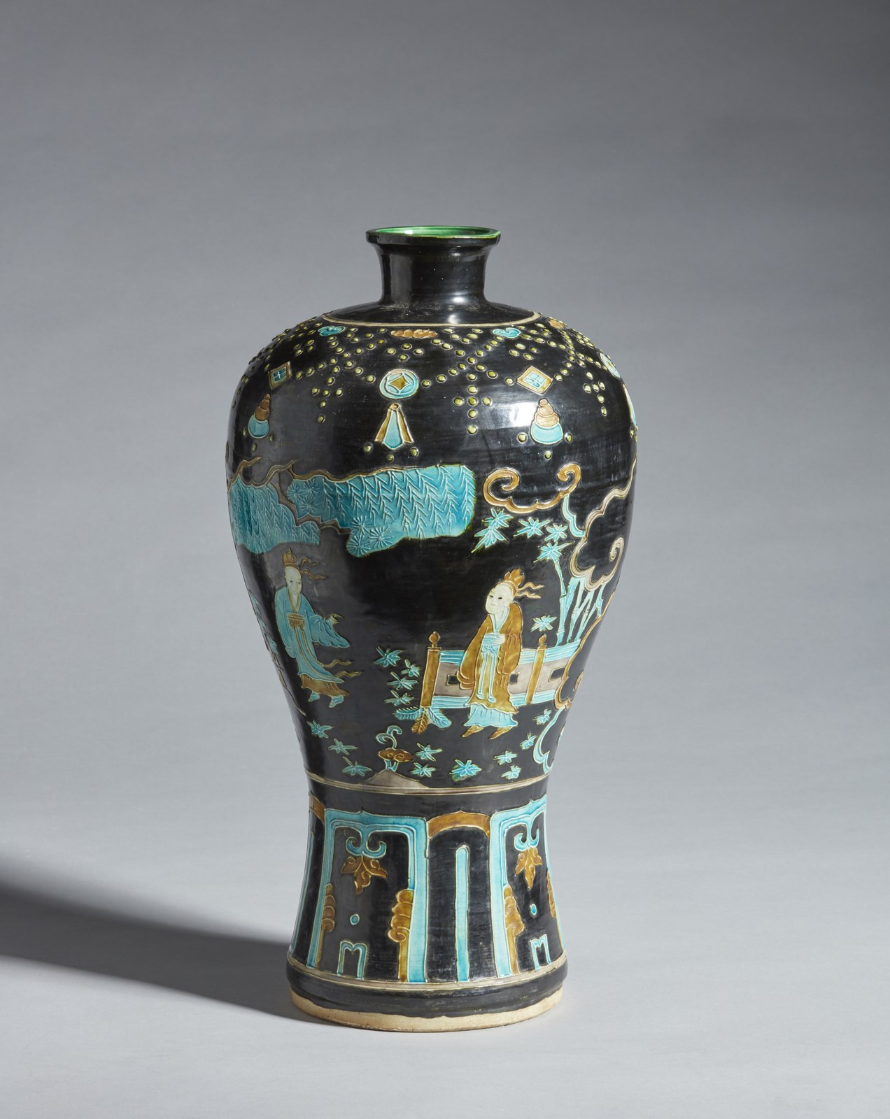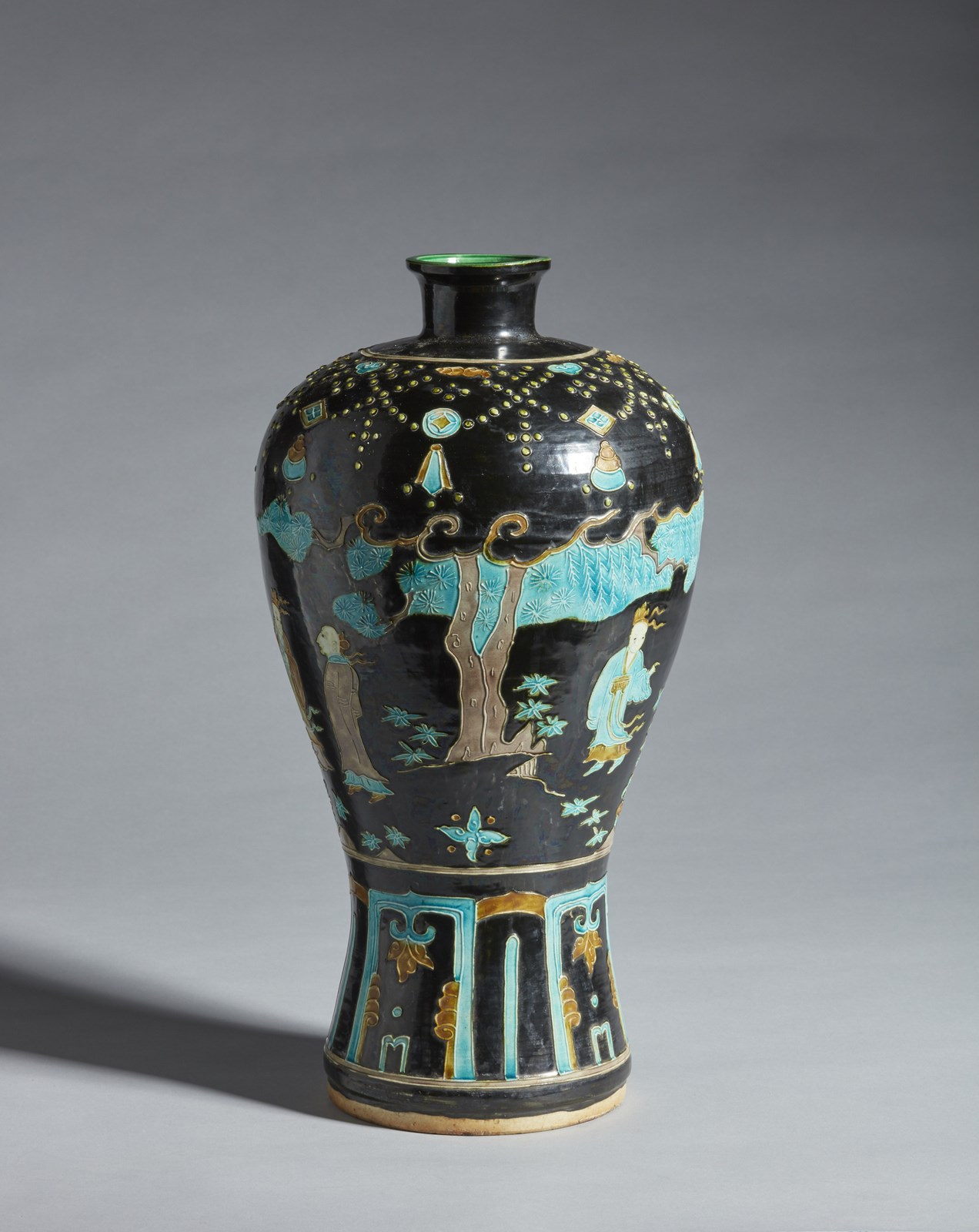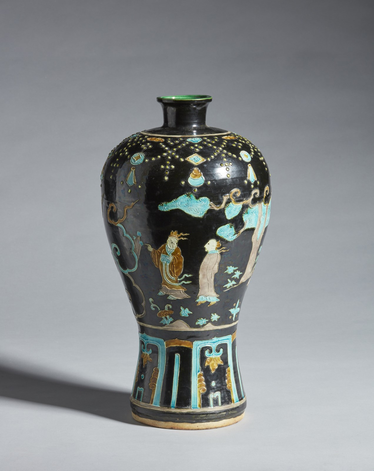 Cina, XX secolo . . Cm 40,00. dalla caratteristica forma a balaustro con collo corto, l'esterno decorato in rilievo con personaggi e paesaggio.