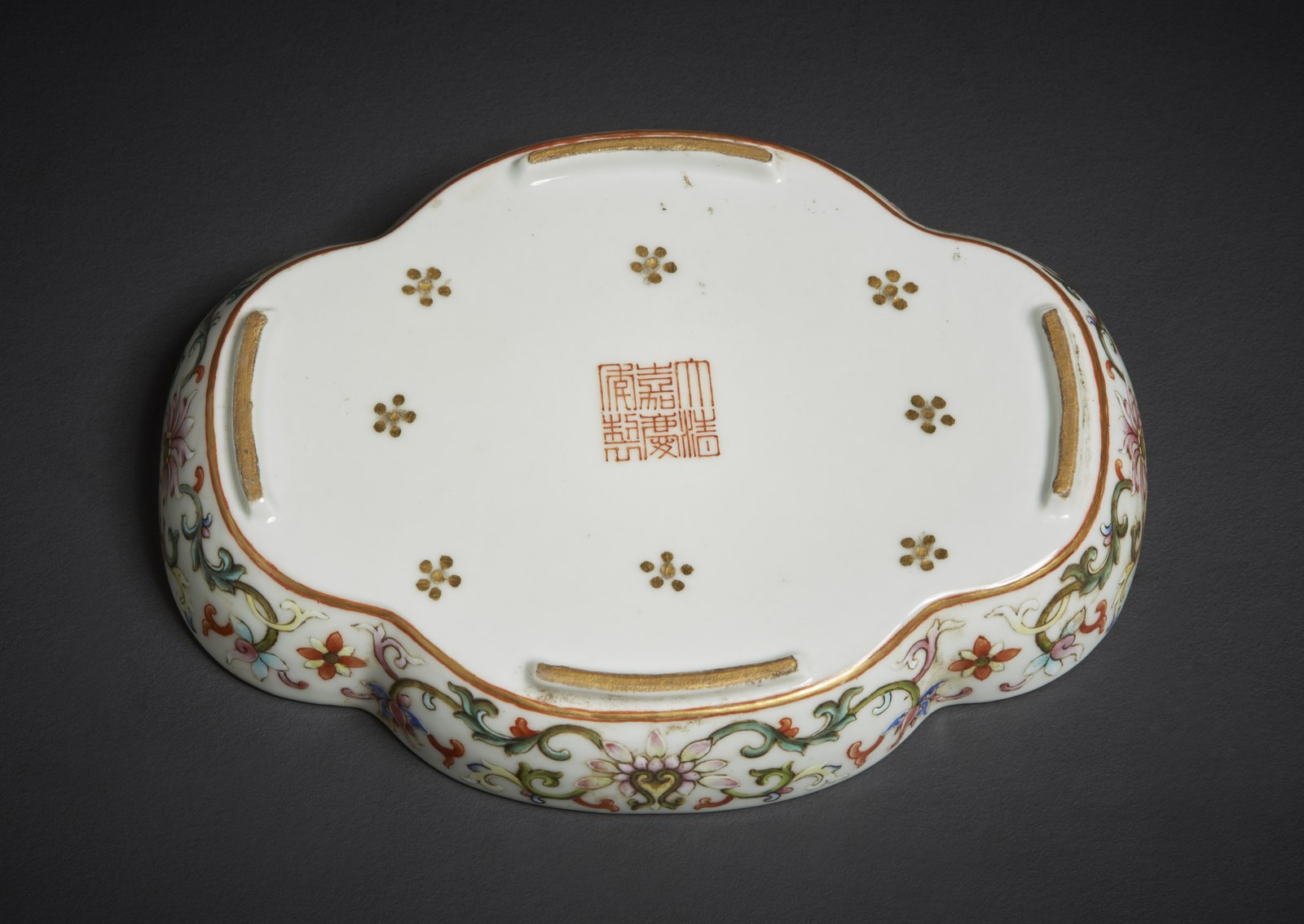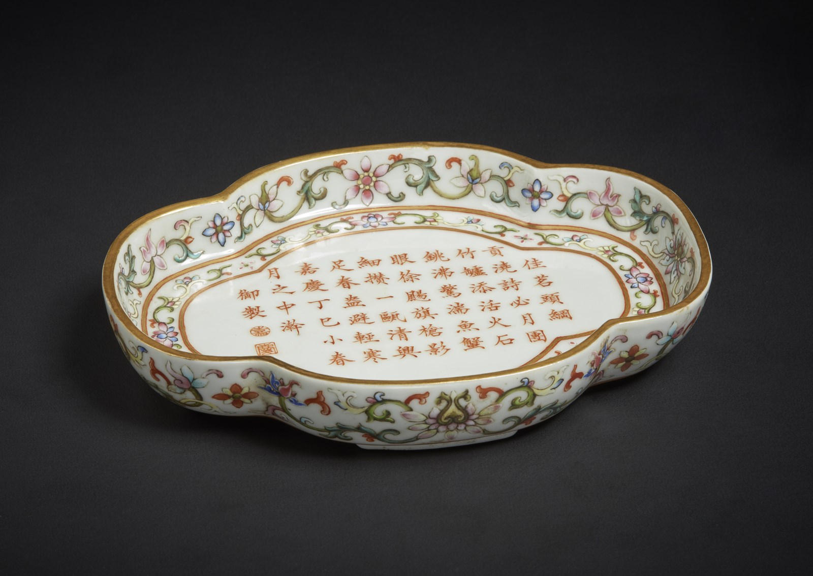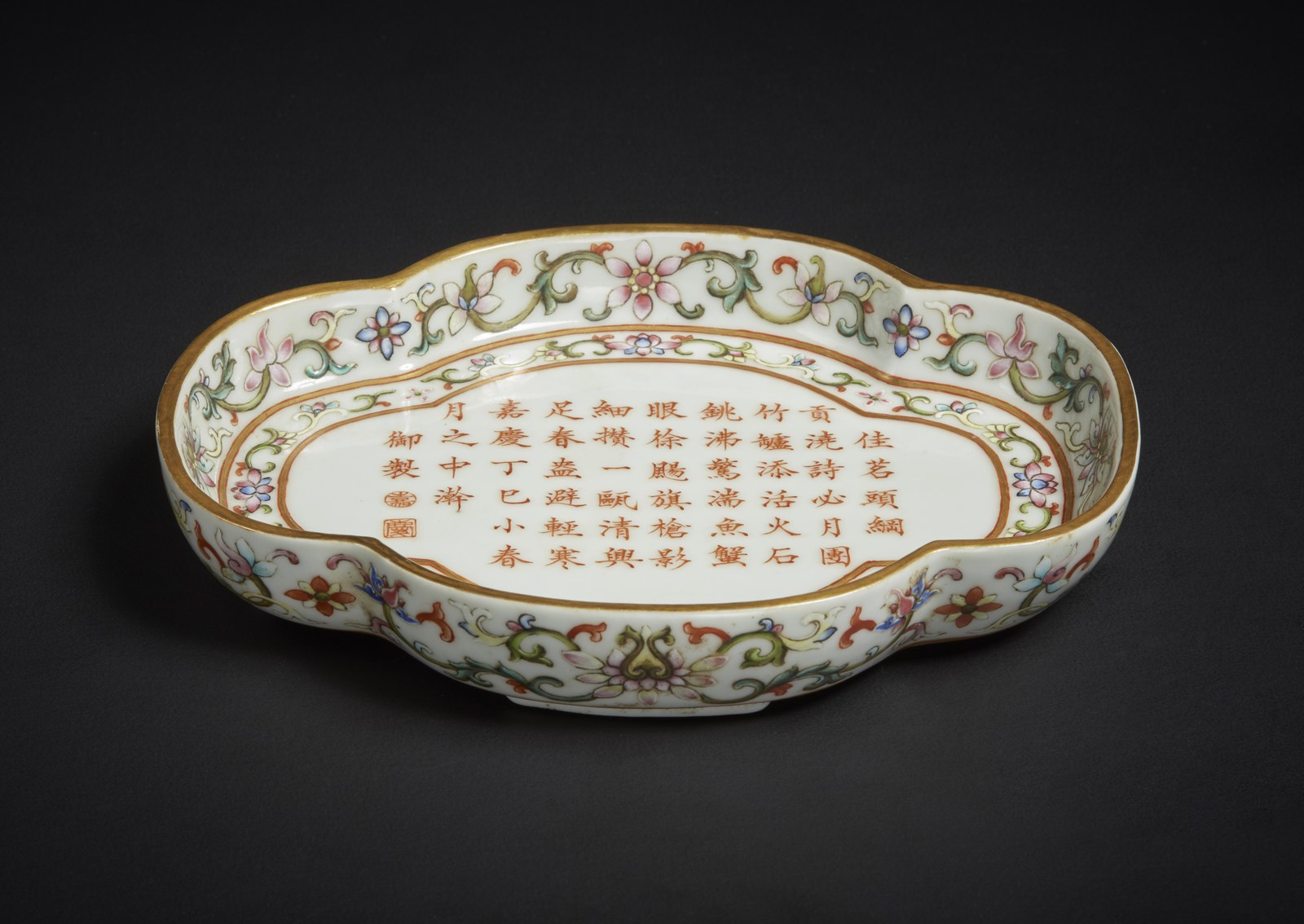 Arte Cinese Piccolo vassoio lobato decorato con lunga iscrizione