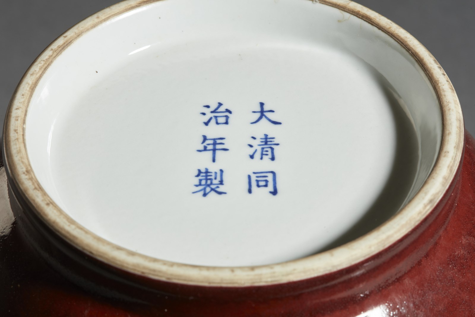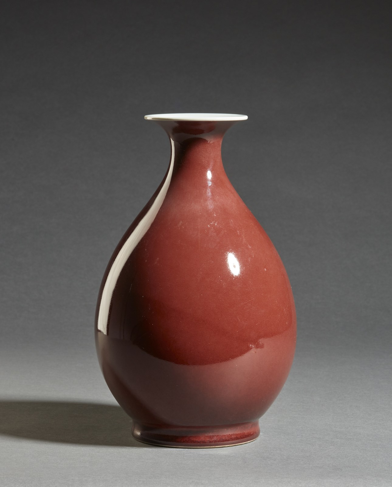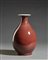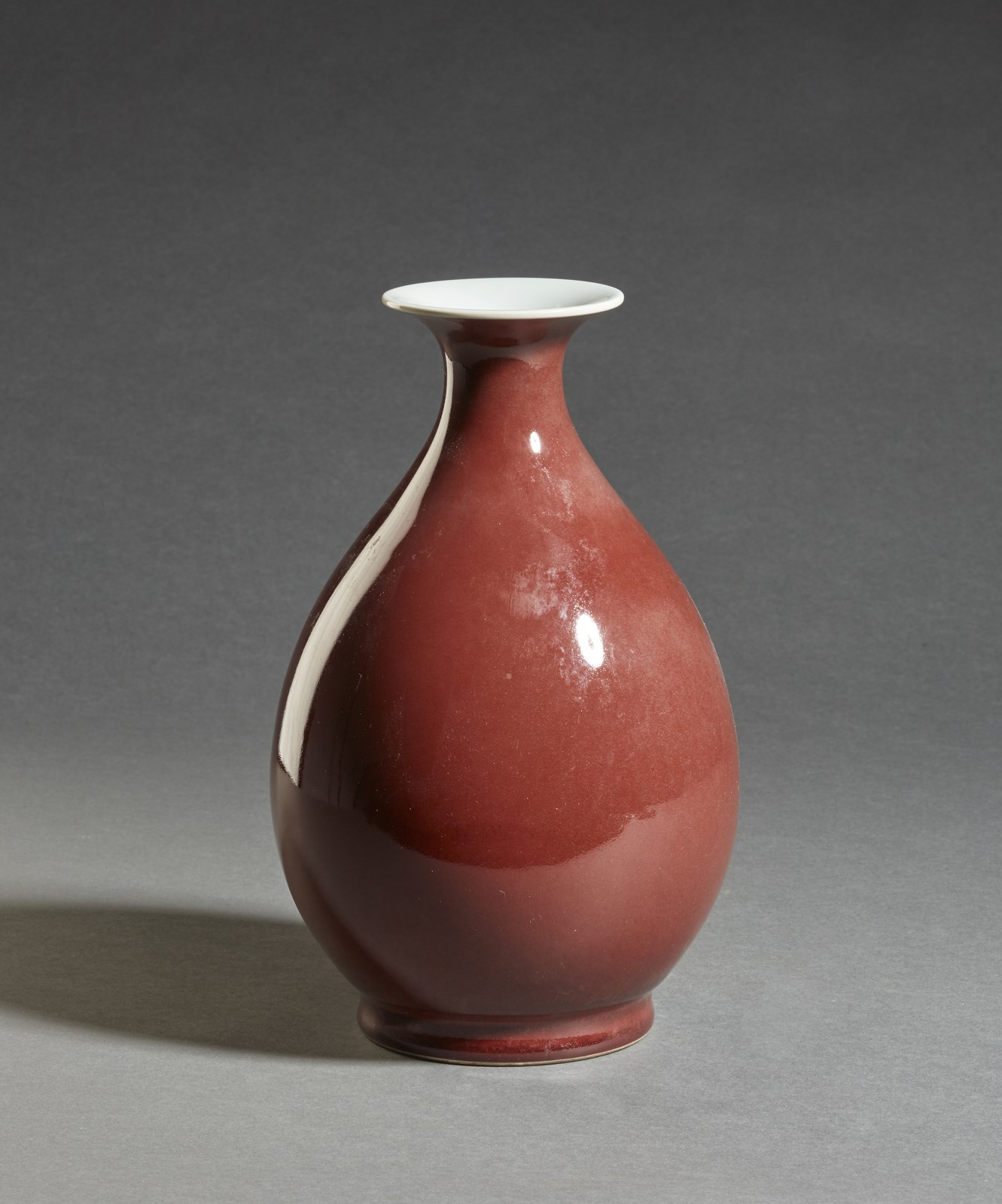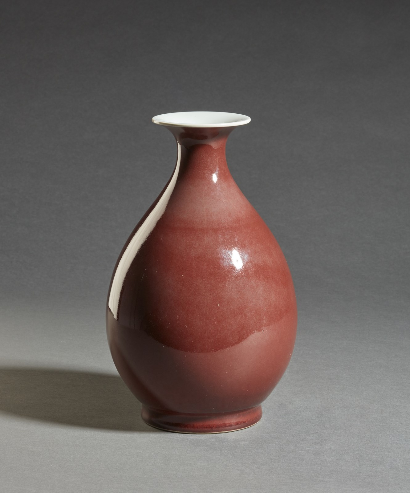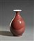 Cina, XIX secolo. . Cm 30,00. Bottiglia in porcellana con stretto collo e orlo superiore everso, l'esterno interamente ricoperto di vetrina rossa. Marchio Tongzhi a sei caratteri sulla base.