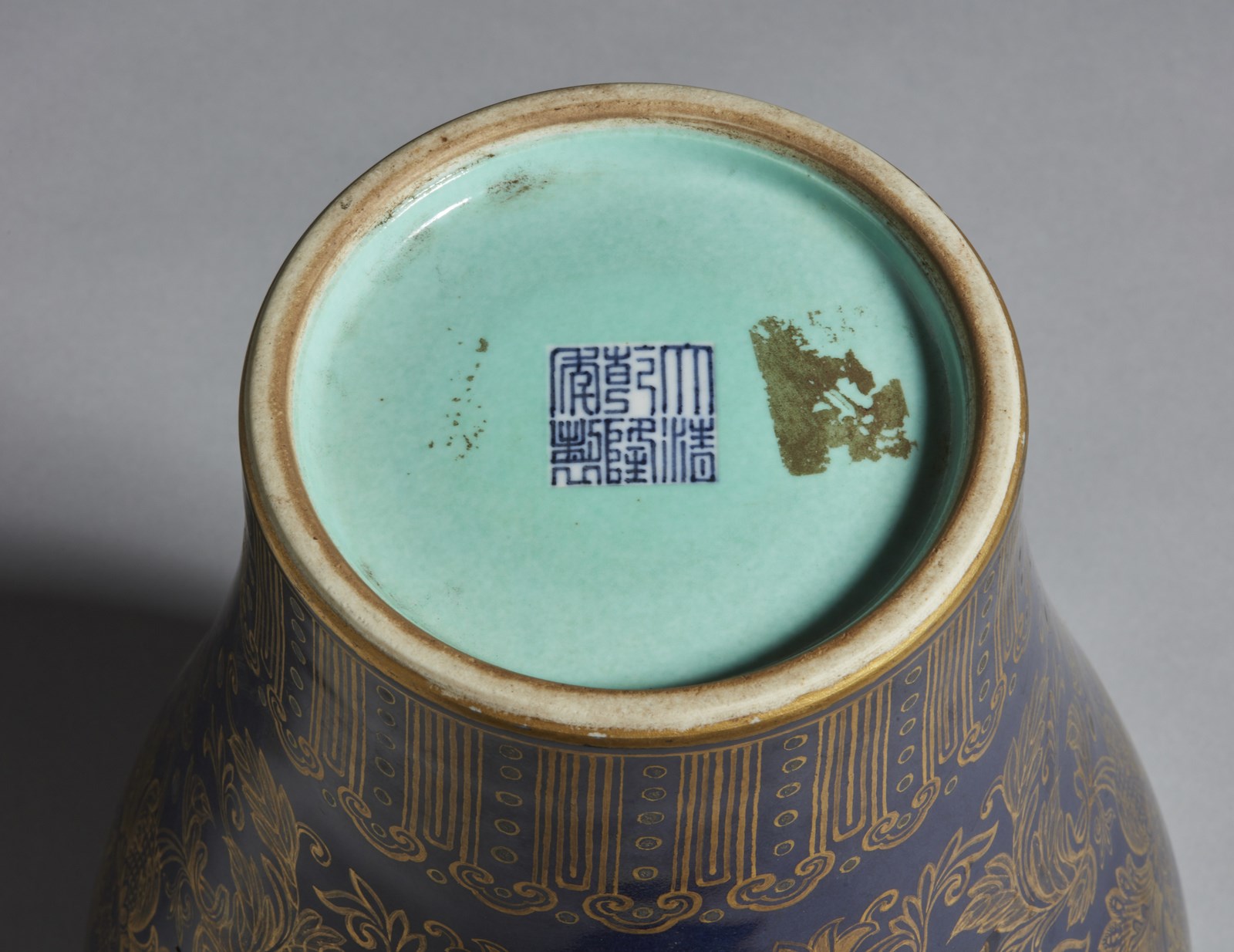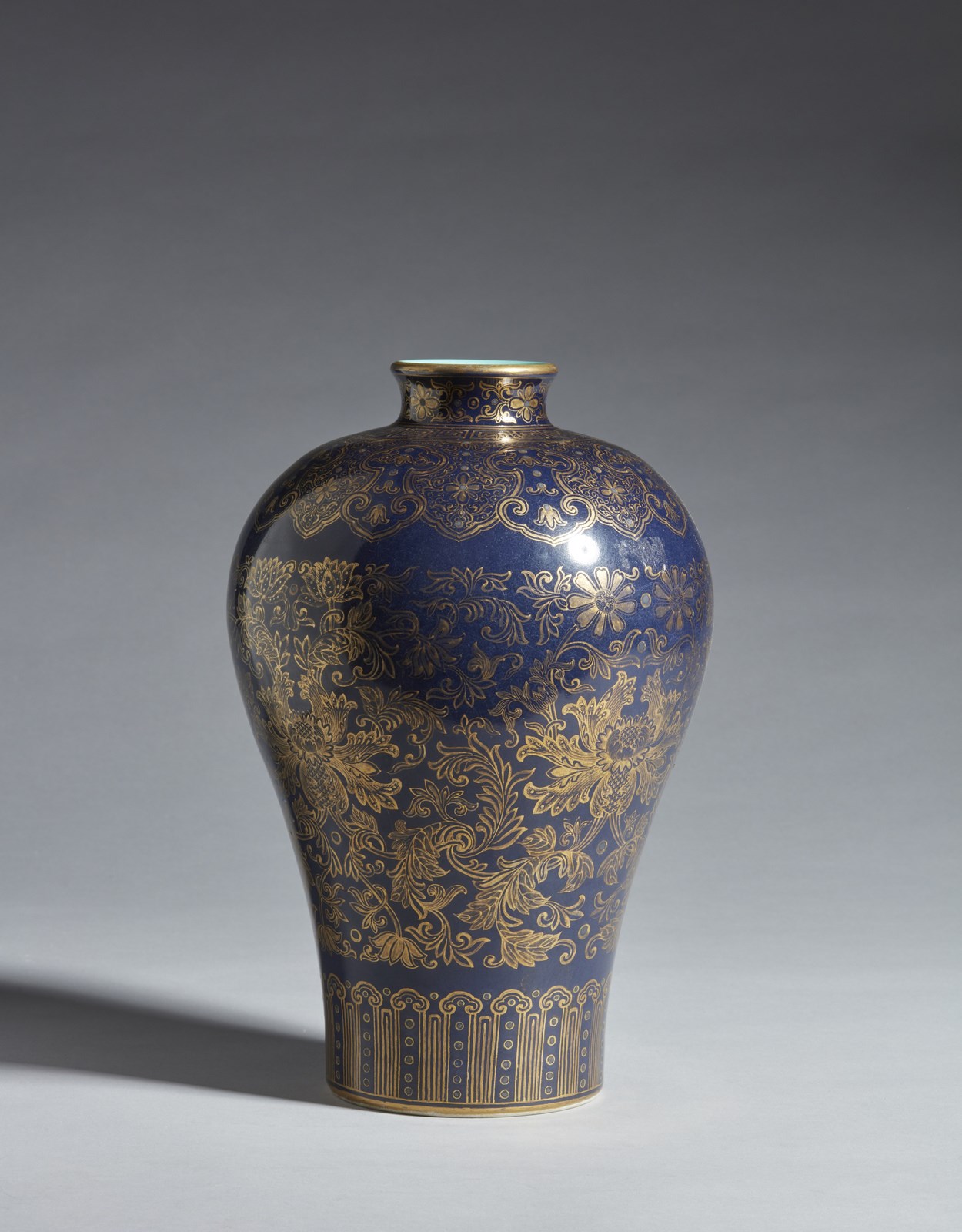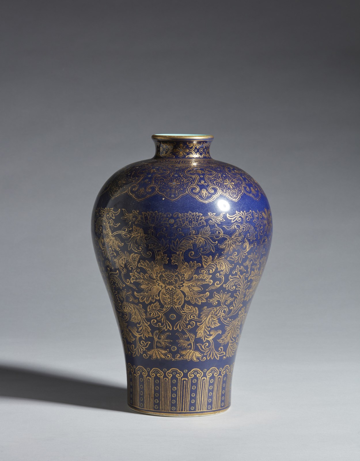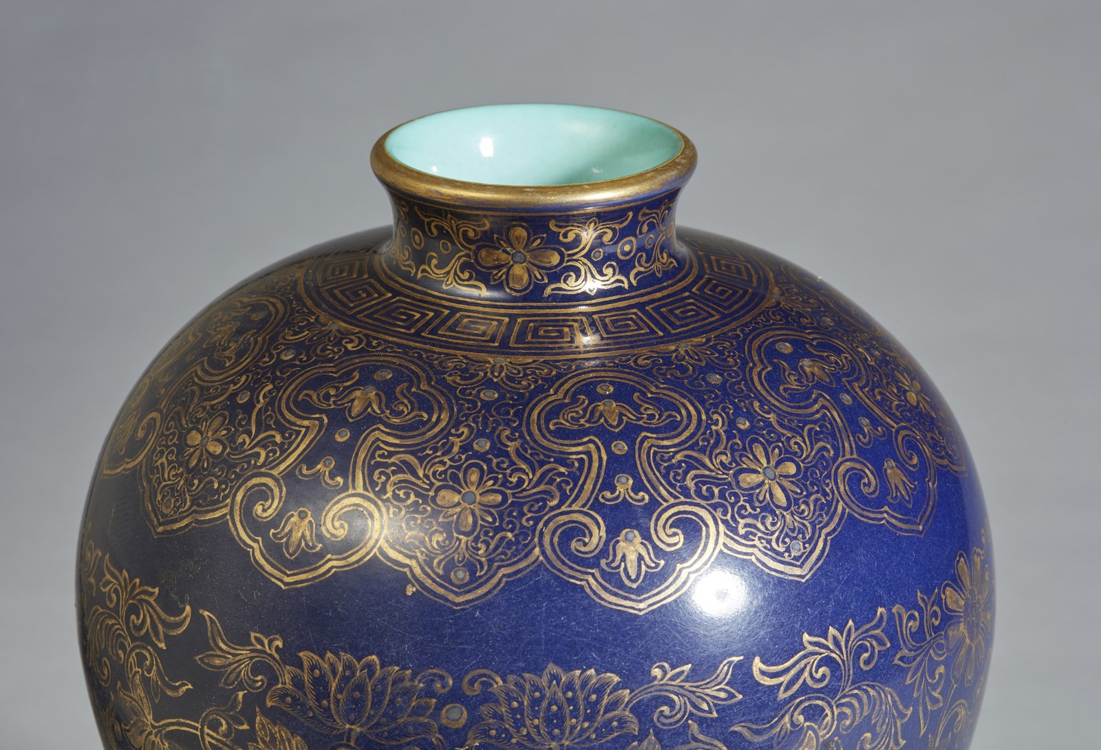 Arte Cinese - Meiping con decorazione dorata su sfondo blu Cina, XIX secolo .
