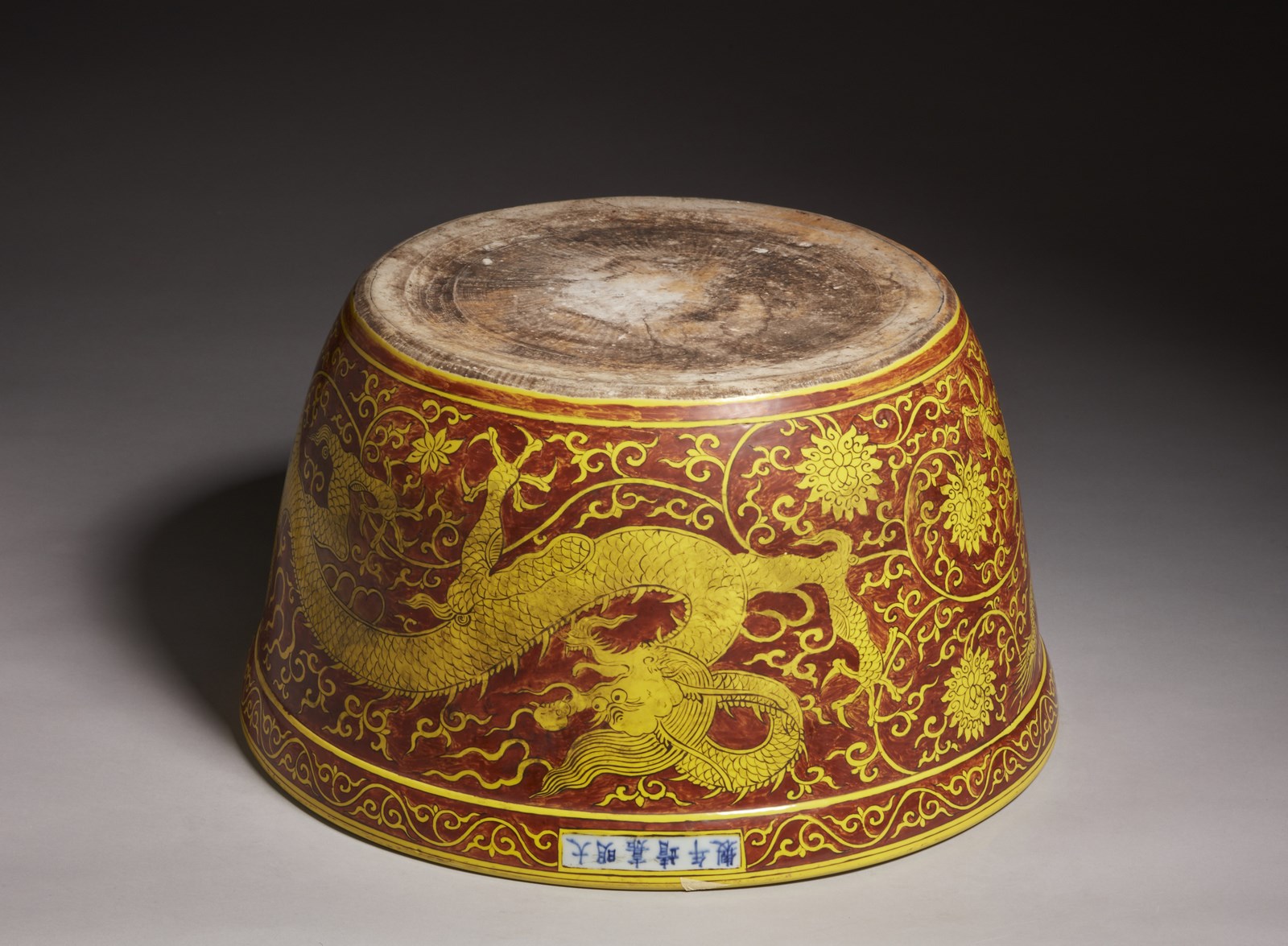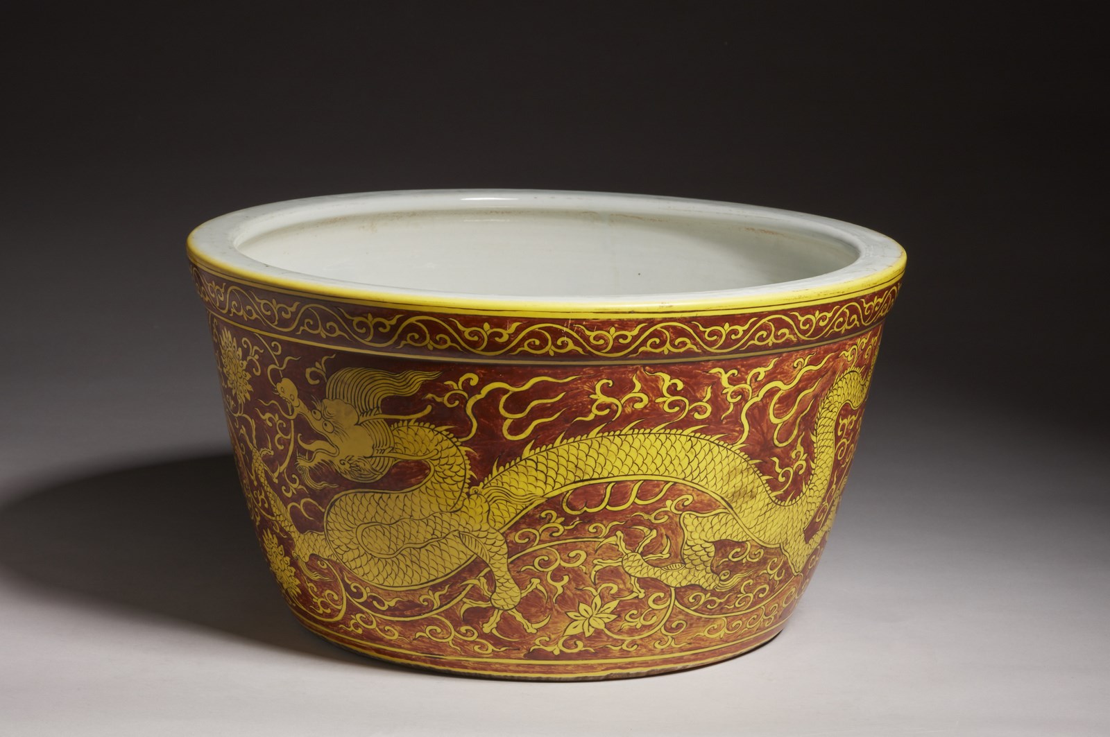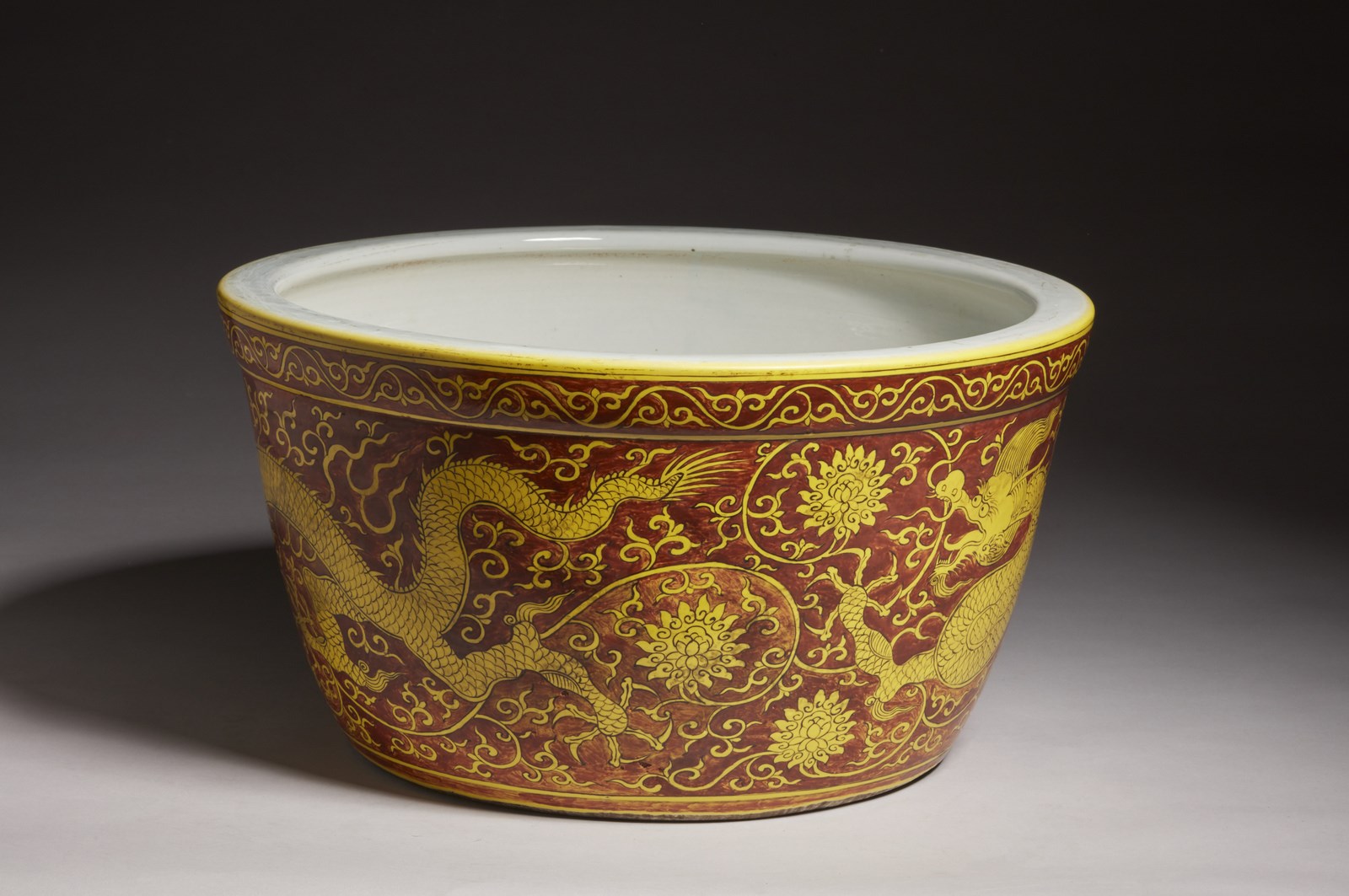 Arte Cinese - Vasca per pesci decorata con dragoni su sfondo rosso Cina, XX secolo .