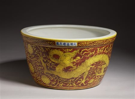 Cina, XX secolo . . Cm 47,00 x 25,00. A sezione circolare in porcellana a pasta spessa, decorata con dragoni alla ricerca della perla fiammeggiate su sfondo rosso. Marchio apocrifo Jiajing a sei caratteri entro cartiglio rettangolare sul bordo superiore.