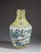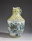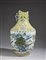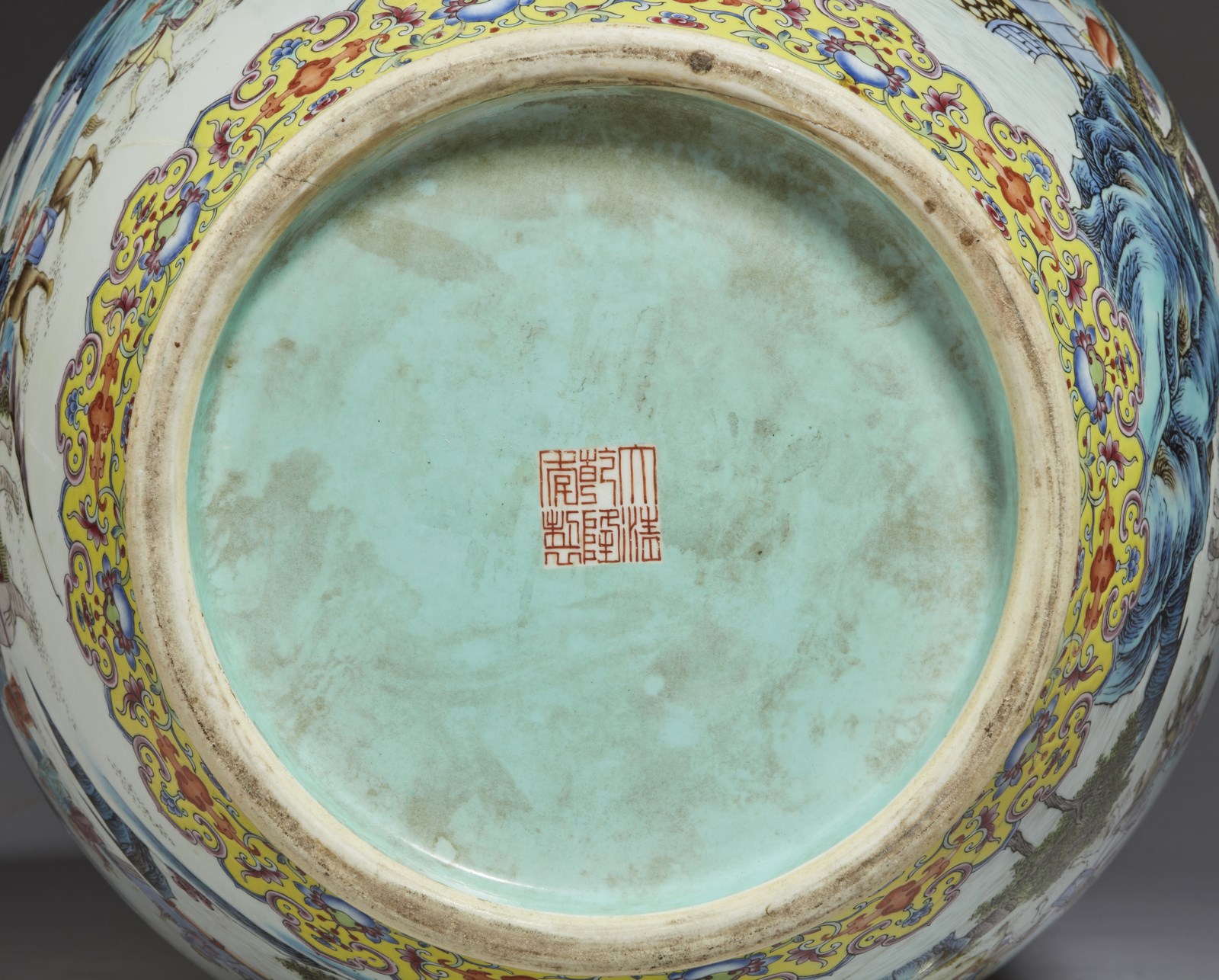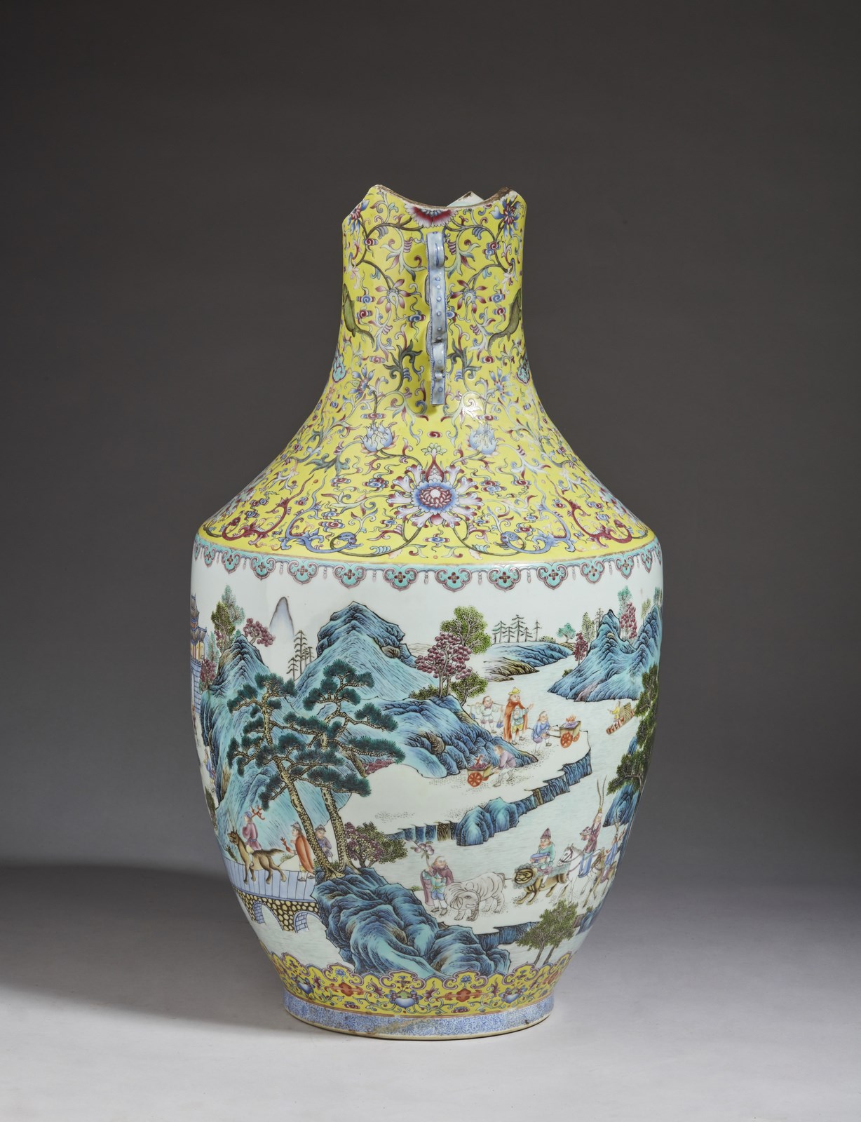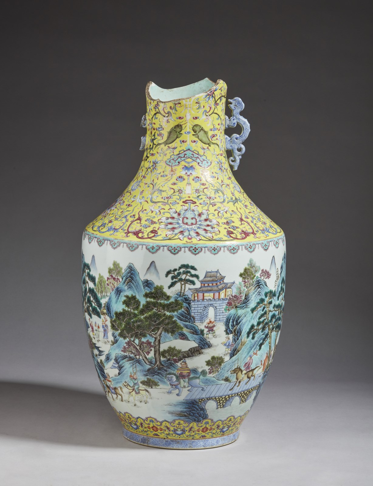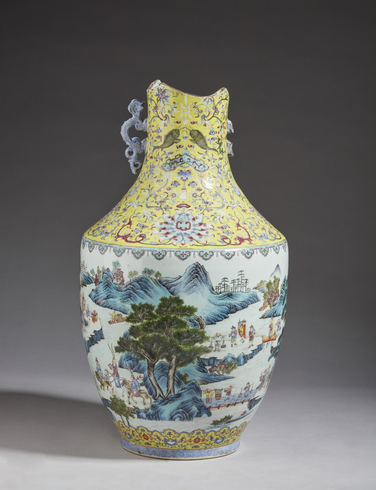 Cina, XX secolo . . Cm 67,50. Grande vaso in porcellana a pasta spessa, l'esterno finemente dipinto con paesaggio e simboli del buon auspicio su sfondo giallo sul collo. Marchio a sigillo a sei caratteri Qianlong sulla base.