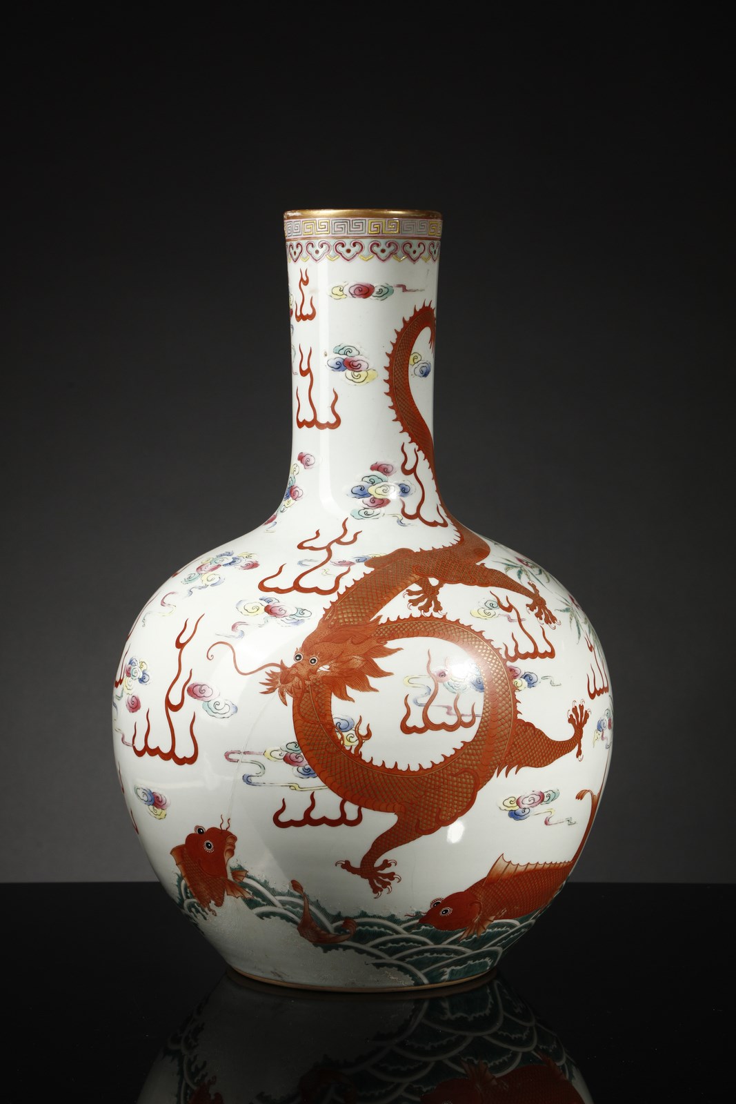 . . Cm 40,00 x 60,00. Grande vaso globulare in porcellana decorata a colori fencai e lumeggiature in oro con motivo di dragone tra onde e nuvole.