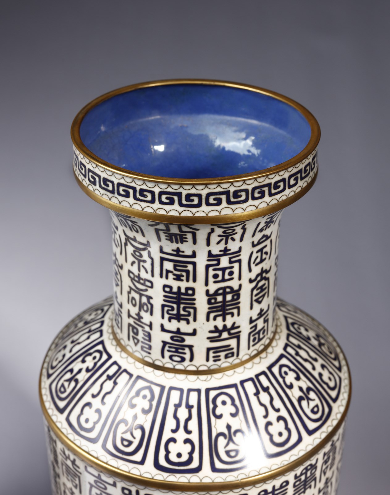 Cina, XIX secolo . . Cm 22,00 x 50,00. Vasi in metallo con corpo e collo quasi cilindrici, spalla spiovente e bocca dritta. L'esterno decorato a smalti cloisonnè con ideogrammi in carattere zhuanshu ripetuti su sfondo bianco.