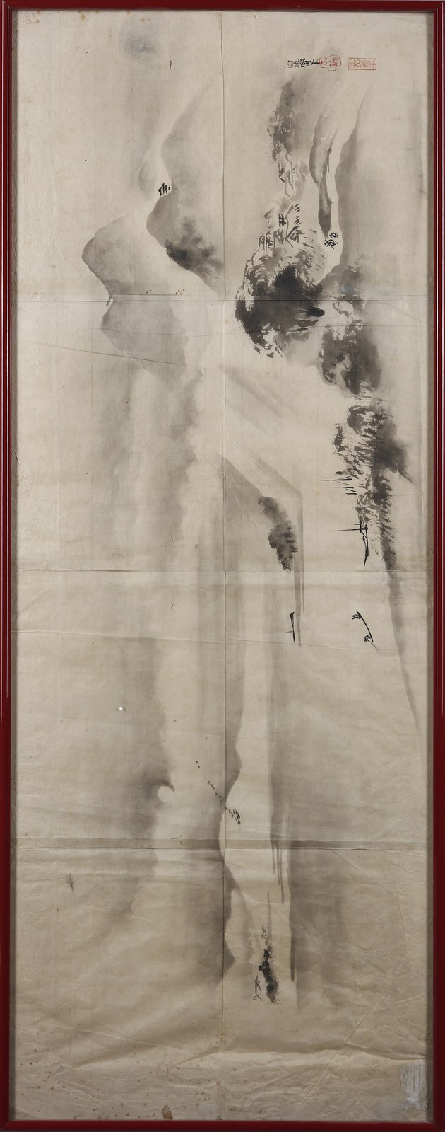 Cina, XX secolo . . Cm 108,00 x 39,00. Grande stampa raffigurante paesaggio lacustre. Timbri ed iscrizioni in basso a destra.