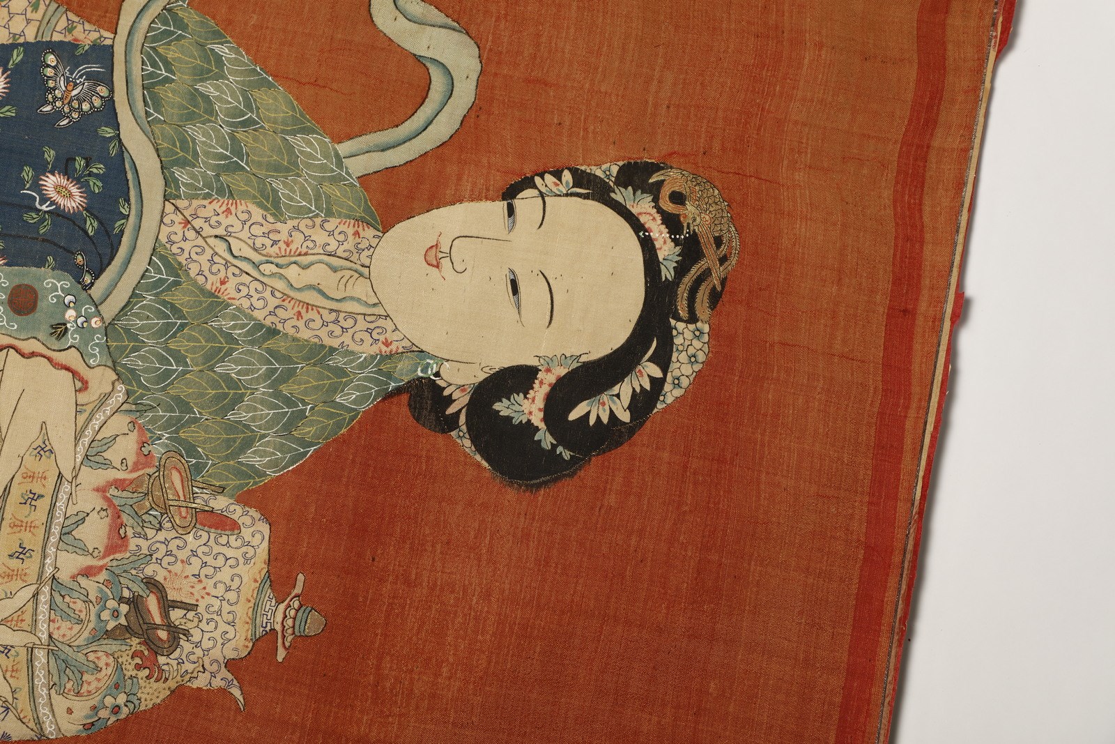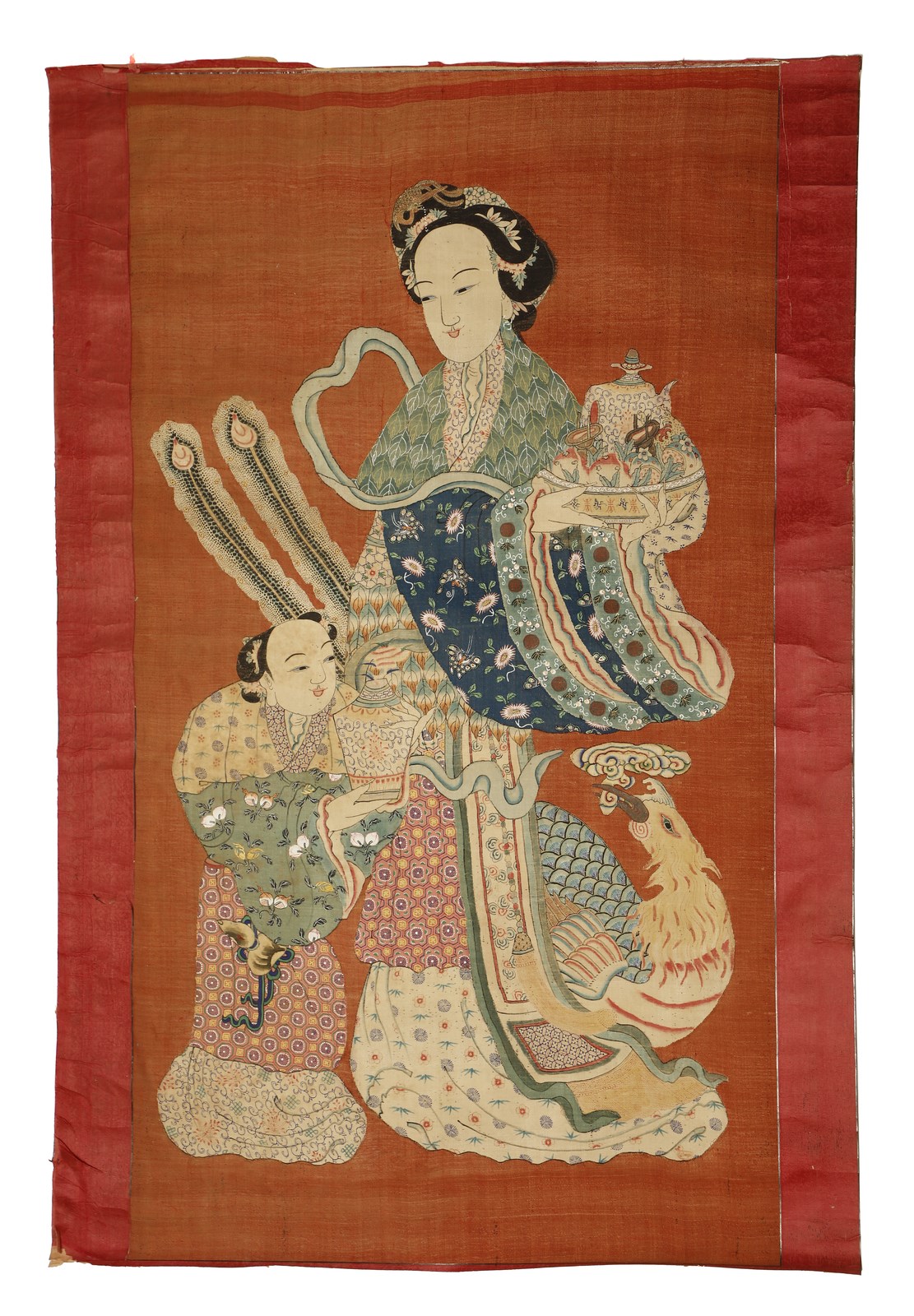 Cina, Qing, sec. XVIII. . Cm 111,00 x 157,00. Dipinto a tempera su seta raffigurante una dama riccamente abbigliata con bimbo e fenice.