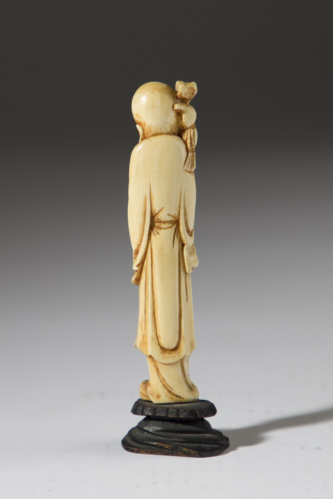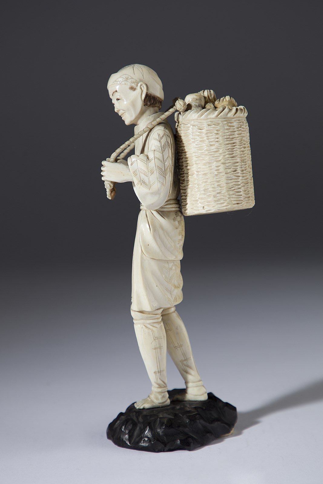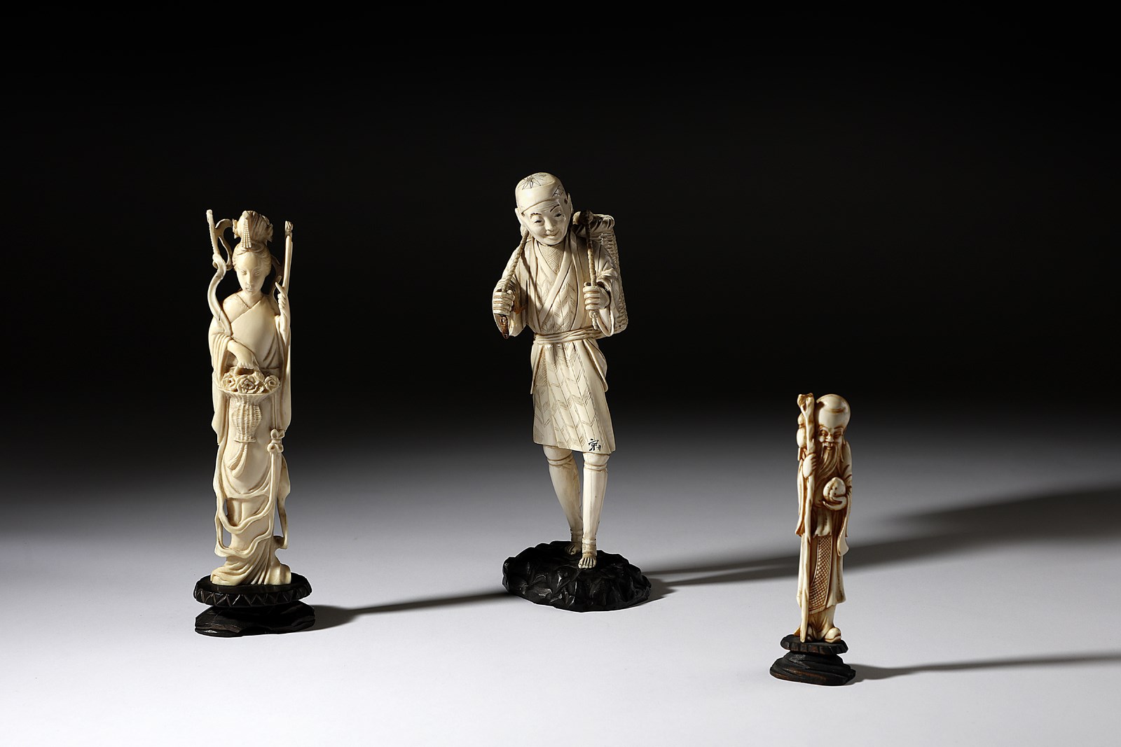 Cina e Giappone, inizio XX secolo . . Cm 32,00. Include: un okimono raffigurante un contadino; una figura di una dama con cesto in mano ed una figura di Shulao con i suoi classici attributi.