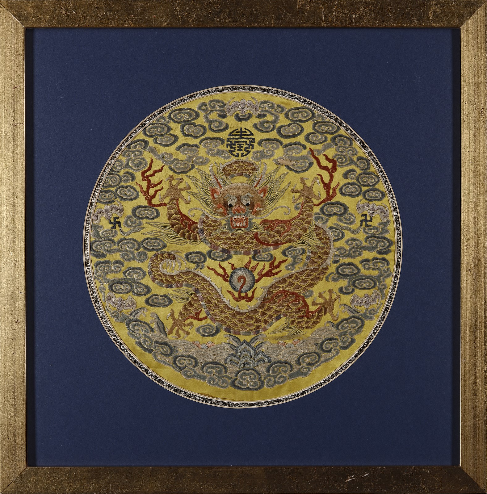 Arte Cinese - Badge ricamato con dragone su sfondo giallo Cina, XVIII secolo .