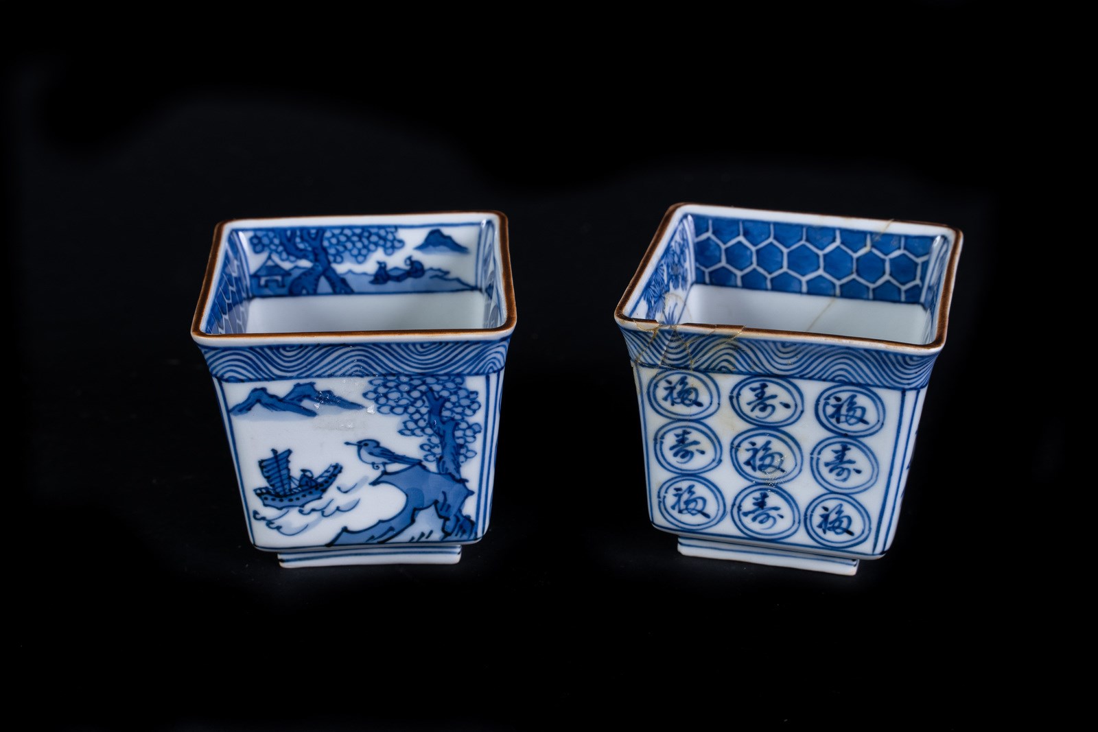 ARTE GIAPPONESE Coppia di coppe quadrangolari bianco blu di manifattura Arita