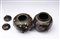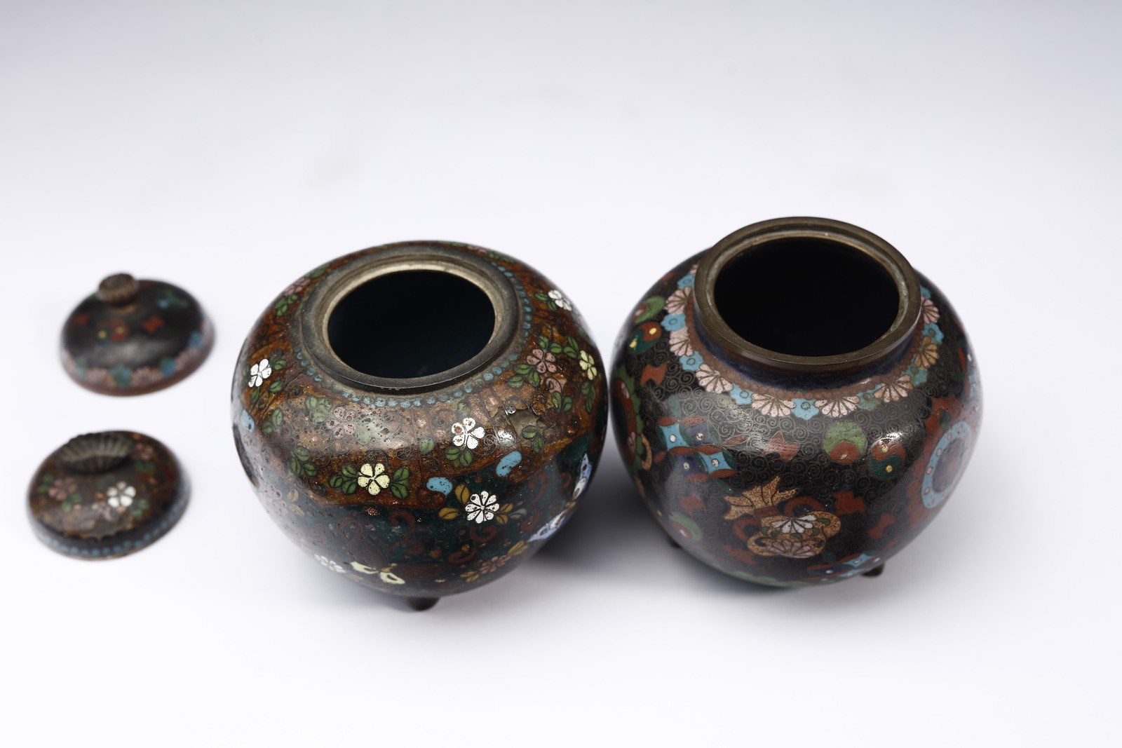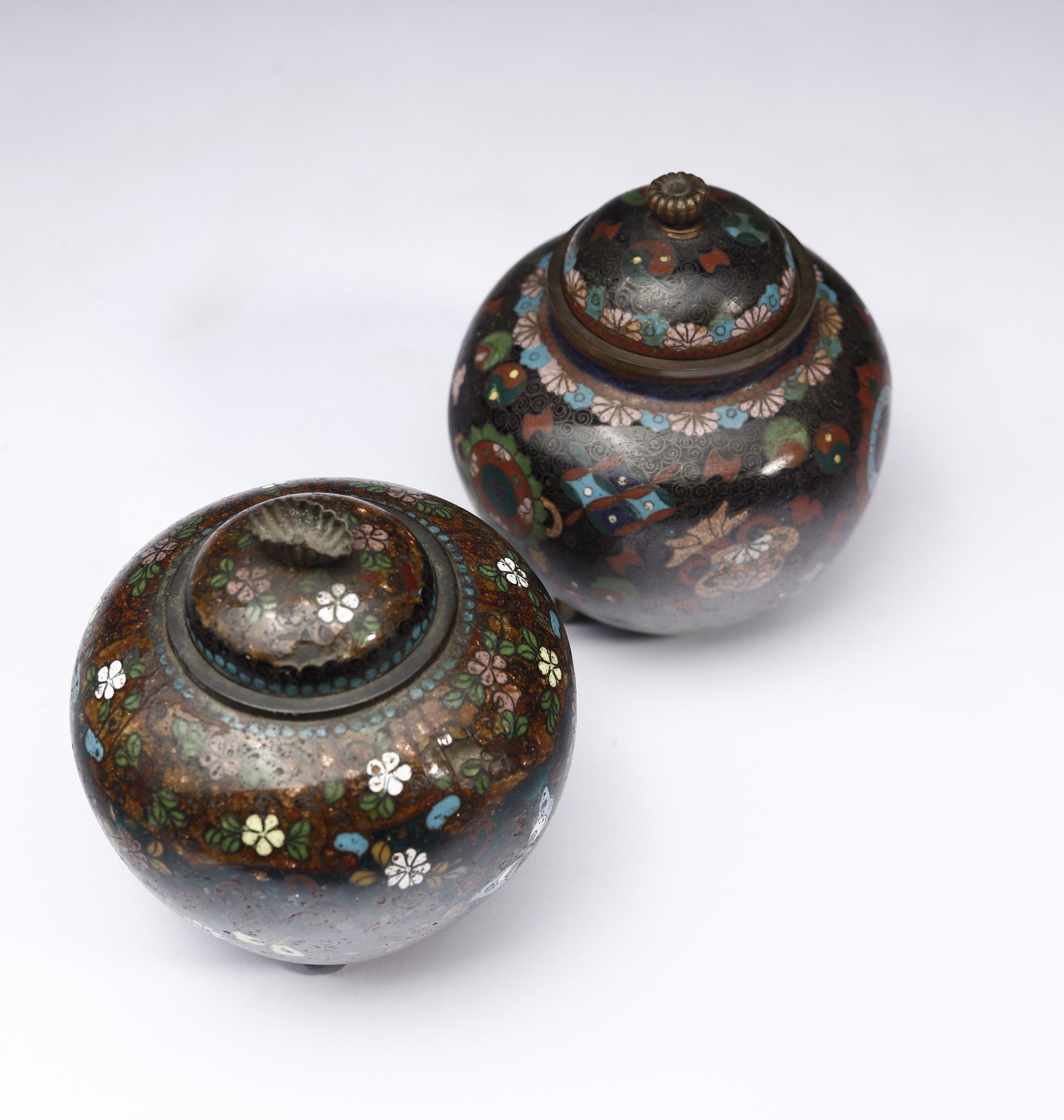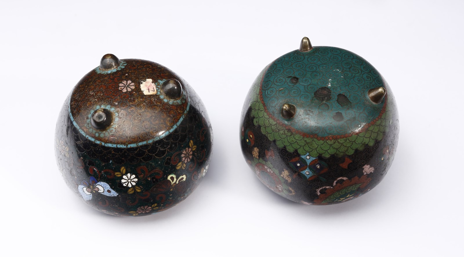 Giappone, periodo Meiji, XIX secolo. . Cm 9,00 x 11,00. Di diversa forma, una presenta corpo globulare poggiante su tre piedi semisferici, l'altra con corpo esagonale stondato, poggiante su tre piedi conici. Entrambe in metallo smaltato decorato con fiori e farfalle su sfondo scuro.