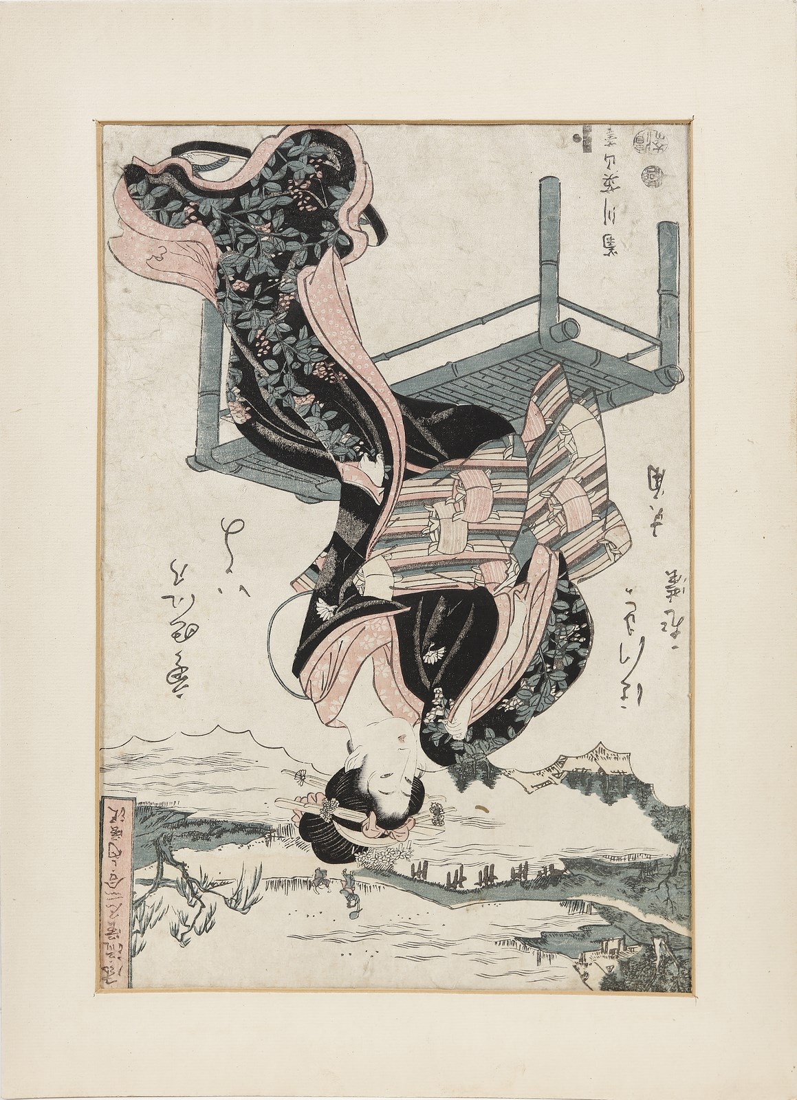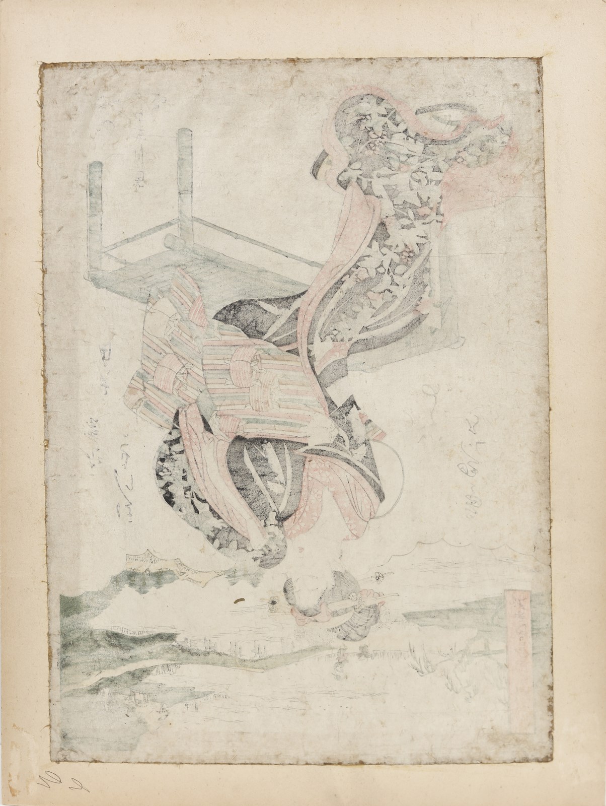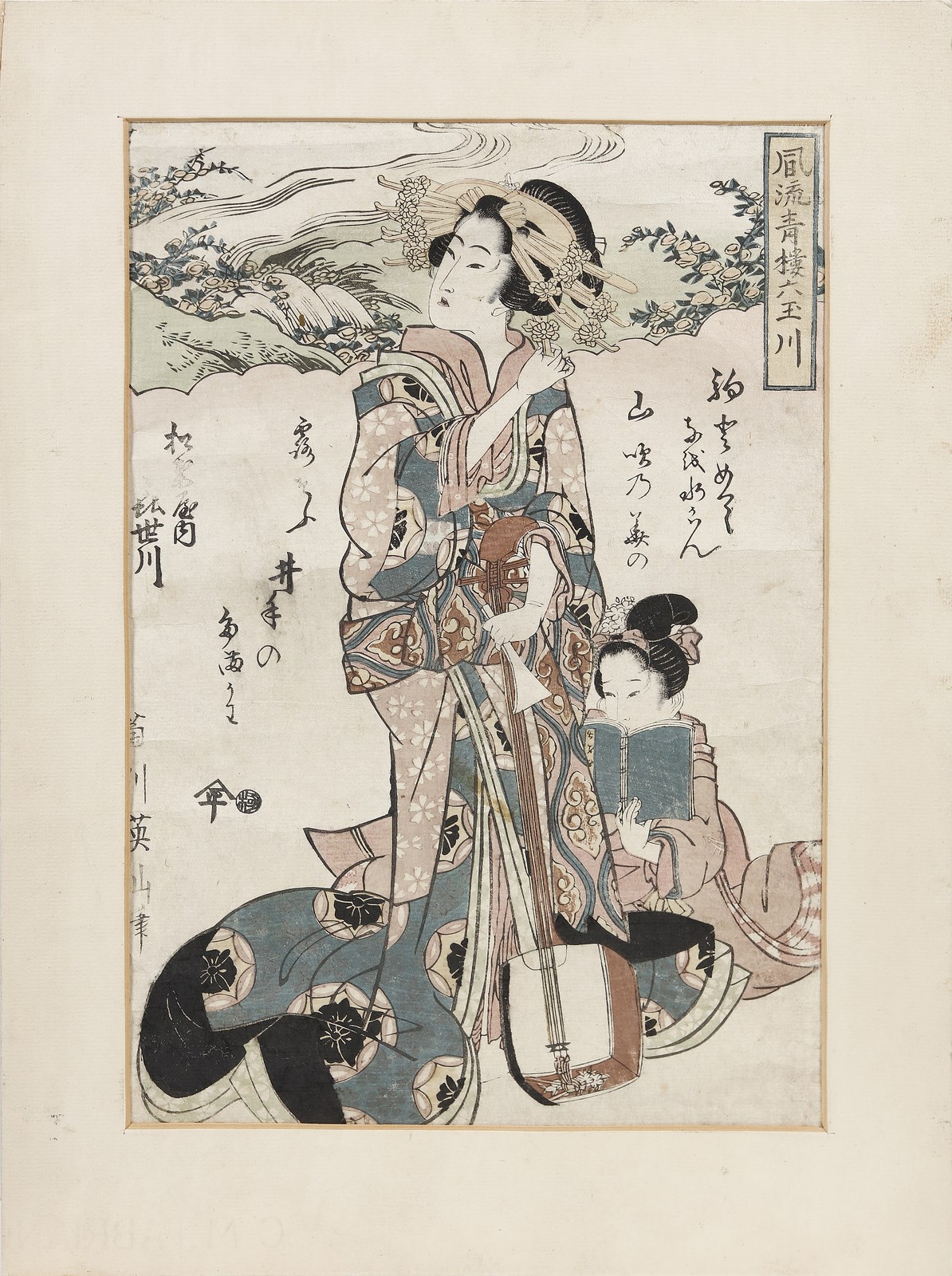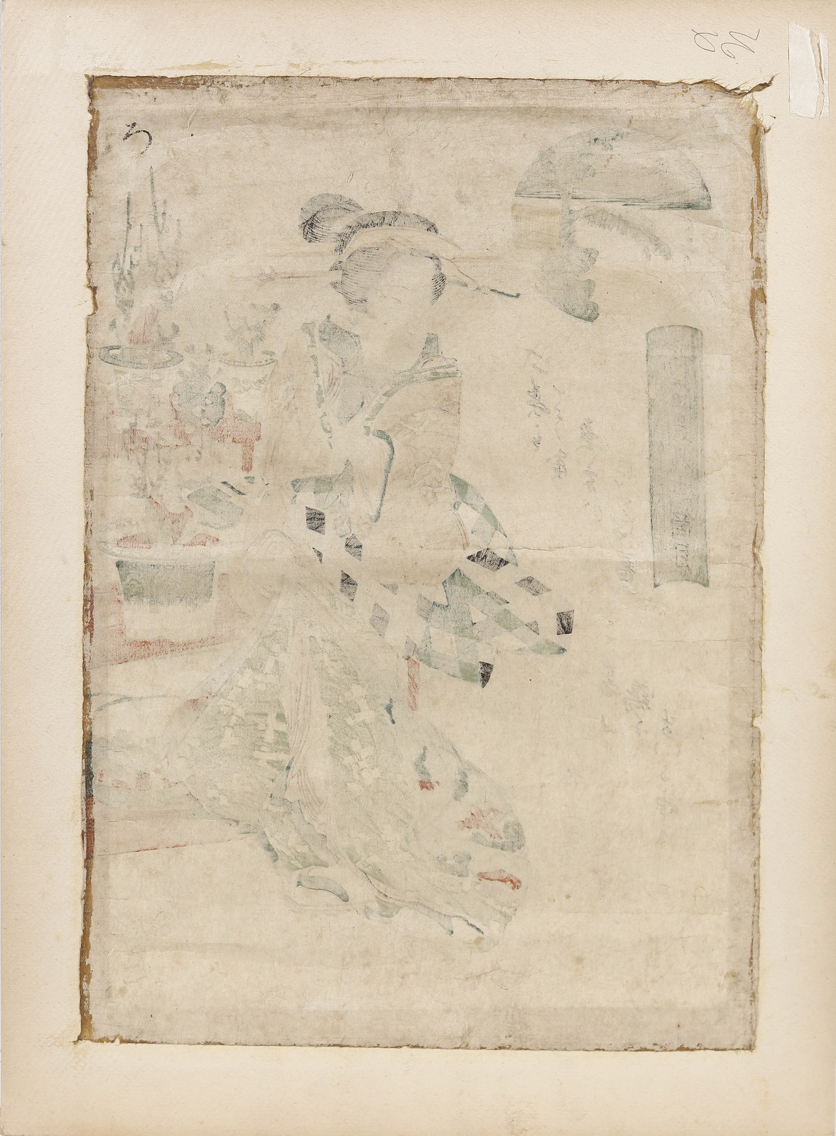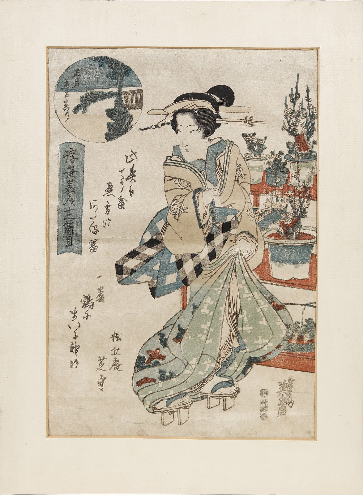 Giappone, inizi XIX secolo. . Cm 23,50 x 35,50. Gruppo di raffinate stampe colorate raffiguranti dama tra iscrizioni.