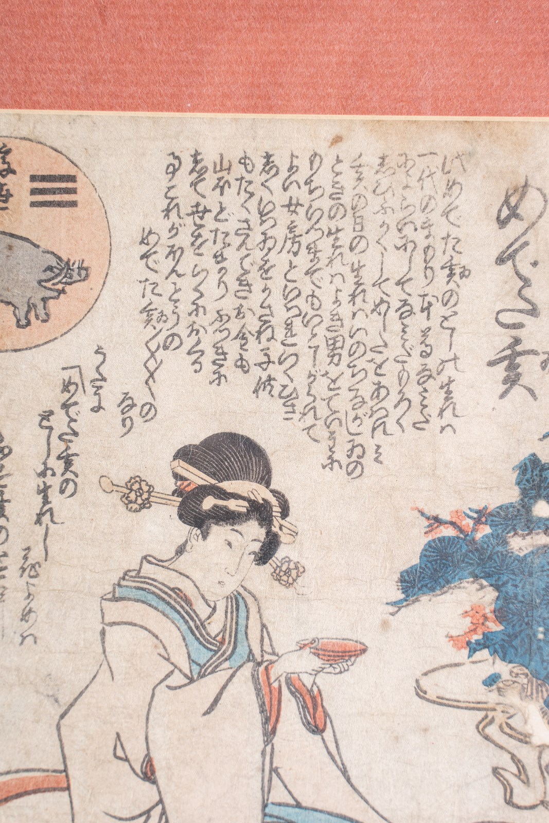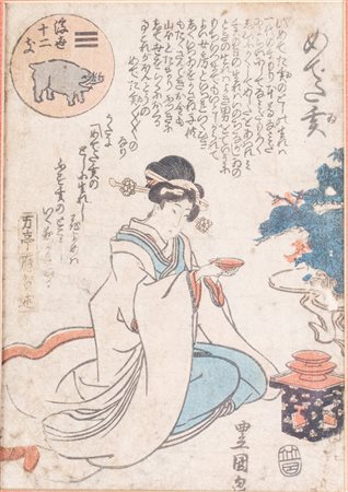 Toyokuni II (1777 - 1835) - Toyokuni II (1777-1835) Stampa Ukiyo-e raffigurante una cortigiana e lunga iscrizione Giappone, XVIII-XIX secolo.
