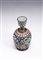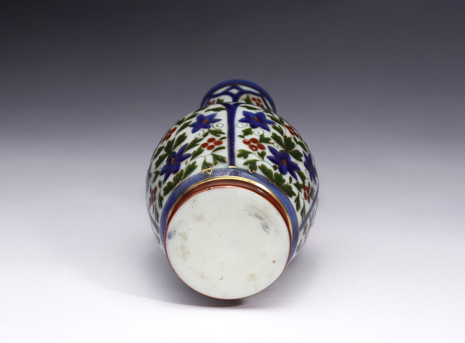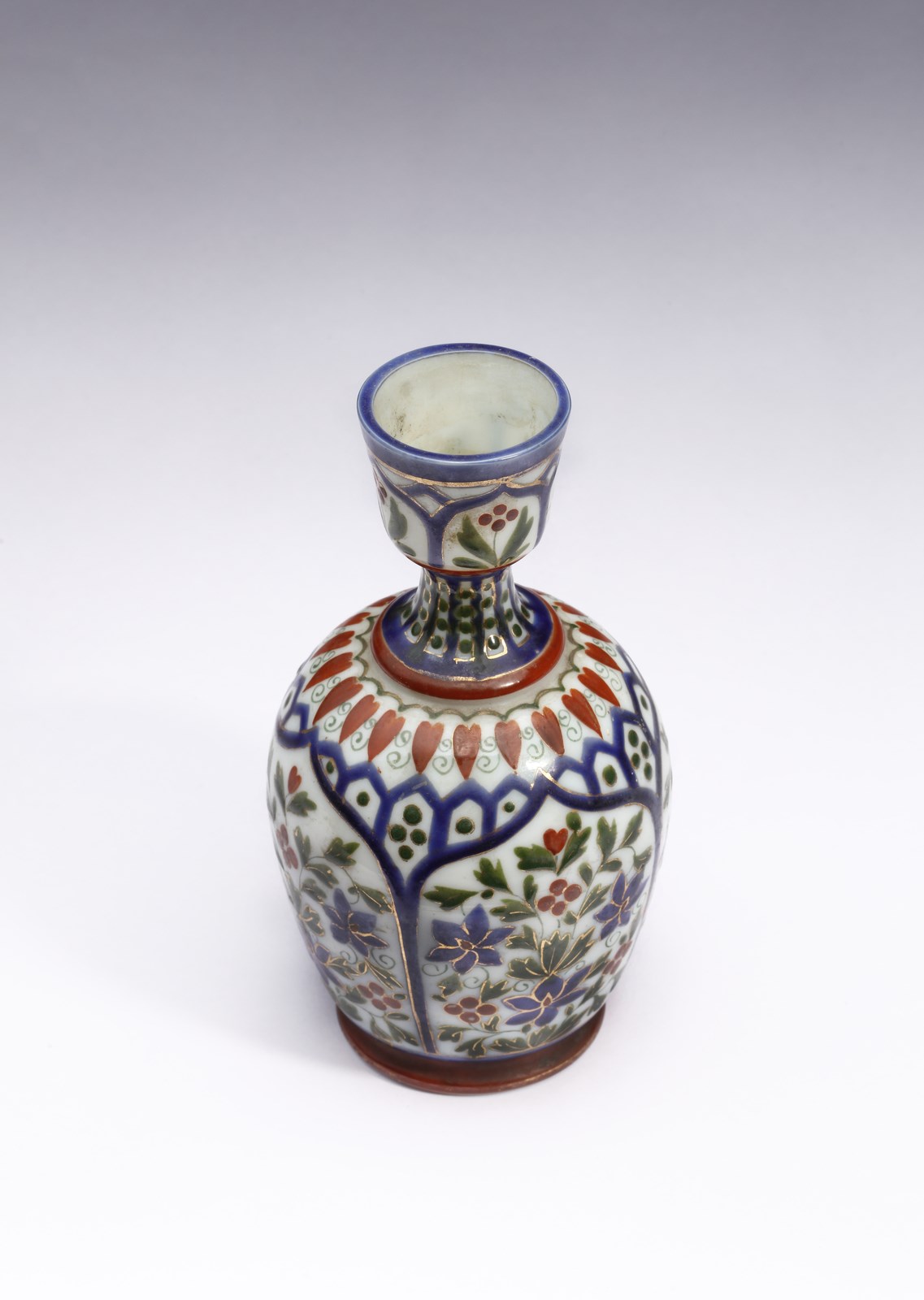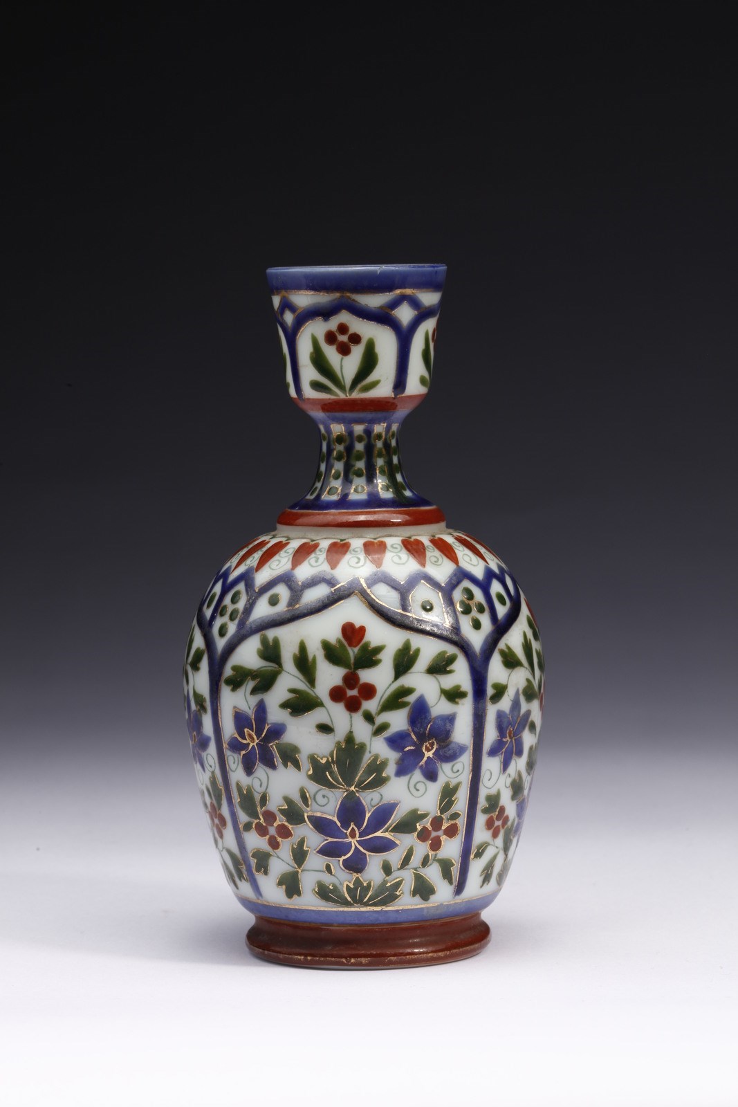 India, XIX secolo . . Cm 14,50. Bottiglia porta profumi in vetro opalino smaltato con riserve a cuspide contenenti fiori variopinti con finiture in oro. La forma derivante dalla toreutica medievale, mentre la decorazione è tipicamente ad imitazione degli smalti policromi comunemente intarsiati con pietre preziose.