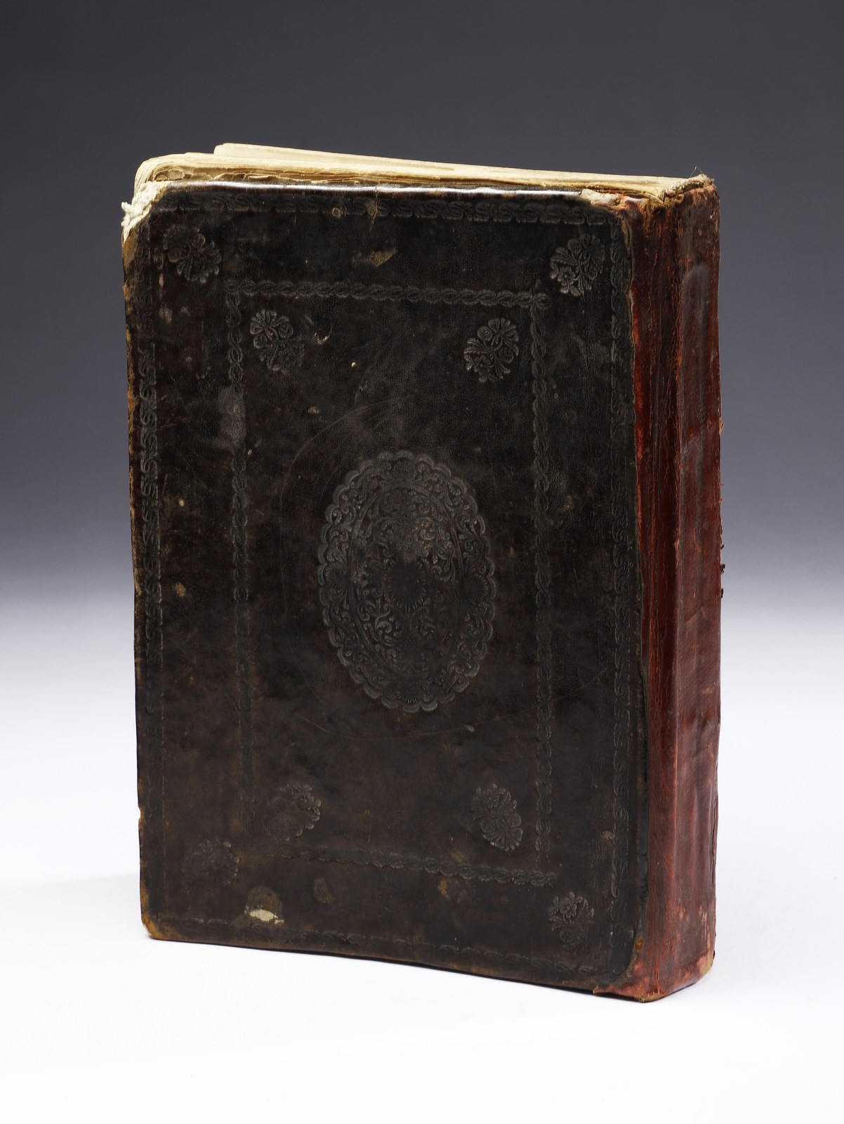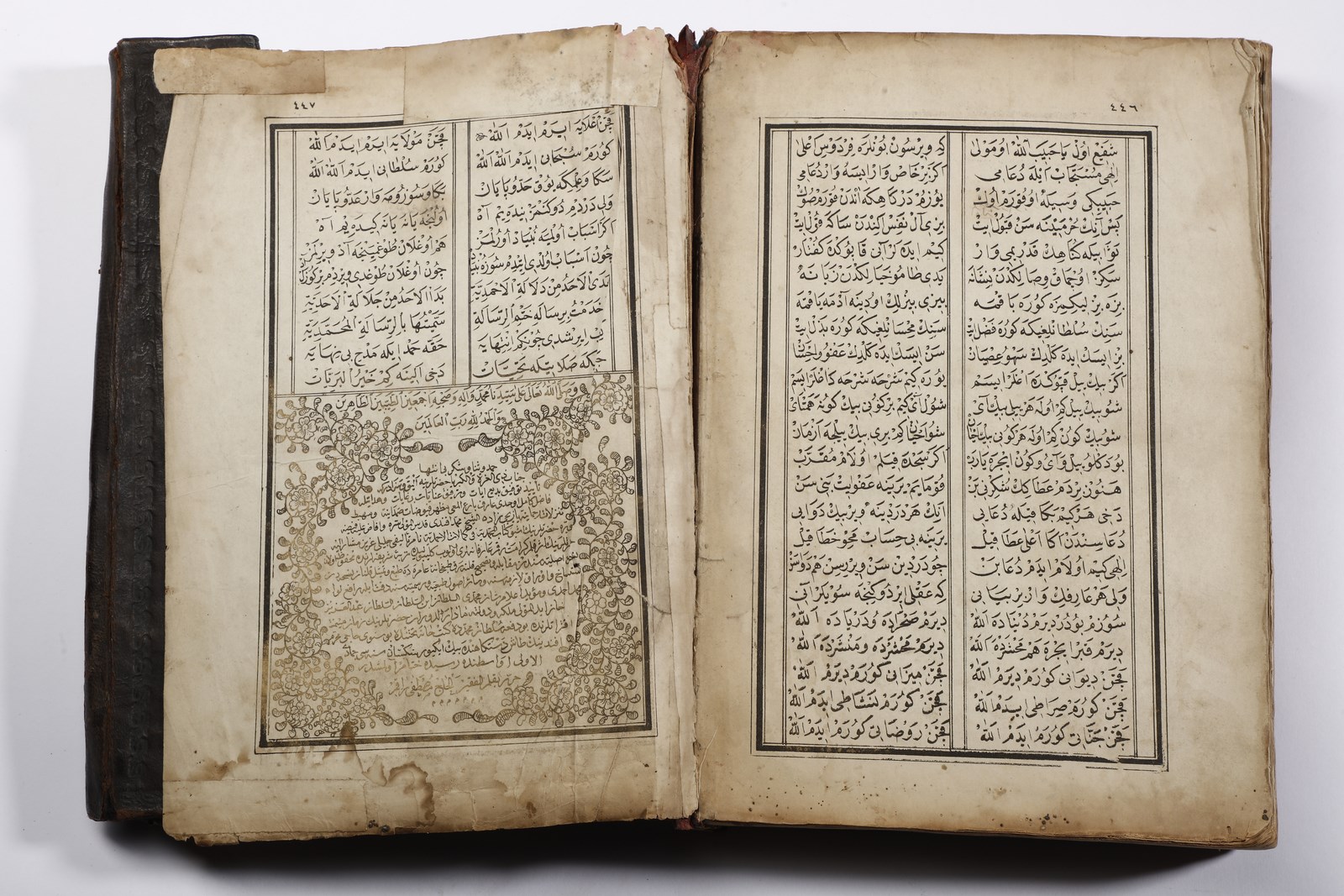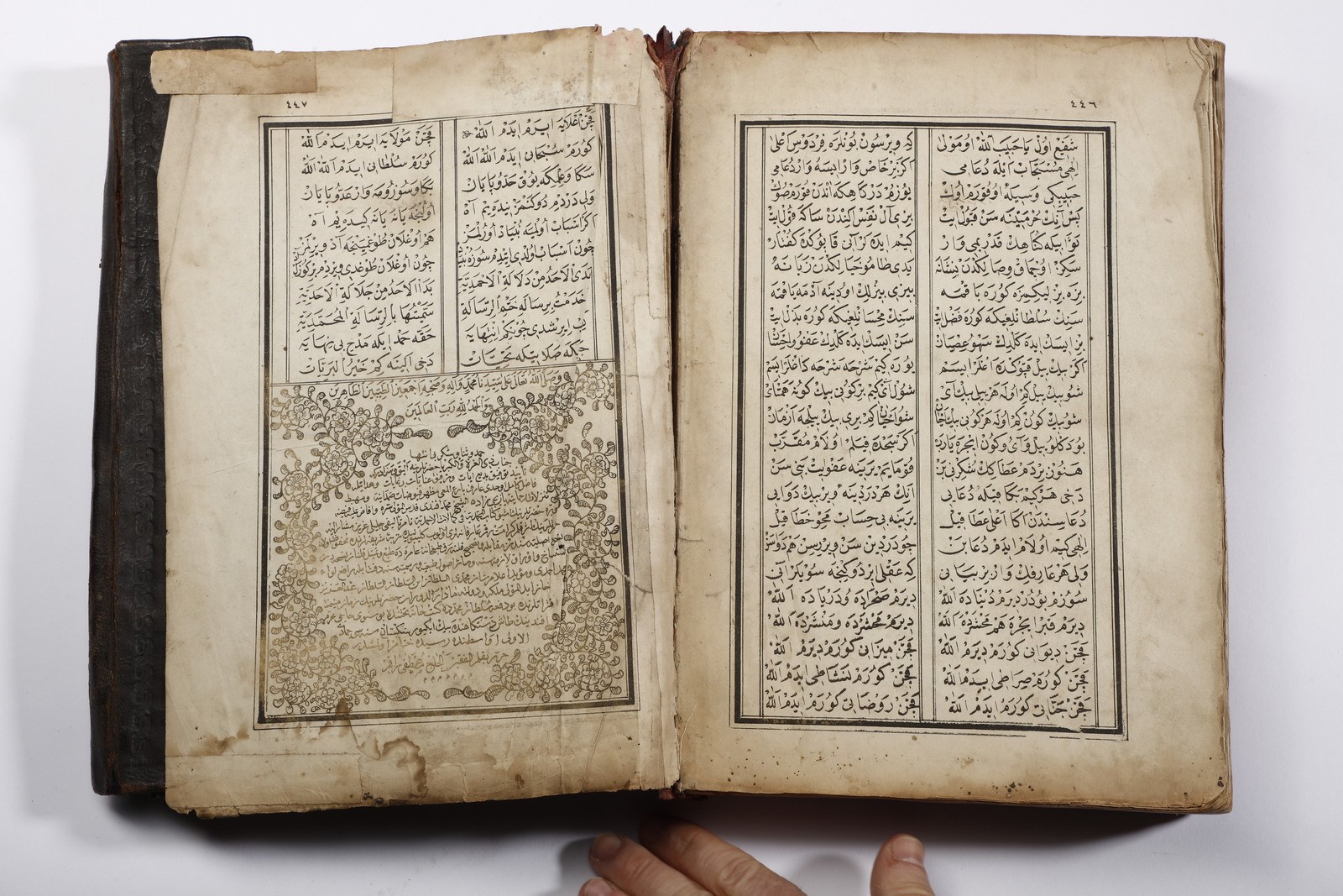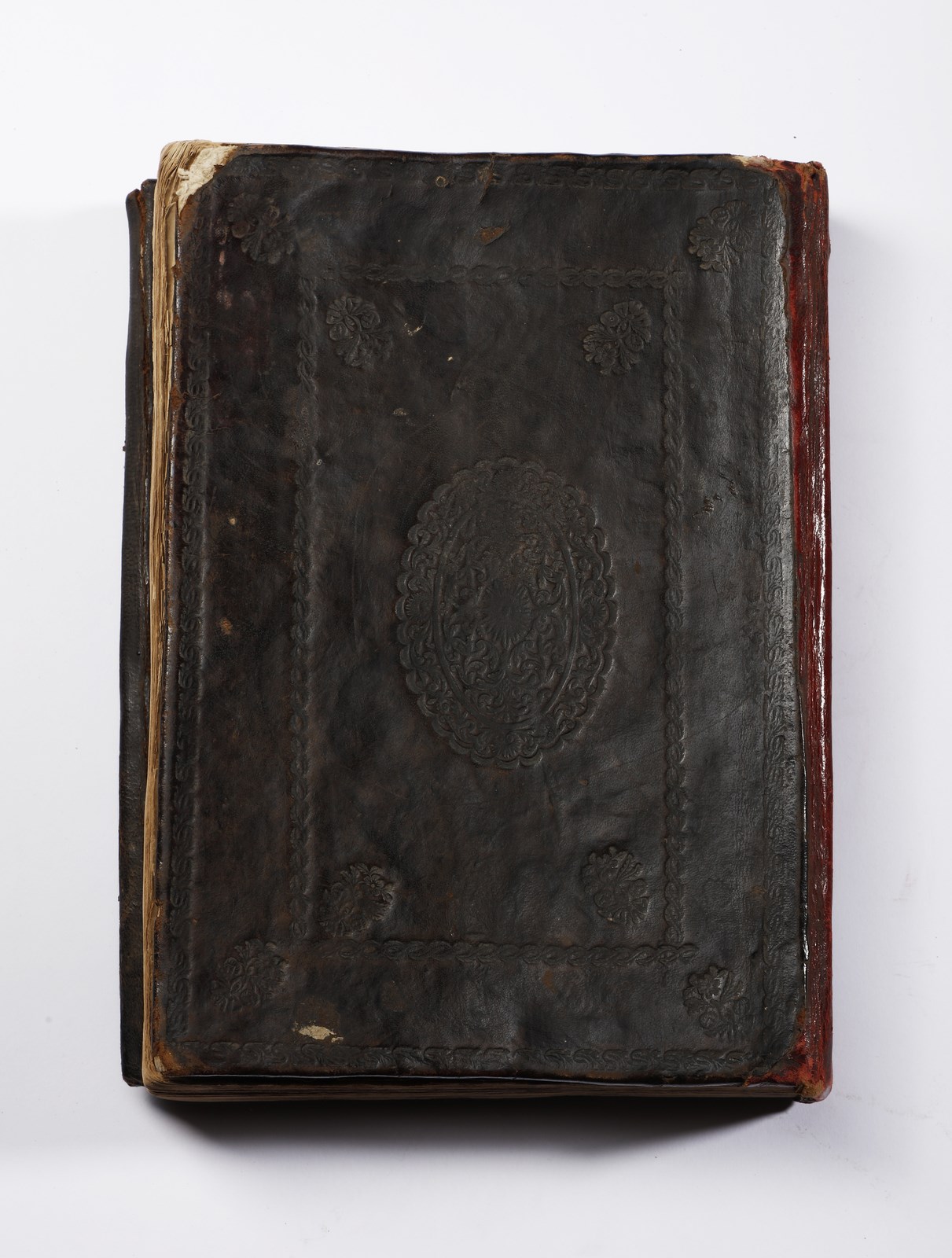 XX secolo . . Cm 20,00 x 26,50 x 4,40. Testo devozionale in arabo su carta entro rilegatura ricoperta in pelle bruna ed impressa con medaglione floreale centrale.